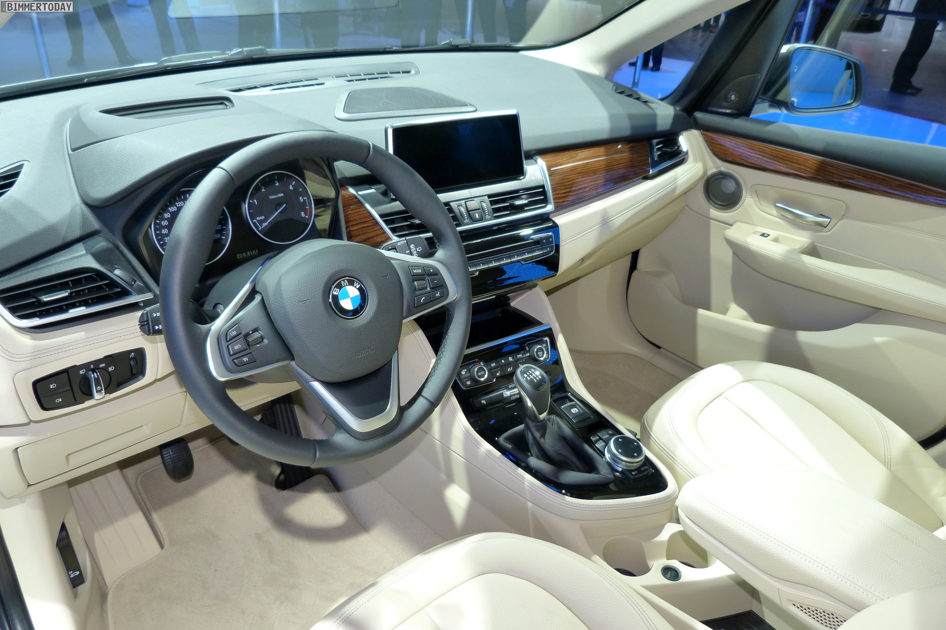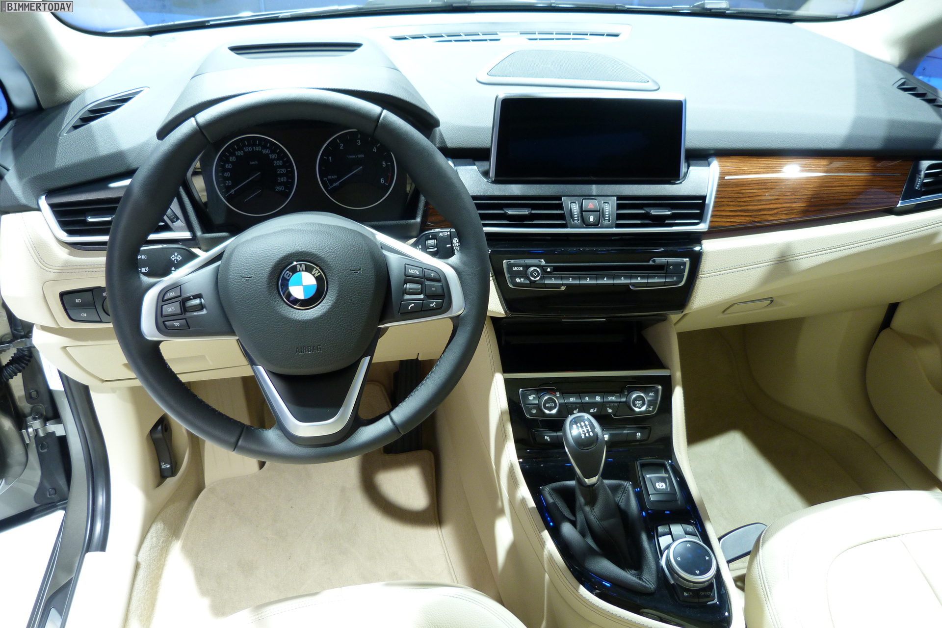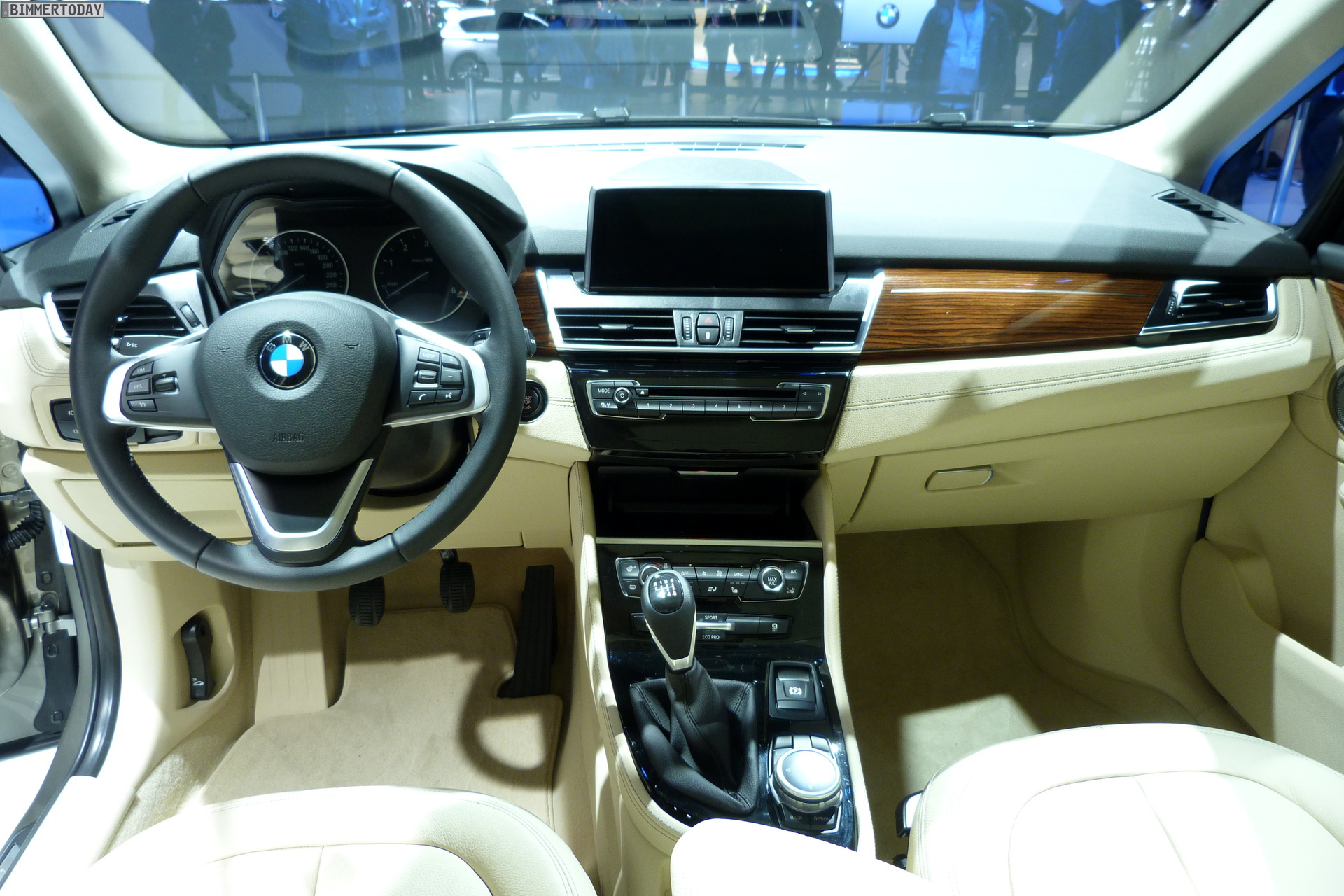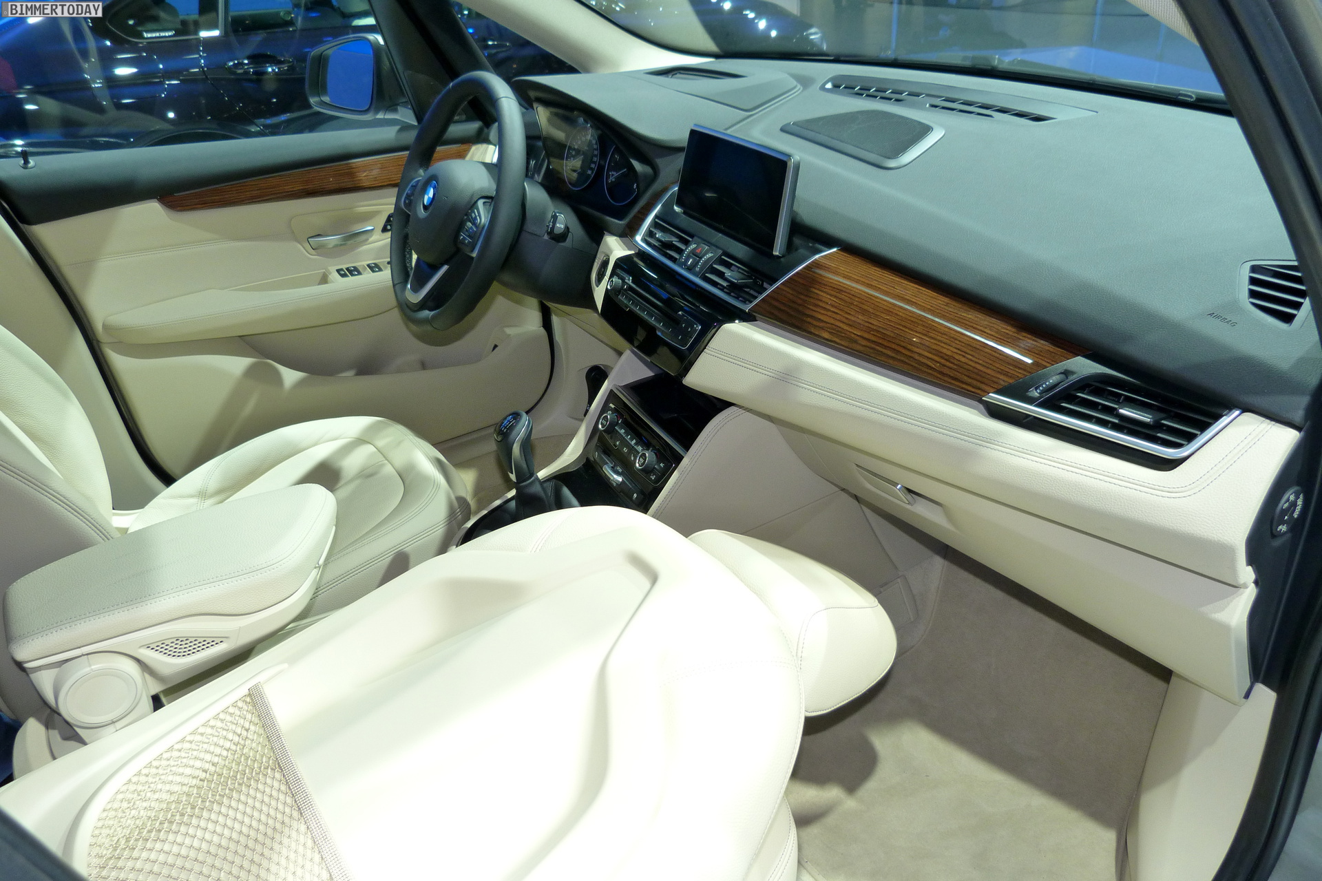 Das Armaturenbrett des BMW 2er Active Tourer bietet deutlich weniger Fahrerorientierung als beim Concept Car, soll aber höchste Verarbeitungsqualität und hochwertige Materialien kombinieren. Bereits zum Marktstart stehen die Ausstattungslinien Sport Line und Luxury Line zur Wahl, um Interieur und Exterieur den eigenen Vorlieben anzupassen.
