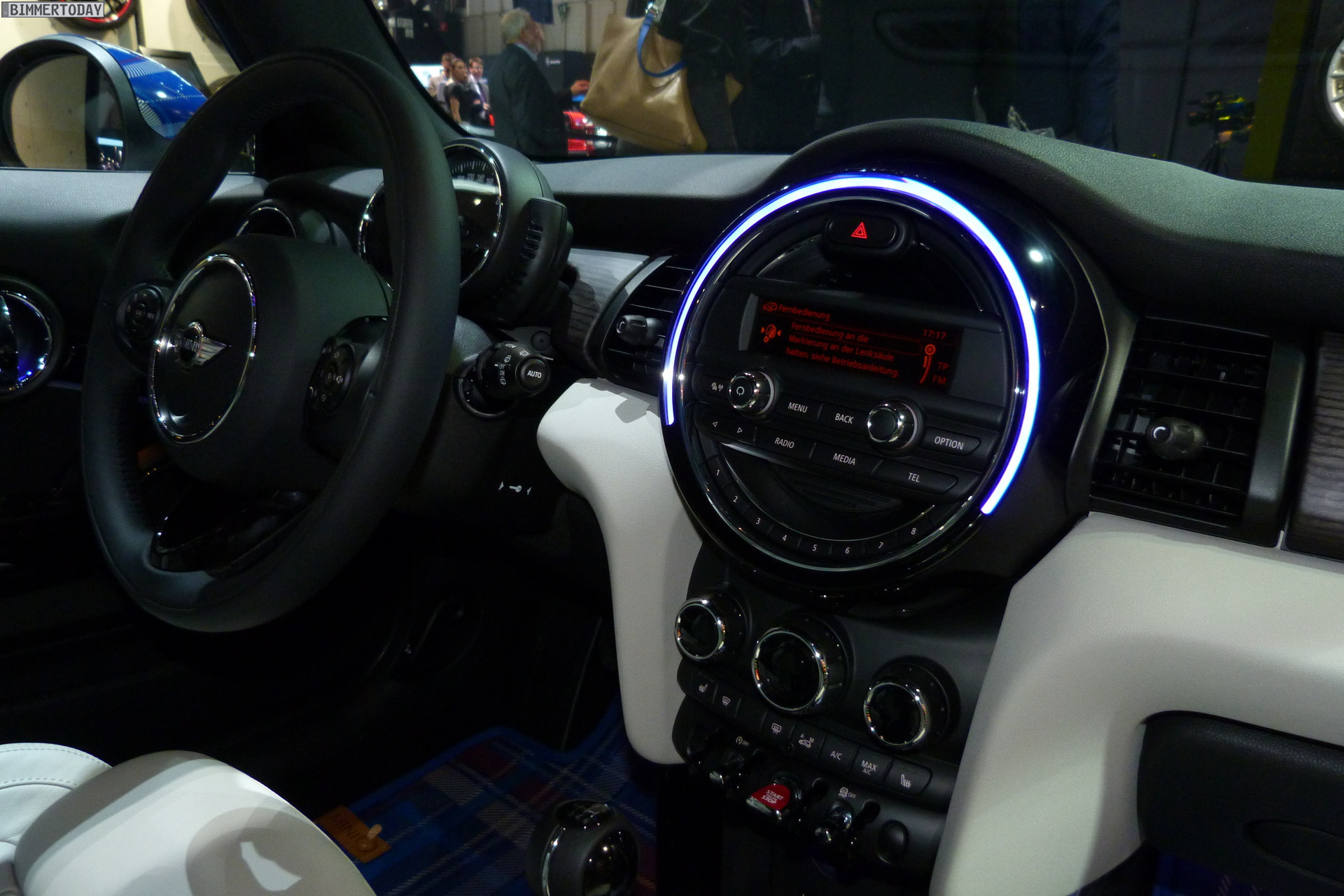 Der umfangreich mit Zubehör versehene MINI Cooper D ist in der Farbe White Silver Metallic lackiert und trägt auch große 18 Zoll-Kreuzspeiche-Felgen. Auch im Innenraum spielt das blaue Karo-Muster eine zentrale Rolle, konsequent bis zum Maximum wurde das Ausstellungsfahrzeug aber dann doch nicht hochgerüstet – was uns einen Blick auf das “kleine” Radio-System gewährt, denn das große Infotainment-Display für Navigation & Co. sucht man in diesem MINI vergebens: