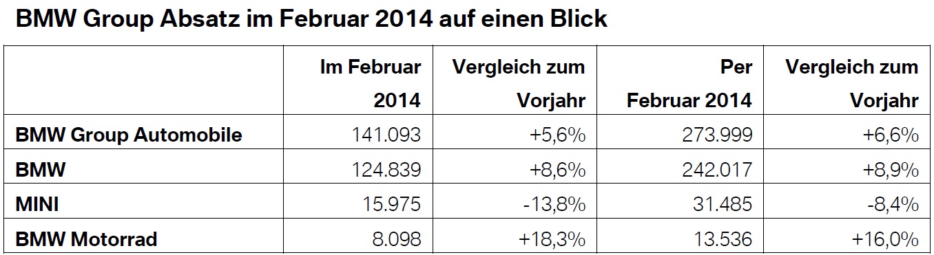 Hauptverantwortlich für das Wachstum im Februar ist die Kernmarke BMW, denn mit 124.839 Einheiten wurde der Vorjahresmonat um deutliche 8,6 Prozent überboten. Die Marke MINI musste im Monat vor dem Modellwechsel bei der Kern-Baureihe einen kaum überraschenden Rückgang um 13,8 Prozent auf 15.975 Einheiten hinnehmen. In den ersten beiden Monaten zusammen beträgt die Steigerung bei BMW 8,9 Prozent, MINI liegt 8,4 Prozent unter dem Vorjahreszeitraum.