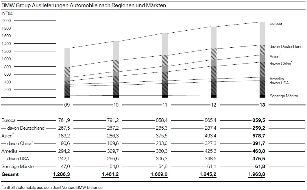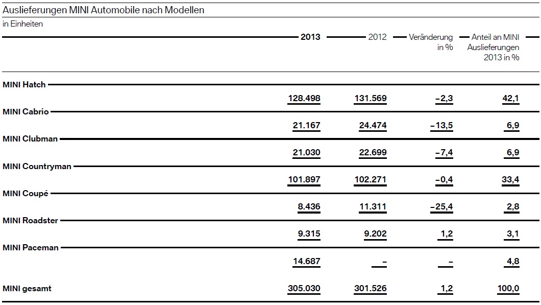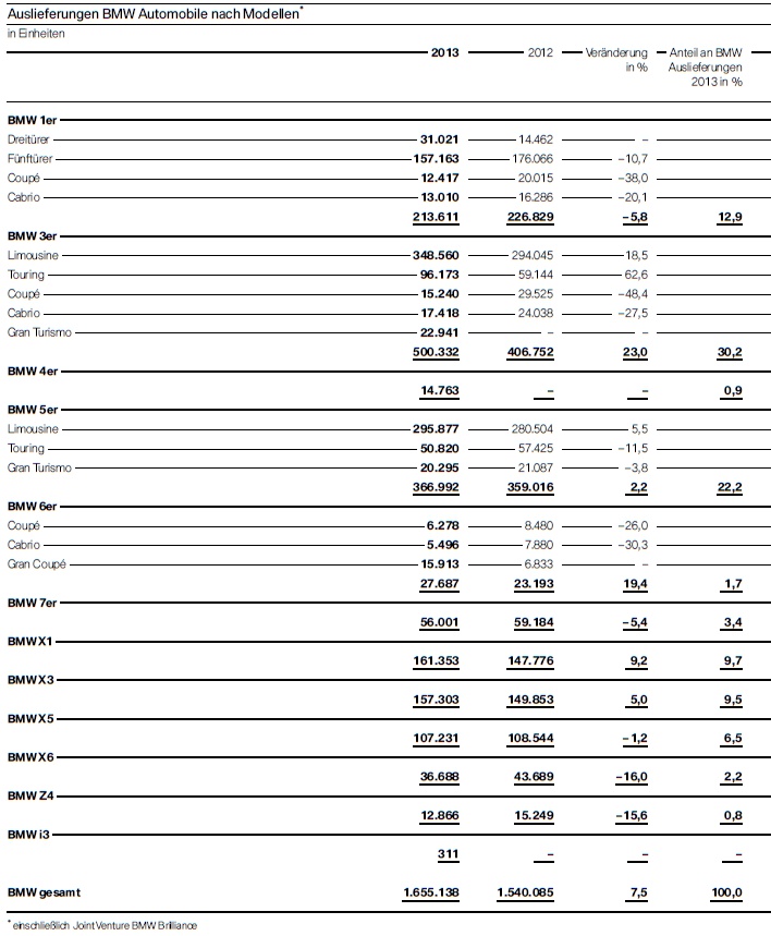 Die wichtigsten Statistiken zum Geschäftsjahr 2013 können den folgenden Tabellen entnommen werden, besonders interessant ist dabei wie immer ein Blick auf die Verkaufszahlen nach einzelnen Modellen und Baureihen. Unter anderem lässt sich erkennen, wie groß die Anteile der einelnen Karosserievarianten an den Verkaufszahlen sind – wobei beispielsweise das viertürige BMW 6er Gran Coupé längst die Spitzenposition innerhalb der 6er-Reihe übernommen hat und für über die Hälfte aller verkauften 6er steht.