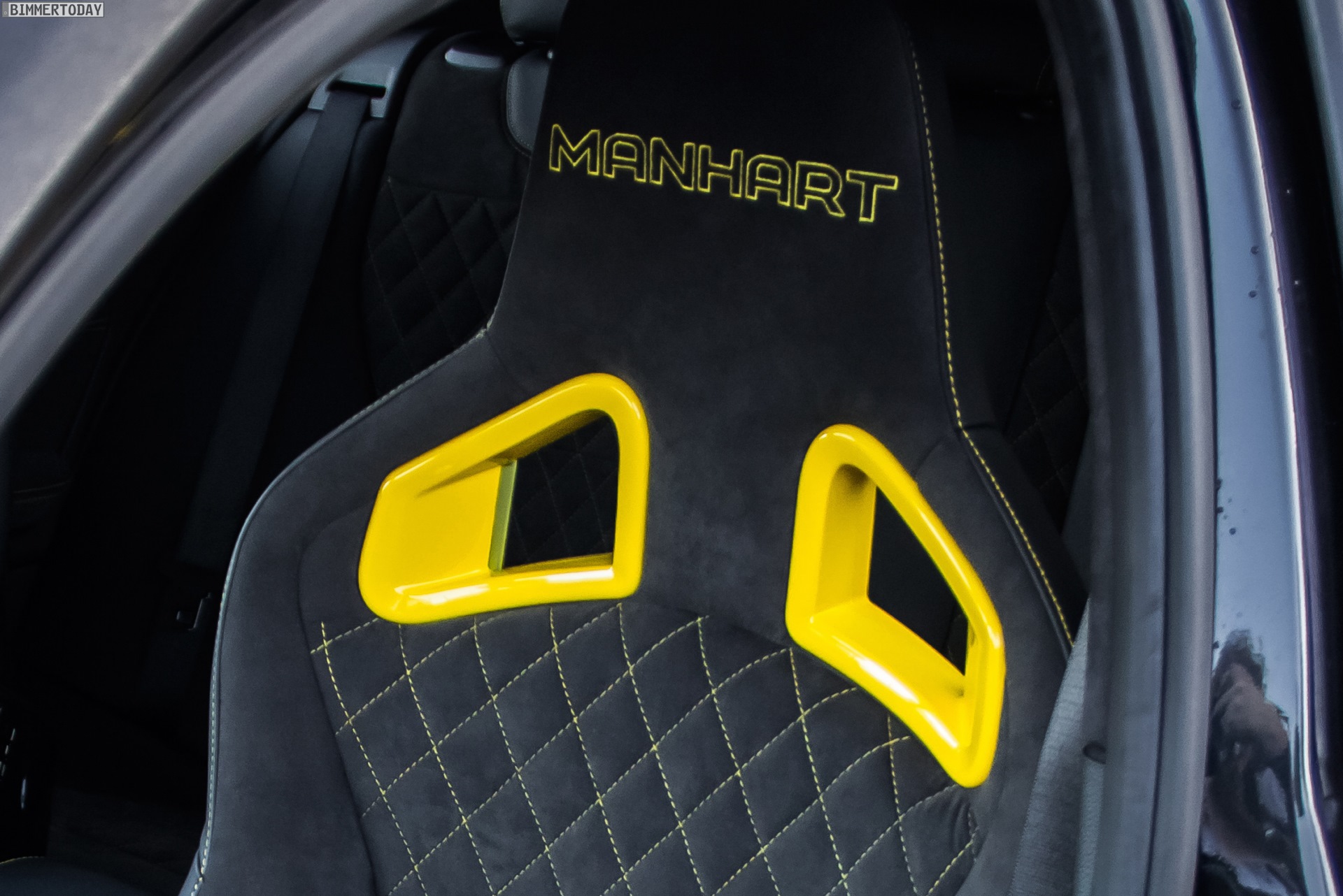 Komplettiert wird der Manhart Performance M135i im Innenraum, denn auch hier hebt sich der Wuppertaler deutlich von der Serie ab. Das Exterieur-Farbschema wird innen erneut aufgegriffen, dunkle Elemente aus Leder und Alcantara treffen auf gelbe Ziernähte und Details. Wer vorn sitzt, nimmt in Schalensitzen von BMW Performance Platz.