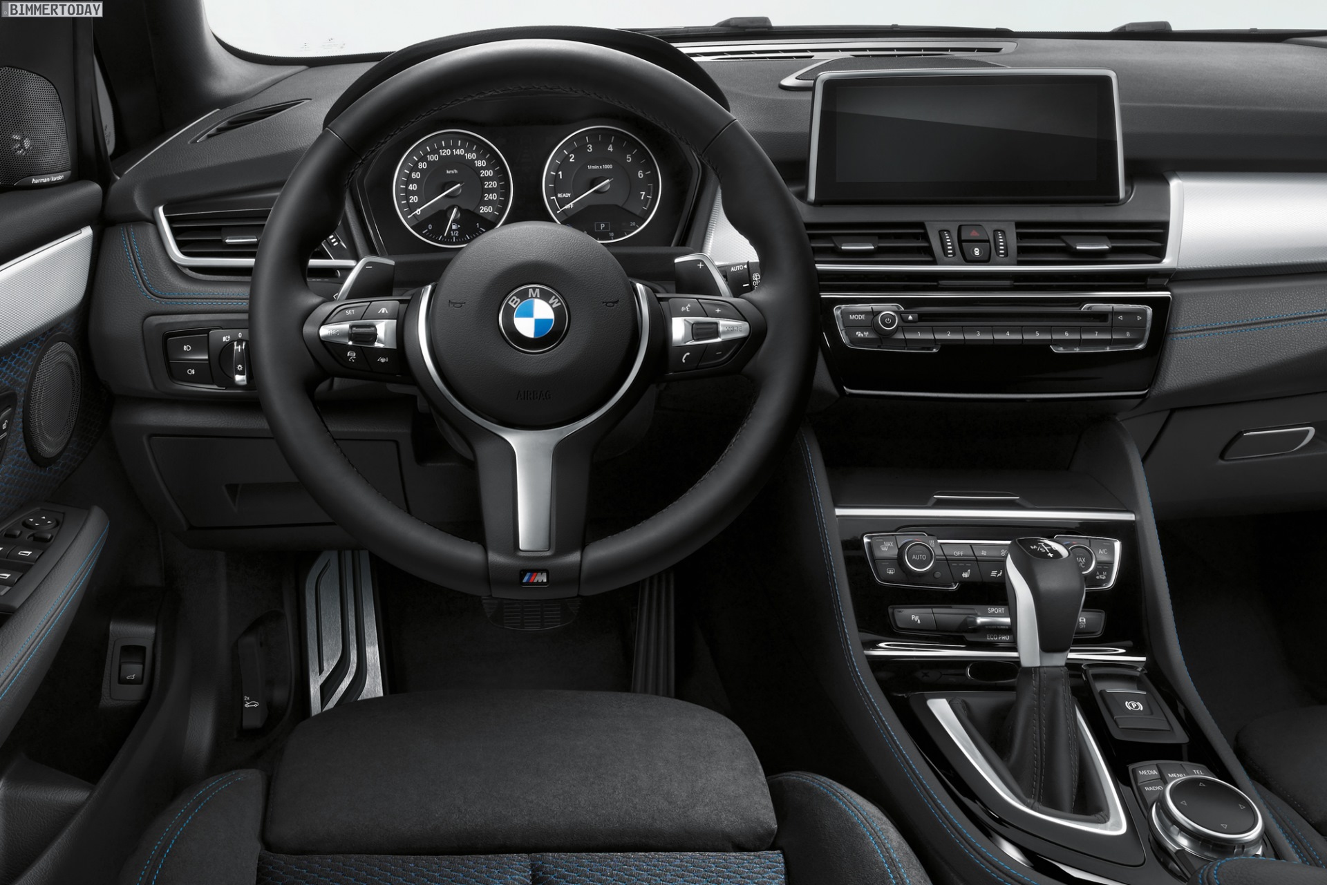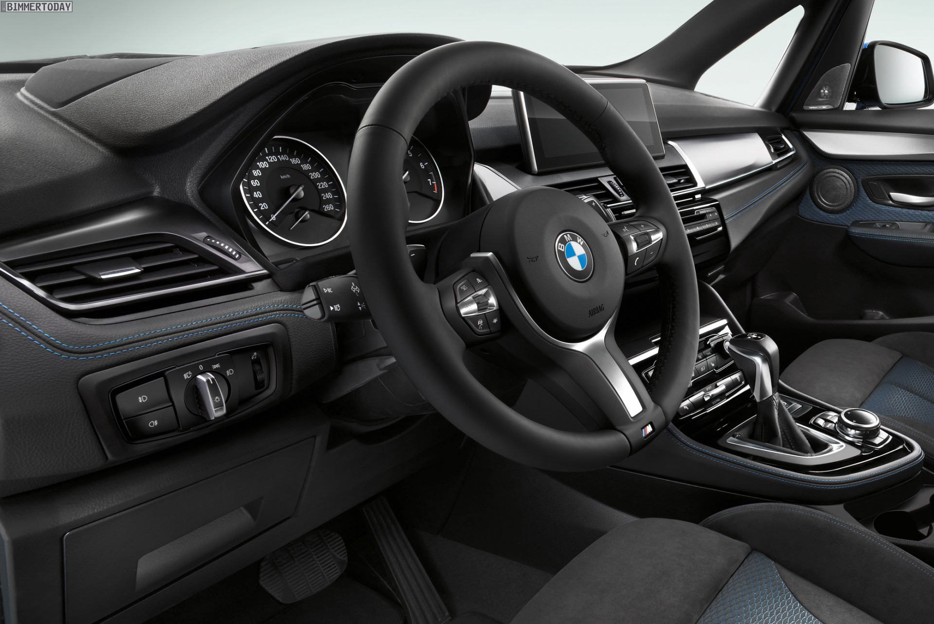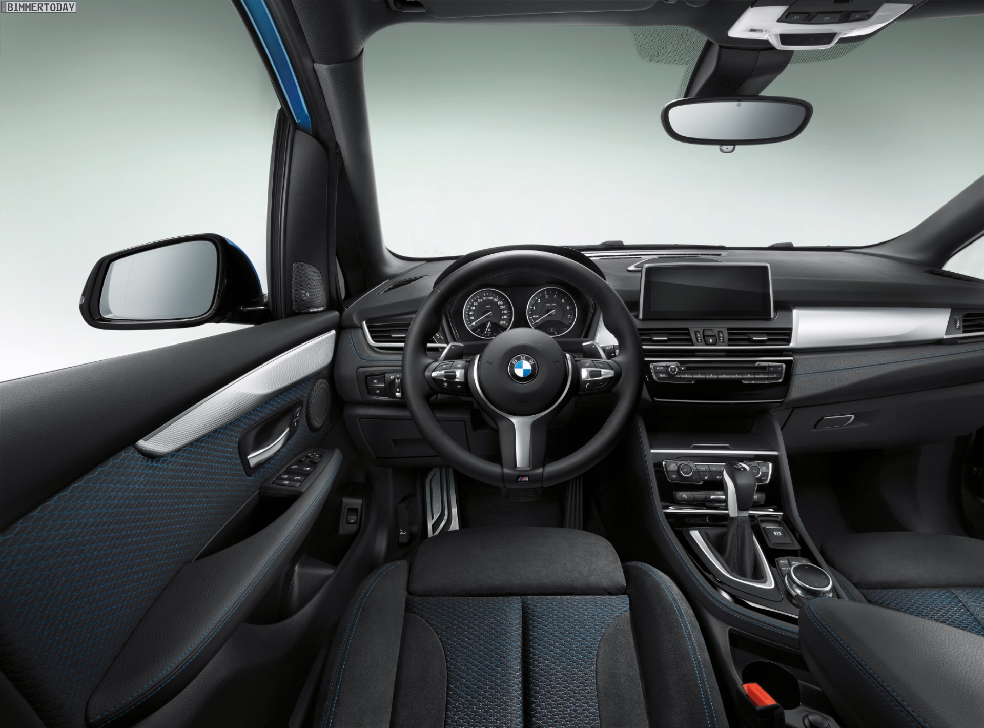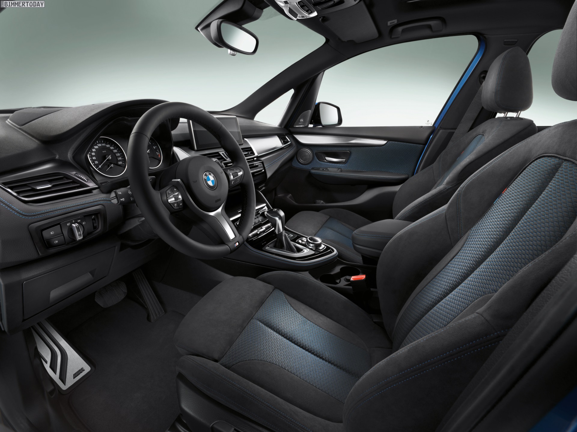 Dank M Sportpaket verfügt der 2er-Van rundum über dynamischer gezeichnete Schürzen sowie passende Seitenschweller und Felgen. Auch im Innenraum sorgt das M Paket für sportlicheres Flair und bringt unter anderem ein filigran gezeichnetes Sportlenkrad, Aluminium Hexagon-Interieurleisten sowie Sportsitze mit Alcantara-Bezug und blauen Akzenten ins Spiel.