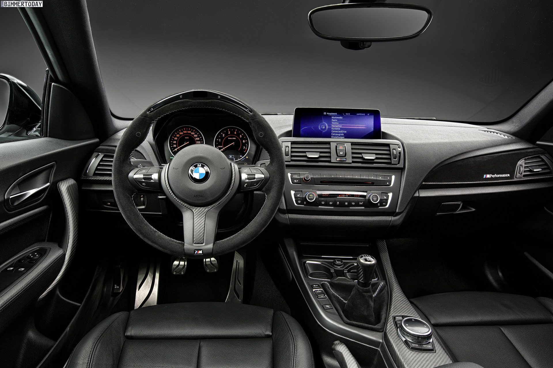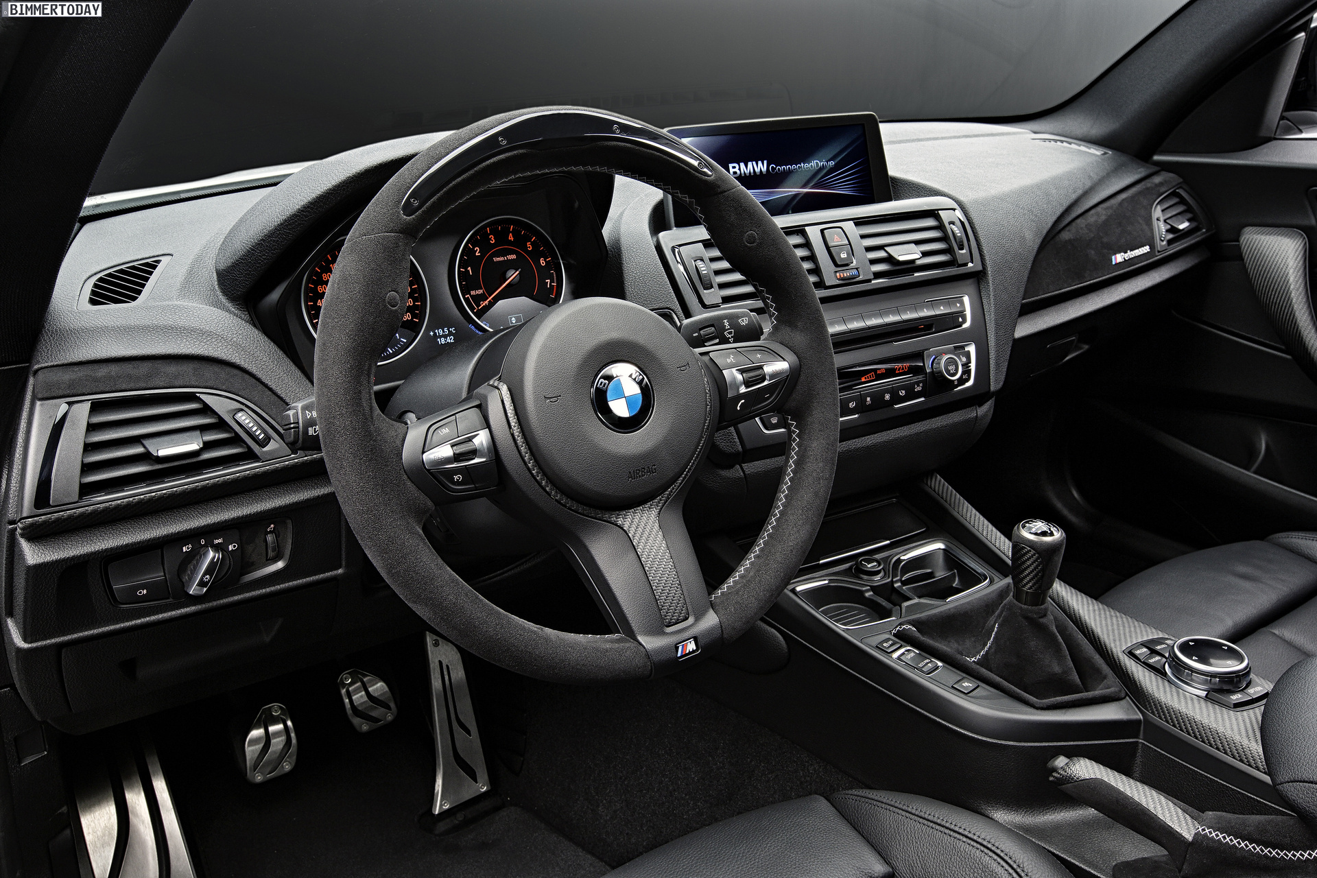Für den Innenraum umfasst das BMW M Performance-Programm zahlreiche Teile, die mit Carbon und Alcantara Motorsport-Flair in den Innenraum bringen. Das M Performance Lenkrad mit roter Mittenmarkierung gehört ebenso zum Programm wie Interieurleisten, Schalthebel, Handbremsgriff und Edelstahl-Pedalerie – auch über das Angebot des M Sportpakets hinaus lässt sich das Interieur so deutlich sportlicher gestalten.