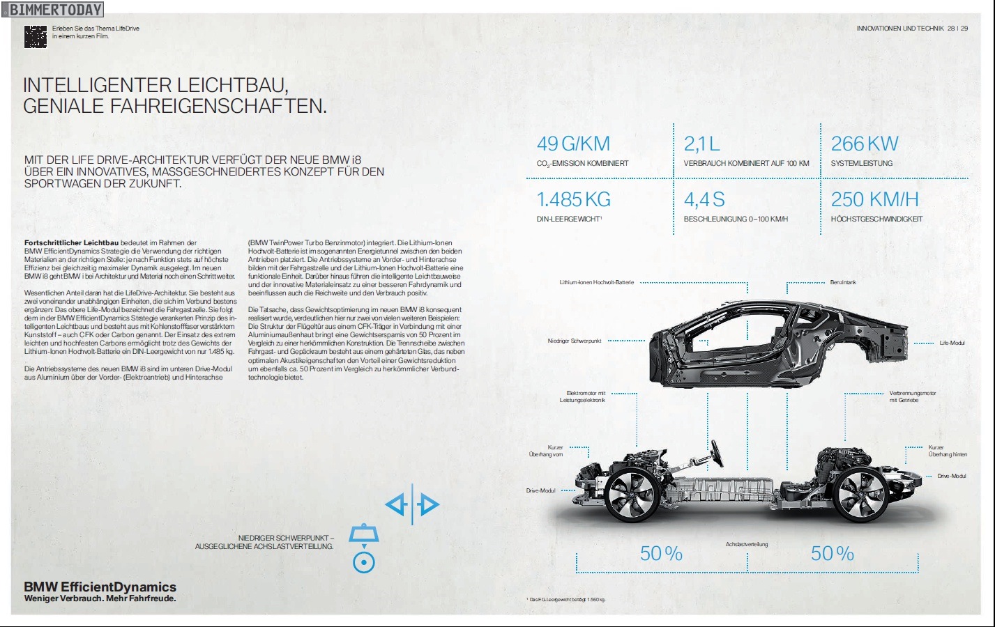 Der Katalog geht außerdem detailliert auf Leichtbau-Technik rund um die Carbon-Fahrgastzelle ein und erläutert die Vorzüge des Plug in-Hybrid-Antriebs, der sportliche Fahrleistungen mit einem EU-Verbrauch von 2,1 Liter auf 100 Kilometer kombiniert.