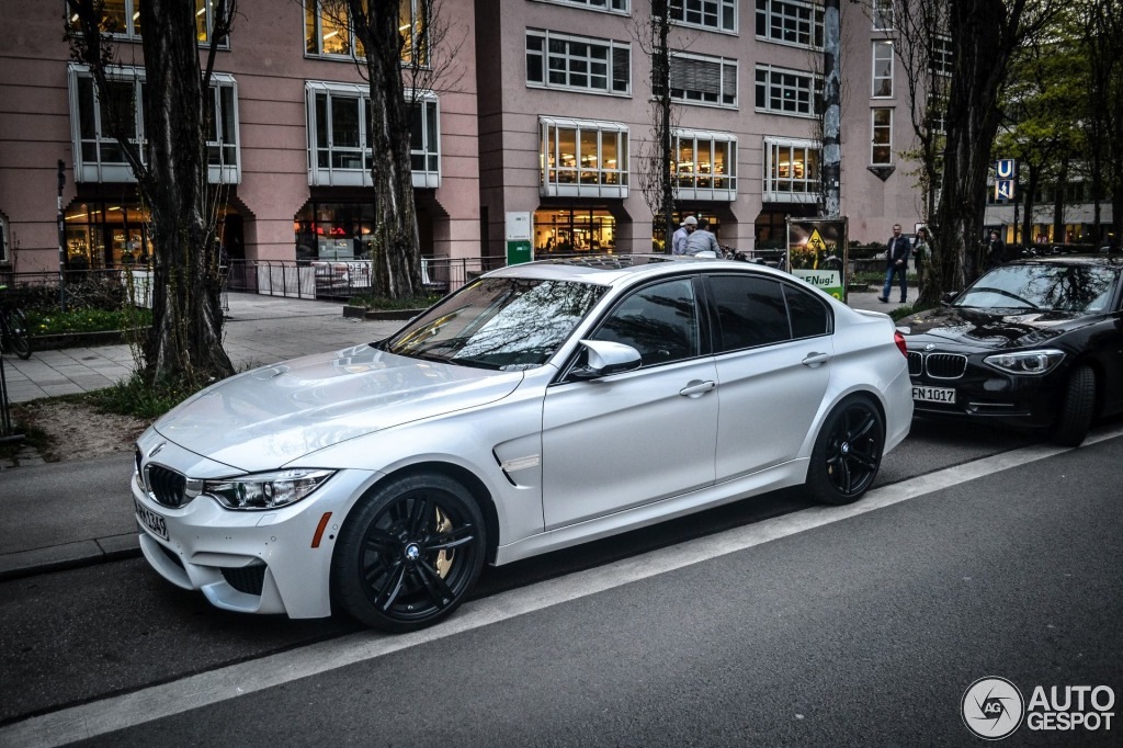 Das an sich serienmäßige Carbon-Dach trägt dieses Exemplar des neuen M3 nicht, weil das auf Wunsch erhältliche Glas-Schiededach verbaut ist – in diesem Fall kommt an Stelle des leichten Kohlefaser-Dachs die gewöhnliche Stahl-Variante der 3er Limousine zum Einsatz.