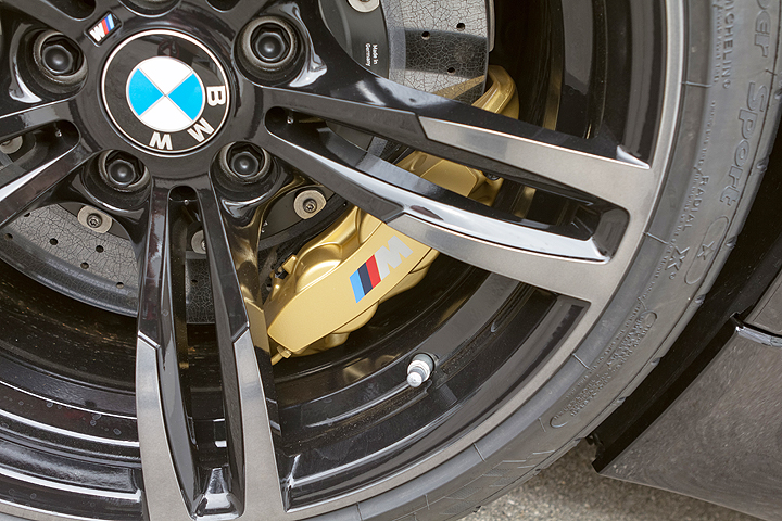 Neu ist: Beim neuen BMW M3 und BMW M4 kommen an der Vorder- und Hinterachse nun Festsattelbremsen zum Einsatz, vorne mit vier Kolben und hinten mit zwei. Der Vorgänger hatte schwerere Einkolben-Faustsattel-Scheibenbremsen.