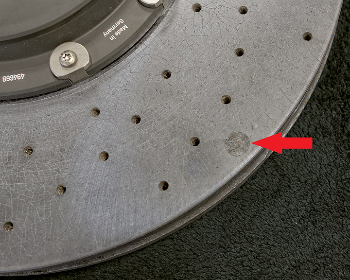 Die Scheibe wird dabei nicht dünner, aber leichter. Um dies zu erkennen, gibt es an der Scheibe jeweils um 120 Grad versetzt drei Verschleißindikatoren pro Reibschicht. Der Händler kann so eventuellen sehr starken oxidativen Verschleiß erkennen. Beim Belagservice würde die Scheibe dann ausgebaut und gewogen. Sollte das Mindestgewicht hier unterschritten werden, wäre die Scheibe zu ersetzen.