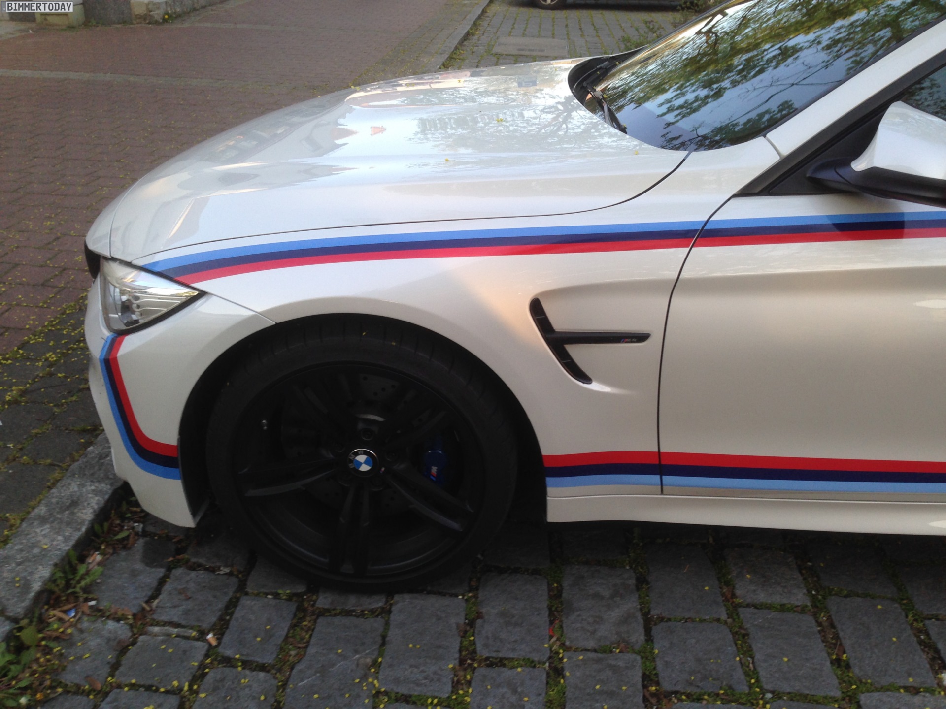 Mit dezenten Dekor-Streifen in den Farben der M GmbH und seinen schwarzen Nieren grenzt sich der Werkstestwagen deutlich von der Serie ab und lässt den weißen M4 erheblich sportlicher wirken. Die Dekor-Streifen sind auf beiden Seiten angebracht und reichen von der Frontschürze bis zu den hinteren Kotflügeln.