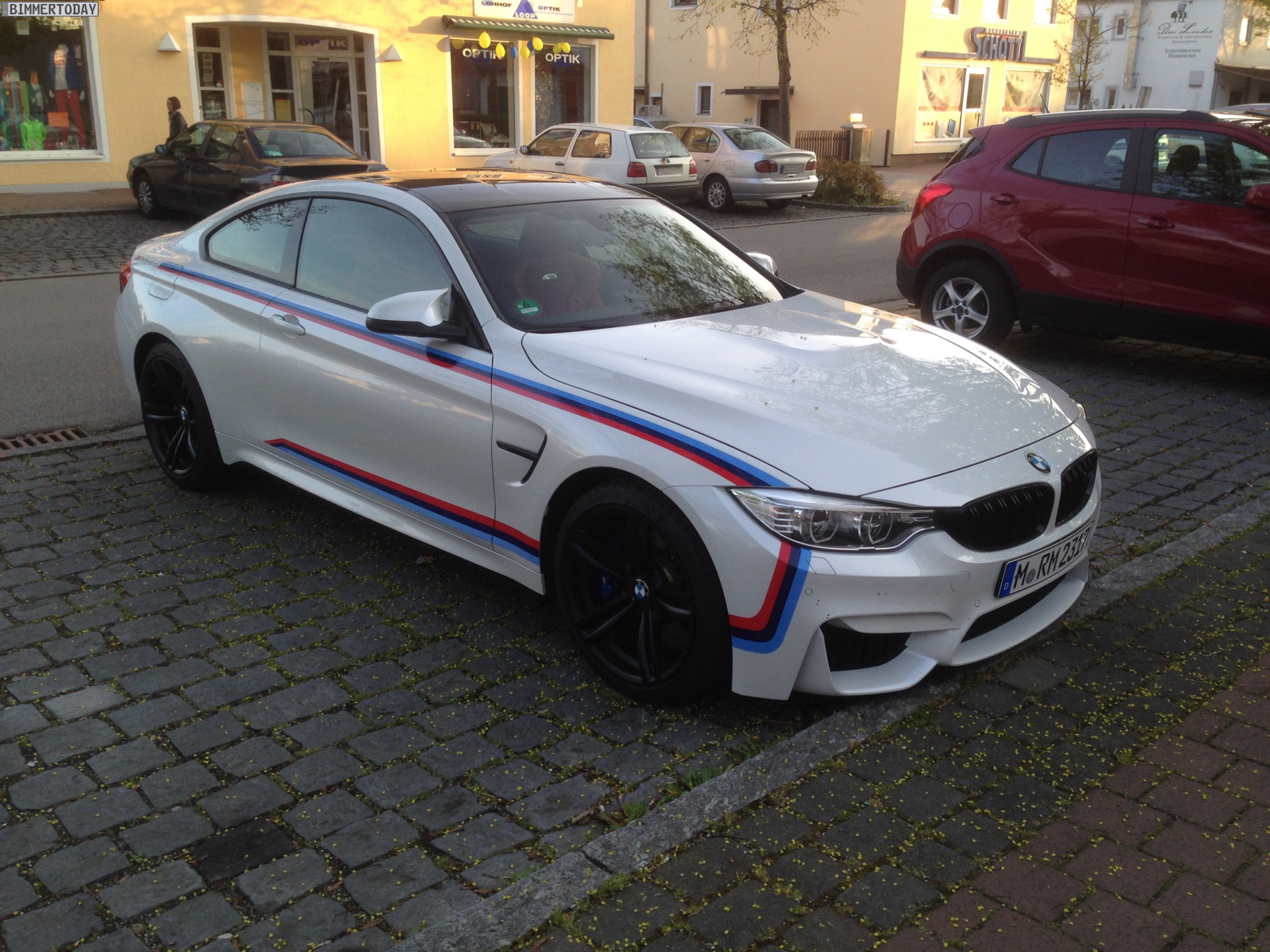Zwar ist das neue BMW M4 Coupé F82 noch nicht auf dem Markt, aber im Hintergrund wird offenbar schon an den ersten Tuning-Teilen von BMW M Performance gearbeitet. Unser Leser Axel hat in München einen M4 mit auffälliger Beklebung erwischt und beschert uns damit den ersten Eindruck vom künftigen M-Dekor für gewöhnliche Kunden – schließlich dürfte der Auftritt des BMW M4 Safety Car den meisten Kunden doch etwas zu auffällig sein.