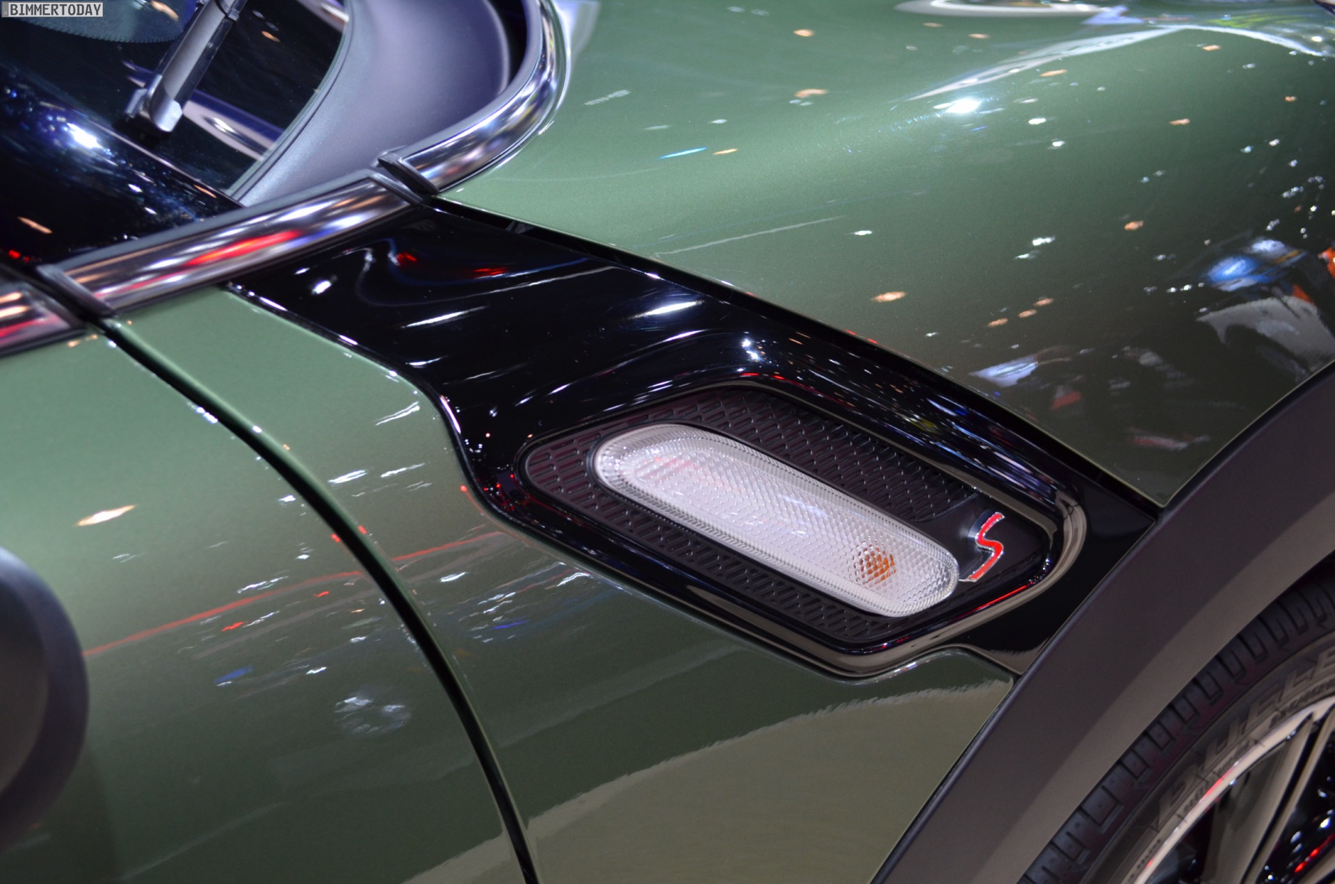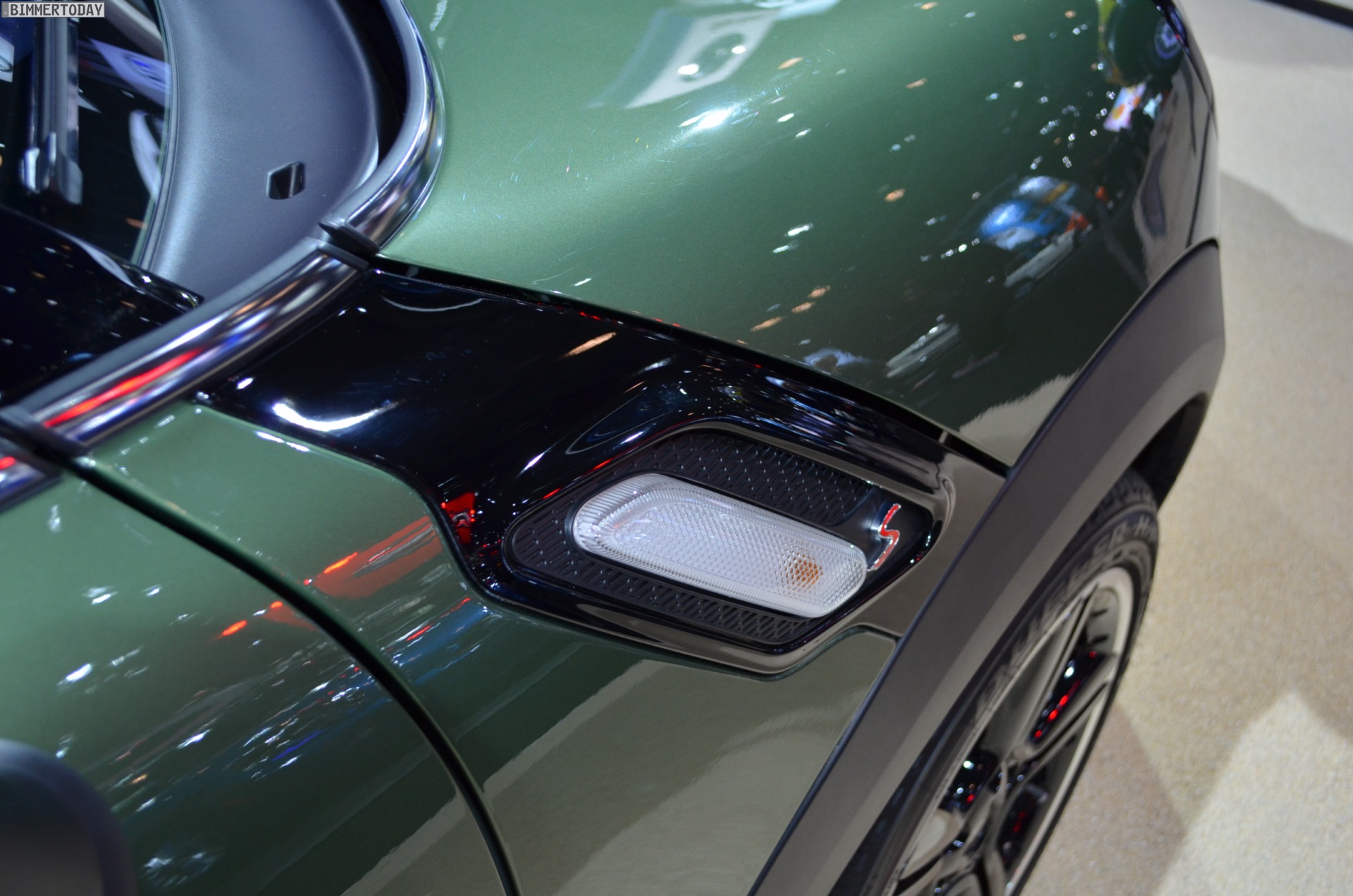 Wie schon auf den offiziellen Fotos wird der dezent überarbeitete Countryman R60 LCI auch auf der NYIAS in Jungle Green präsentiert, dazu kommen Akzente in Schwarz – einerseits in Form von Dach und Felgen, andererseits durch die schwarzen Elemente des neuen Exterieur-Pakets Piano Black.