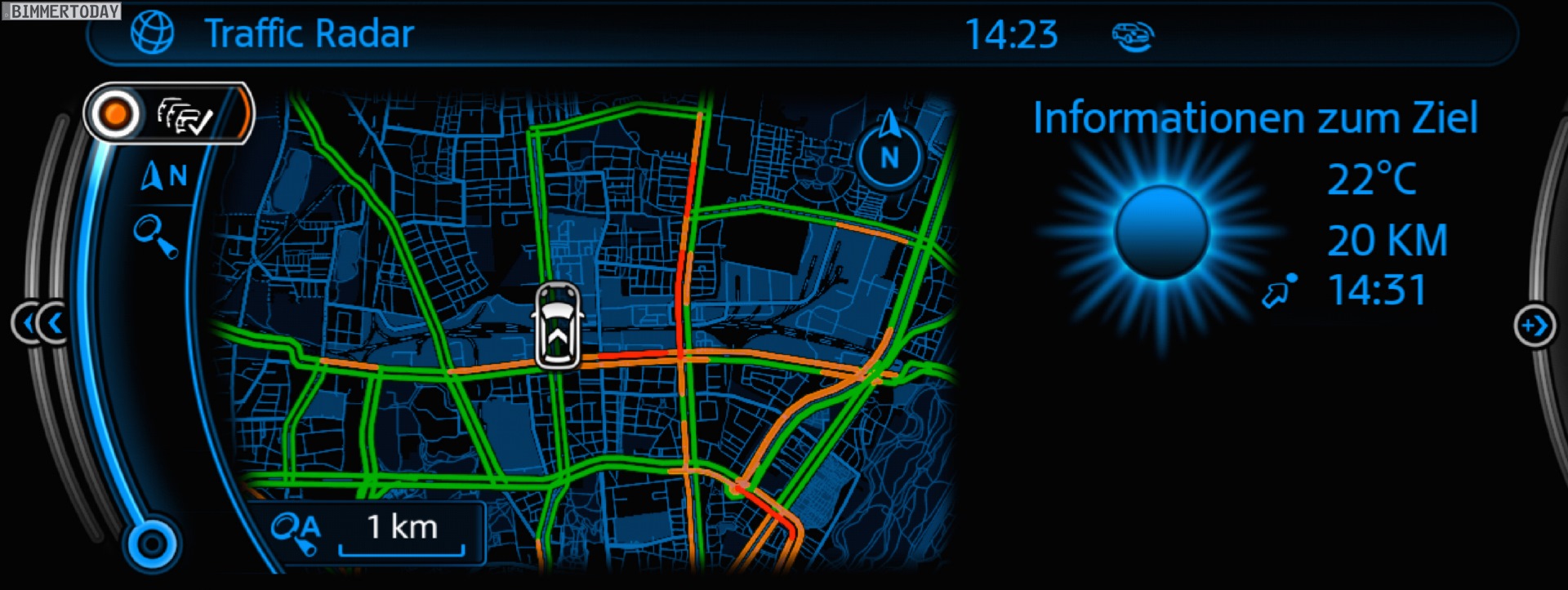 Der MINI XL Journey Mate achtet außerdem darauf, ob genügend Kraftstoff im Tank ist und empfiehlt anderenfalls Tankstellen entlang der Route. Mit den Informationen der Real Time Traffic Information RTTI wird ständig überprüft, ob die geplante Ankunftszeit eingehalten werden kann und anderenfalls eine Ausweichroute vorgeschlagen. Ständig im Blick hat der Fahrer auch das Wetter am Zielort.