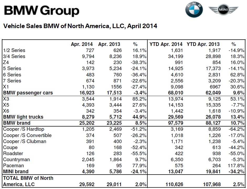 Für die BMW Group insgesamt ergibt sich im April 2014 trotz des starken Rückgangs bei MINI ein Absatz von 29.592 Einheiten – ein Plus von moderaten 2,0 Prozent oder 579 Einheiten. Großen Anteil am Wachstum haben die Pkw-Baureihen der 2er-, 3er- und 4er-Reihe sowie die SUV-Modelle X3 und X5.