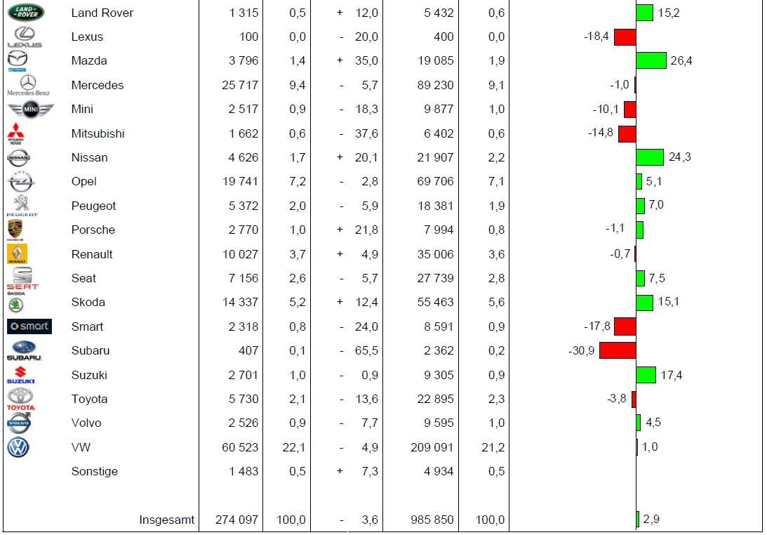 Für die ersten vier Monate 2014 kommt BMW auf einen Absatz von 76.587 Einheiten und liegt damit knappe 0,4 Prozent über dem Vorjahreszeitraum, MINI verkaufte in den vier vom anstehenden Modellwechsel geprägten Monaten 9.877 Fahrzeuge (-10,1%). Audi wuchs um 6,9 Prozent auf 87.248 Einheiten und liegt damit knapp über den Verkaufszahlen der BMW Group (86.464). Mercedes (89.230 /-1,0%) und Smart (8.591 / -17,8%) liegen mit zusammen 97.891 verkauften Fahrzeugen an der Spitze.