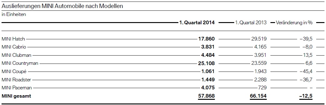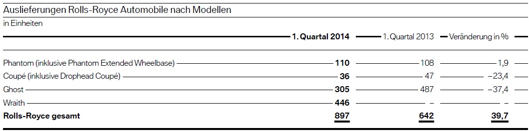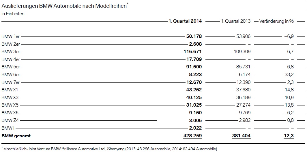 Mit einem neuen Absatz-Rekord hat die BMW Group den Grundstein für ein in jeglicher Hinsicht erfolgreiches 1. Quartal 2014 gelegt. In den ersten drei Monaten des Jahres wurden 487.024 Fahrzeuge der Marken BMW, MINI und Rolls-Royce ausgeliefert – 8,7 Prozent mehr als im Vorjahreszeitraum und mehr als jemals zuvor in einem ersten Quartal.