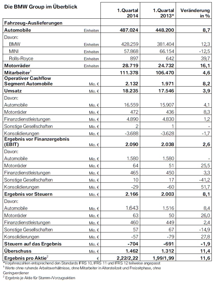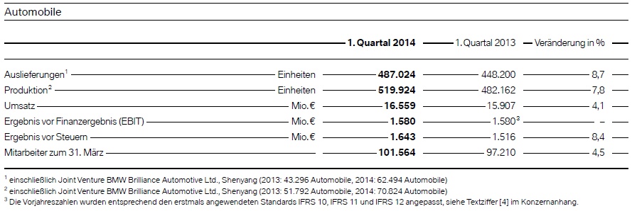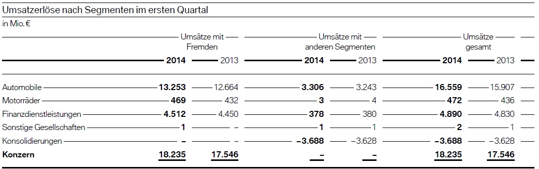 Als unmittelbare Folge der Absatz-Steigerung kletterte auch der Umsatz um 3,9 Prozent auf 18,235 Milliarden Euro. Das Ergebnis vor Finanzergebnis (EBIT) konnte hohen Investitionen zum Trotz um 2,6 Prozent auf 2,090 Milliarden gesteigert werden, das Konzernergebnis vor Steuern (EBT) wurde um 8,1 % auf 2,166 Milliarden Euro gesteigert. Die EBIT-Marge lag im ersten Quartal 2014 bei beachtlichen 9,5 Prozent.