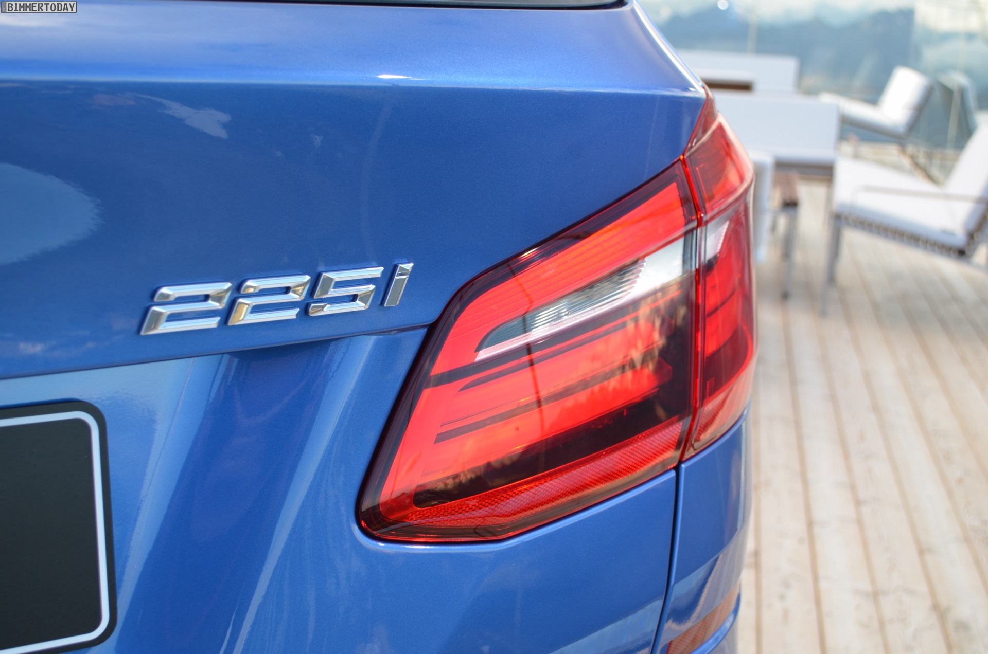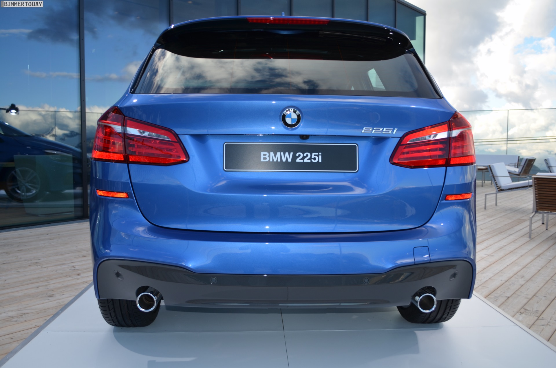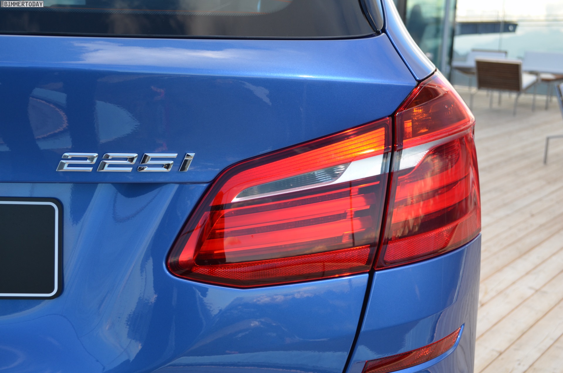 Passend zum sportlichen Auftritt ist beim gezeigten Fahrzeug auch der stärkste Motor verbaut: Als 225i kommt der Active Tourer mit 231 PS, jeweils ein Endrohr auf der linken und rechten Seite prägen das Topmodell am Heck.