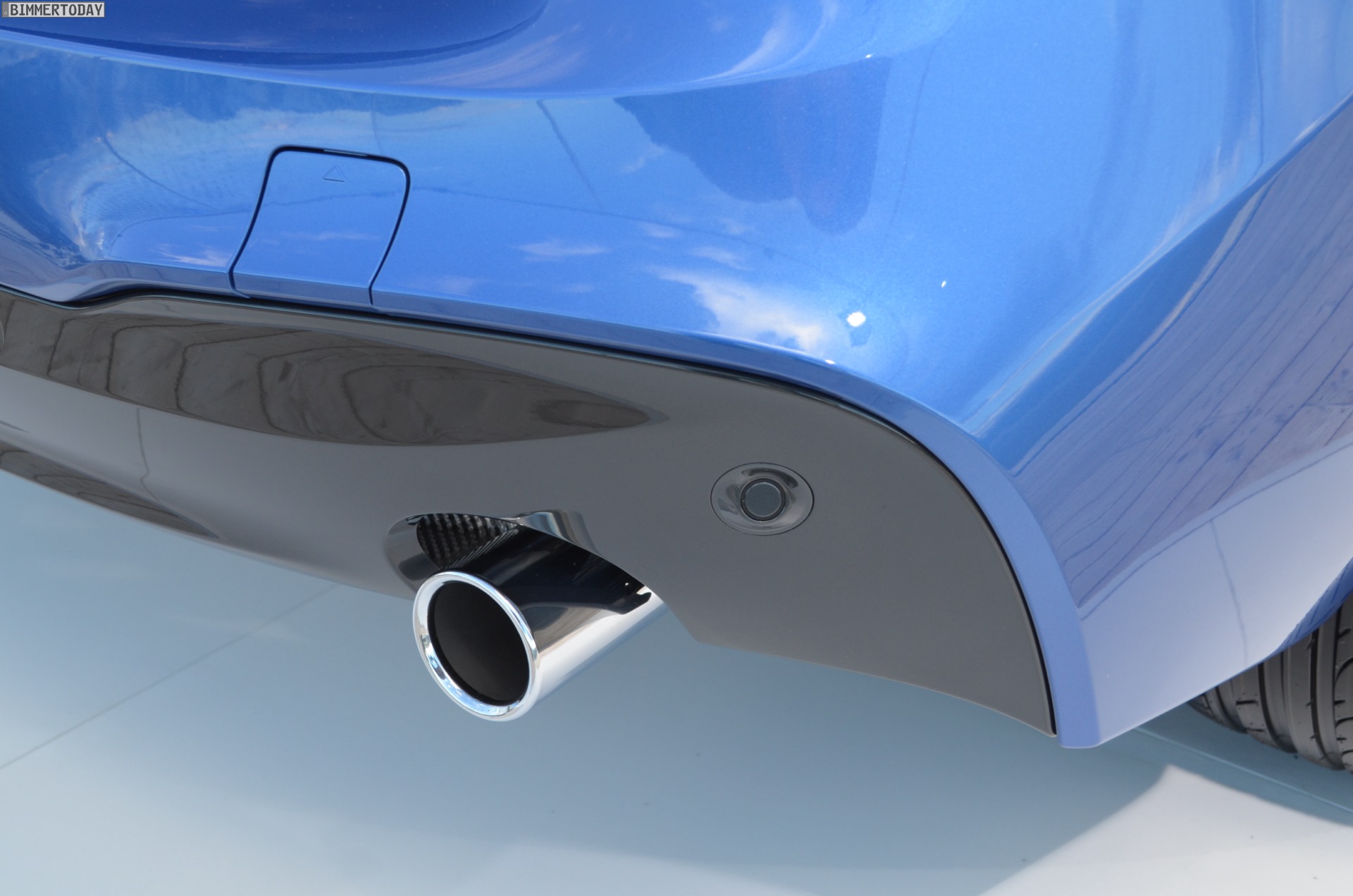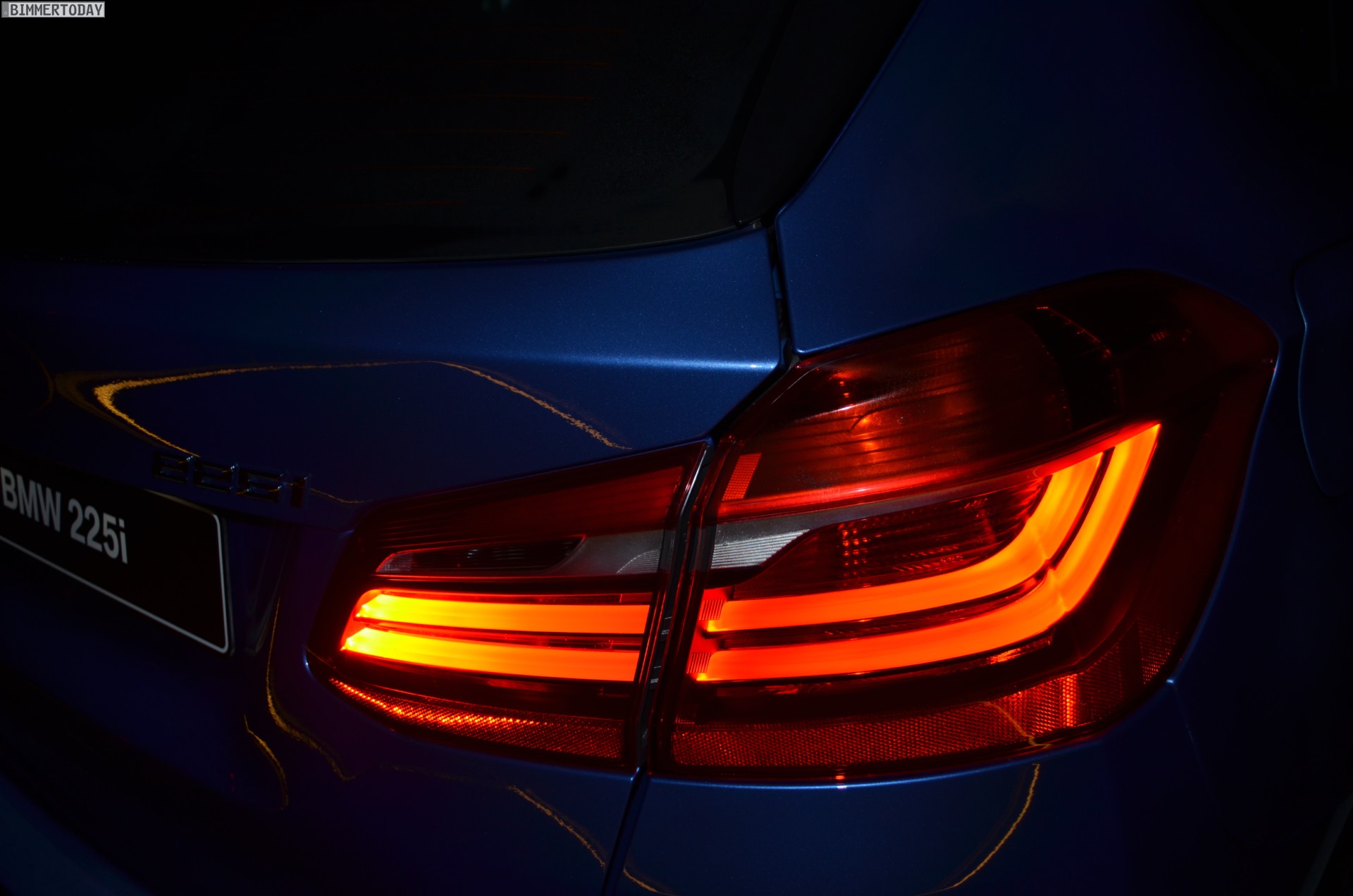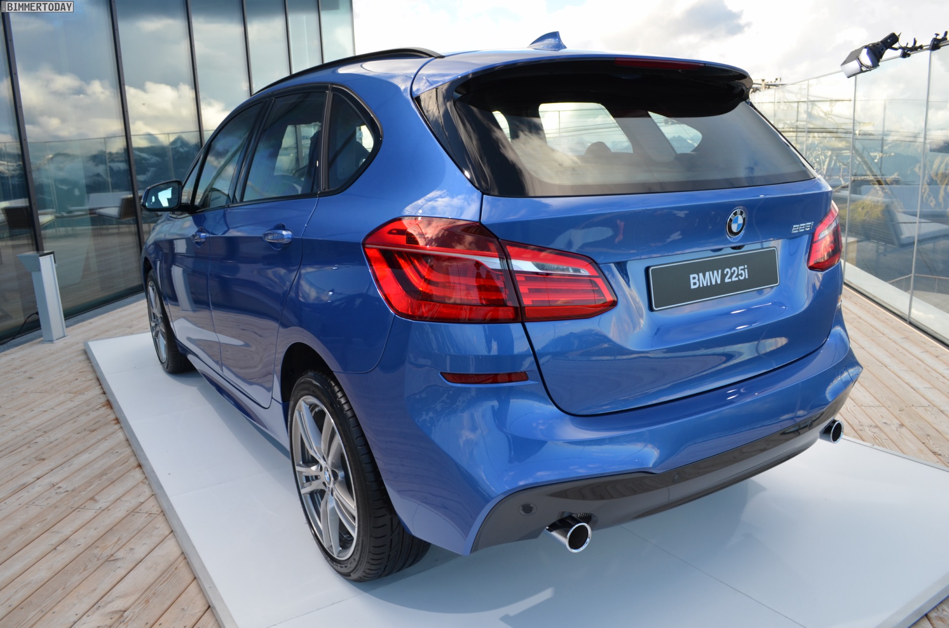 Passend zum sportlichen Auftritt ist beim gezeigten Fahrzeug auch der stärkste Motor verbaut: Als 225i kommt der Active Tourer mit 231 PS, jeweils ein Endrohr auf der linken und rechten Seite prägen das Topmodell am Heck.