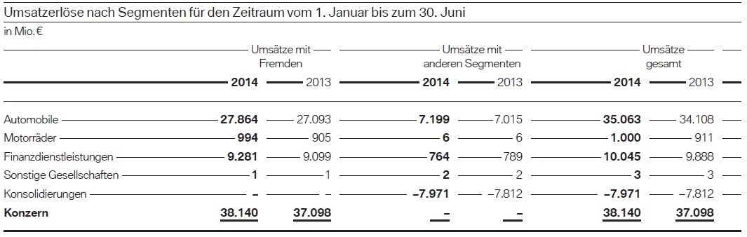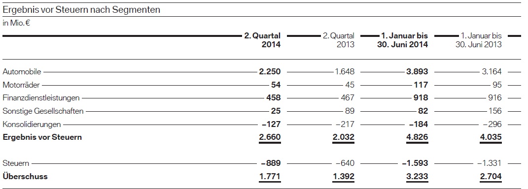 Für das erste Halbjahr 2o14 ergeben sich eine Umsatz-Steigerung um 2,8 Prozent auf 38,140 Milliarden Euro, eine EBIT-Steigerung um 14,4 Prozent auf 4,693 Milliarden Euro, eine Steigerung des Konzernergebnisses vor Steuern um 19,6 Prozent auf 4,826 Milliarden Euro und ein Überschuss-Wachstum von 19,6 Prozent auf 3,233 Milliarden Euro.
