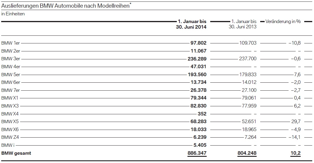 Beim Blick auf die Baureihen ist zunächst festzuhalten, dass die wichtigen Baureihen 3er, 5er, 6er und X5 in ihrem Segment weltweite Marktführer waren. Wichtigste Baureihe war erwartungsgemäß der BMW 3er, der im ersten Halbjahr 236.289 Kunden fand und sich mit einem Minus von 0,6 Prozent auf dem hohen Niveau des Vorjahres befand, obwohl Coupé und Cabrio nun zur 4er-Reihe gezählt werden und im ersten Halbjahr 2014 für einen Absatz von 47.031 Einheiten standen. Noch stärker entwickelte sich die 5er-Reihe, die auf 193.560 Einheiten (+7,6%) kam.