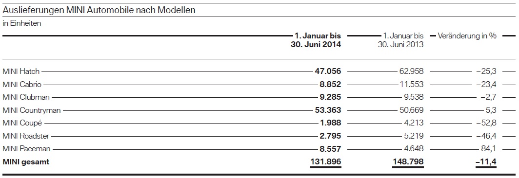 Die besonders effizienten Modelle der Submarke BMW i trugen im ersten Halbjahr 2014 mit 5.405 Einheiten zum Absatz der BMW Group bei, laut BMW ist derzeit vor allem die Produktionskapazität im Werk Leipzig der limitierende Faktor für noch höhere Verkaufszahlen. Mit steigender Verfügbarkeit – der Verkauf des BMW i8 hat gerade erst begonnen und konnte nur mit 9 Einheiten zum i-Absatz beitragen – dürften diese Zahlen in den nächsten Monaten weiter steigen.