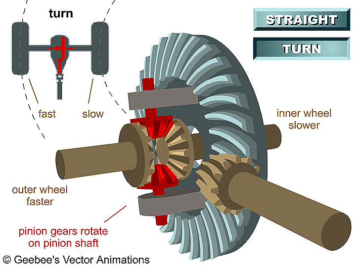 Das Antriebsmoment des Motors wird über das Getriebe und die Gelenkwelle an das Hinterachsgetriebe geleitet. Das im Hinterachsgetriebe verbaute Differenzial verteilt das Antriebsmoment gleichmäßig auf die beiden Hinterräder und gleicht Drehzahlunterschiede aus.