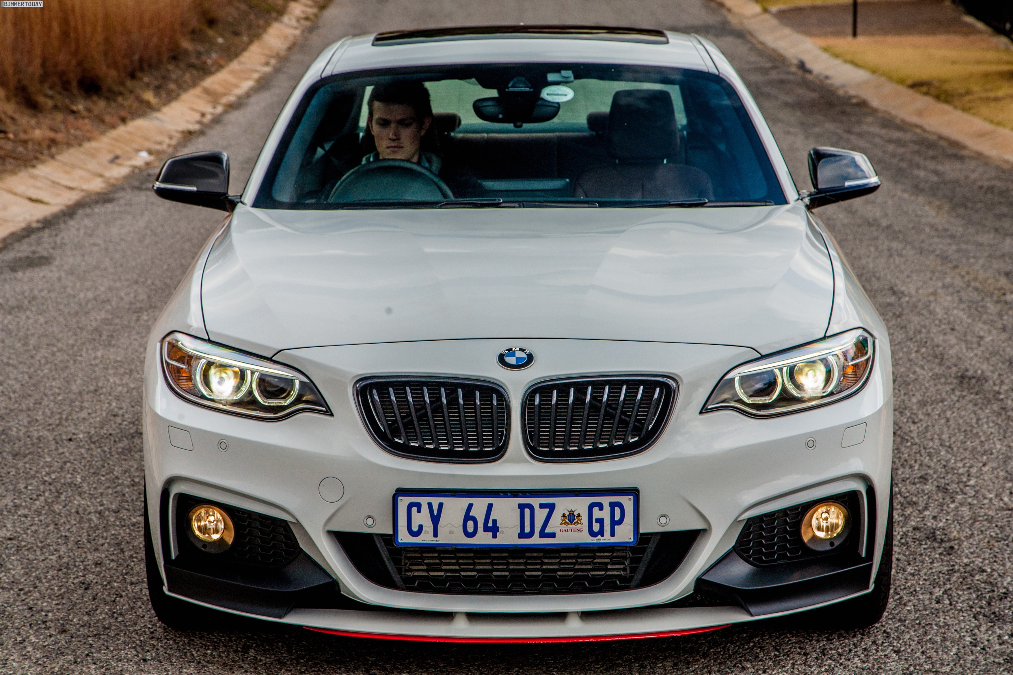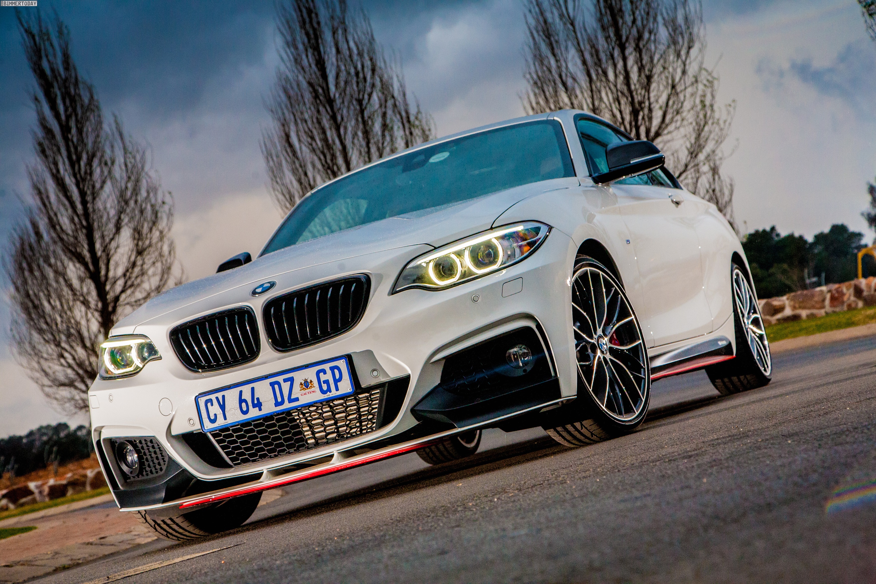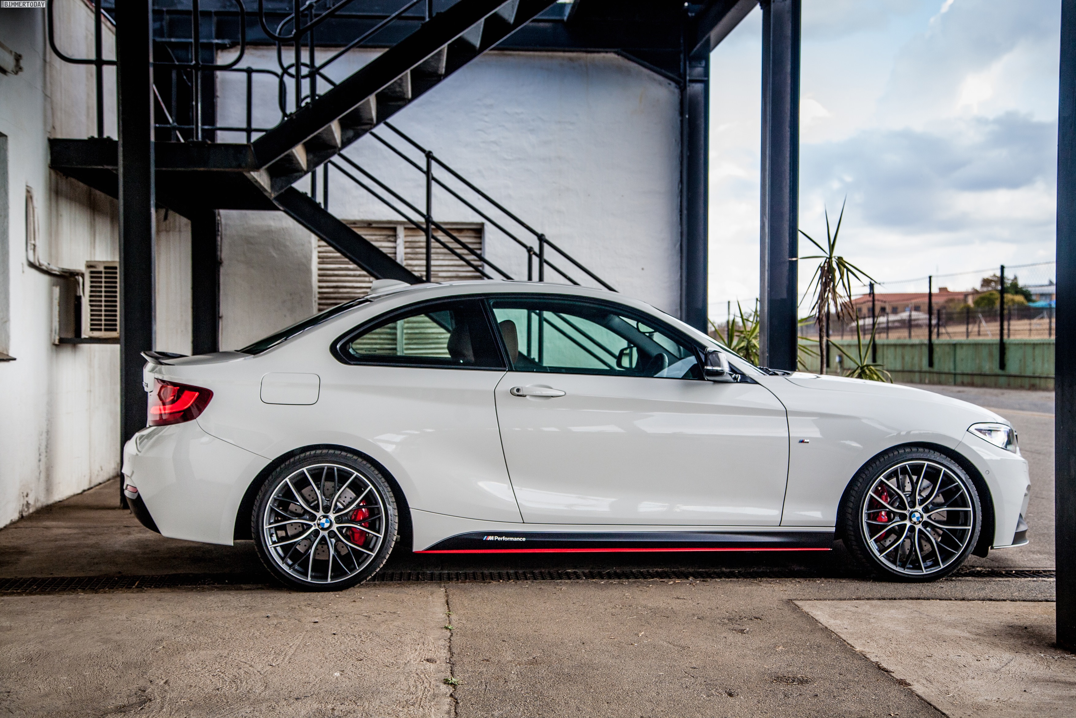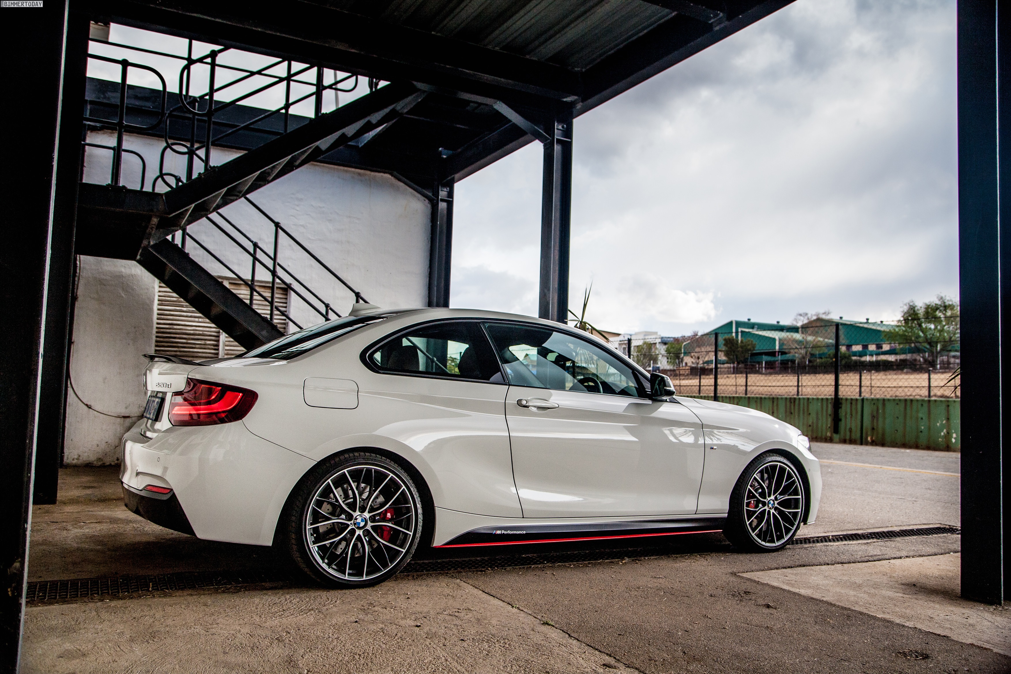 Mit roten Akzenten an Frontsplitter und Seitenschweller sorgt die hier gezeigte Version für noch mehr Abgrenzung von der Serie, Hauptfarben bleiben aber auch bei diesem Fahrzeug Weiß und Schwarz. Grundlage für die BMW M Performance-Komponenten ist das M Sportpaket, das in Südafrika an einem BMW 220d Coupé montiert war, aber wie üblich für alle Motorvarianten erhältlich ist.
