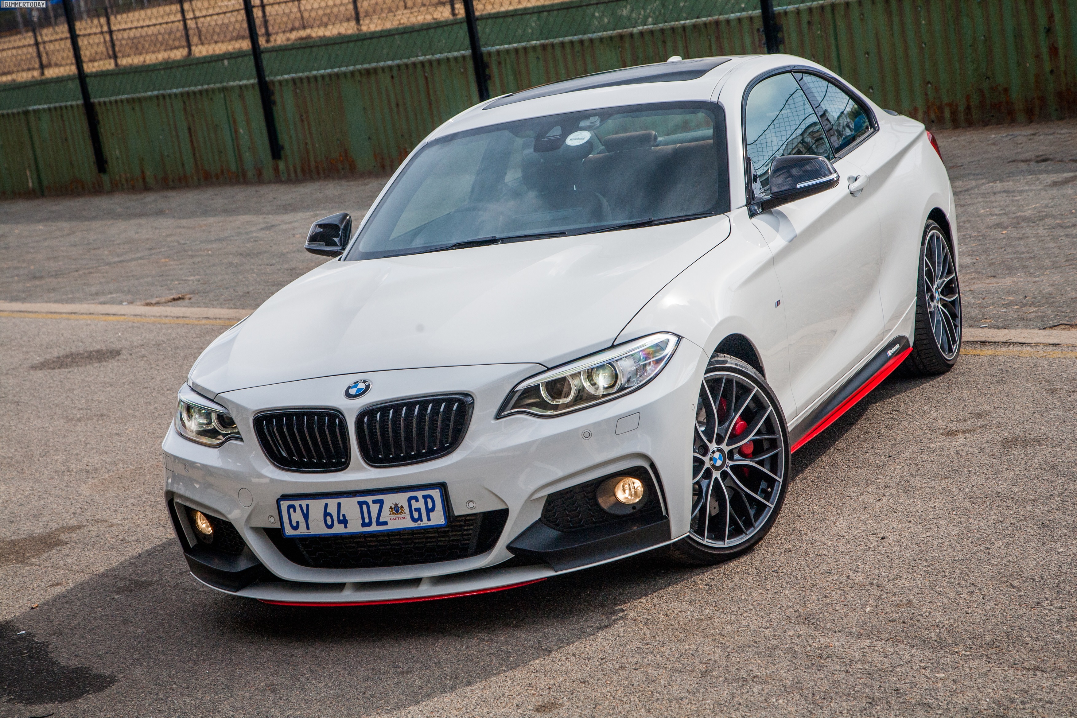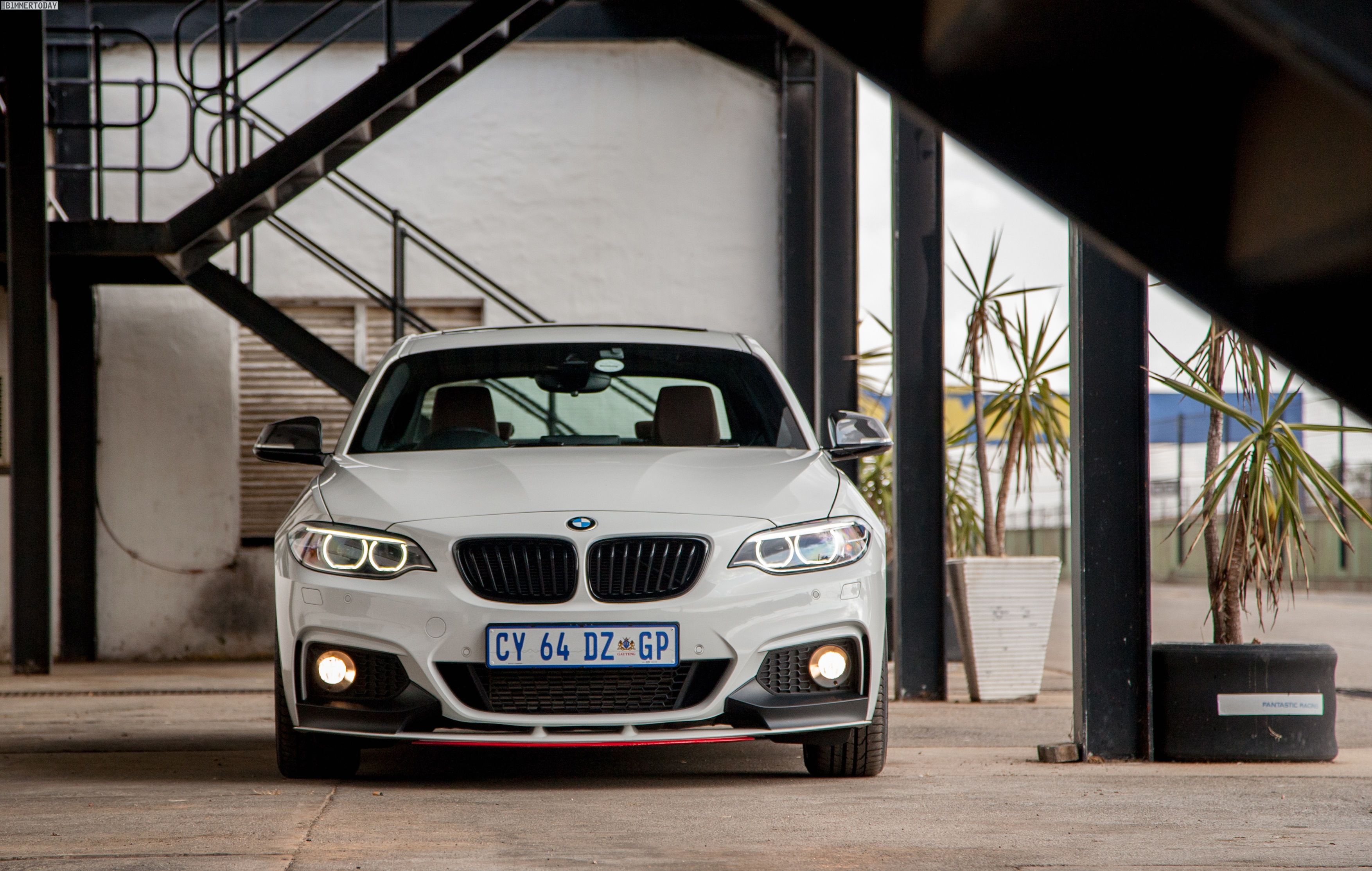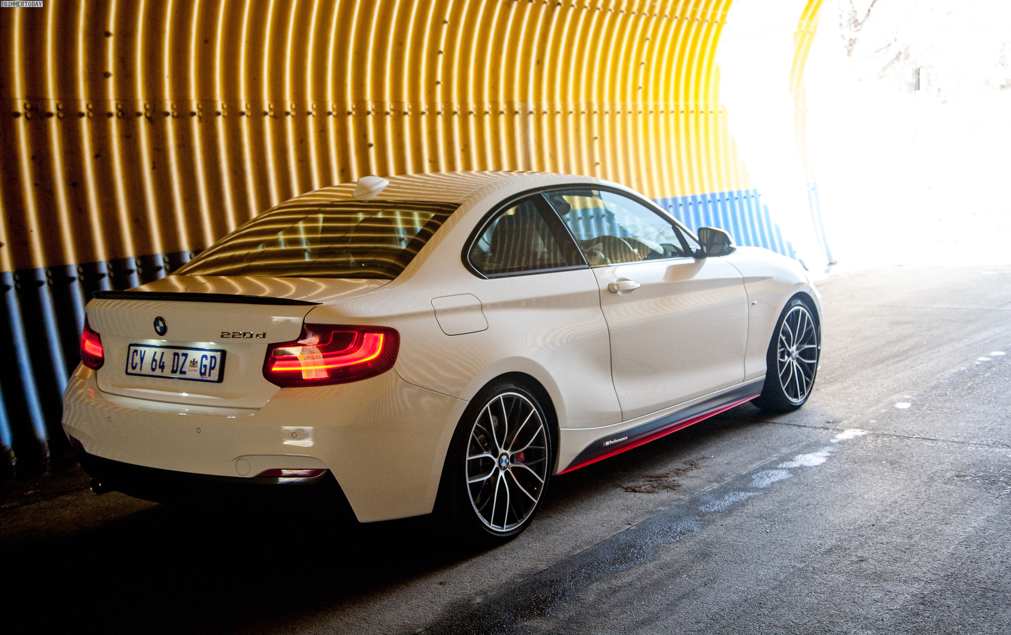 Mit roten Akzenten an Frontsplitter und Seitenschweller sorgt die hier gezeigte Version für noch mehr Abgrenzung von der Serie, Hauptfarben bleiben aber auch bei diesem Fahrzeug Weiß und Schwarz. Grundlage für die BMW M Performance-Komponenten ist das M Sportpaket, das in Südafrika an einem BMW 220d Coupé montiert war, aber wie üblich für alle Motorvarianten erhältlich ist.