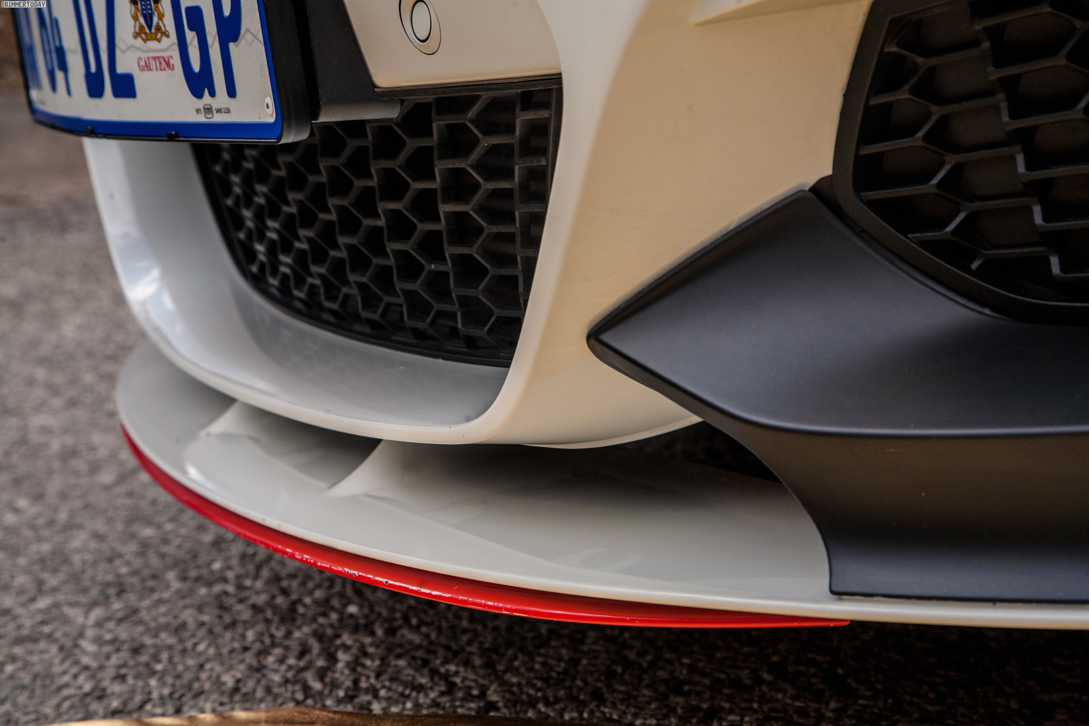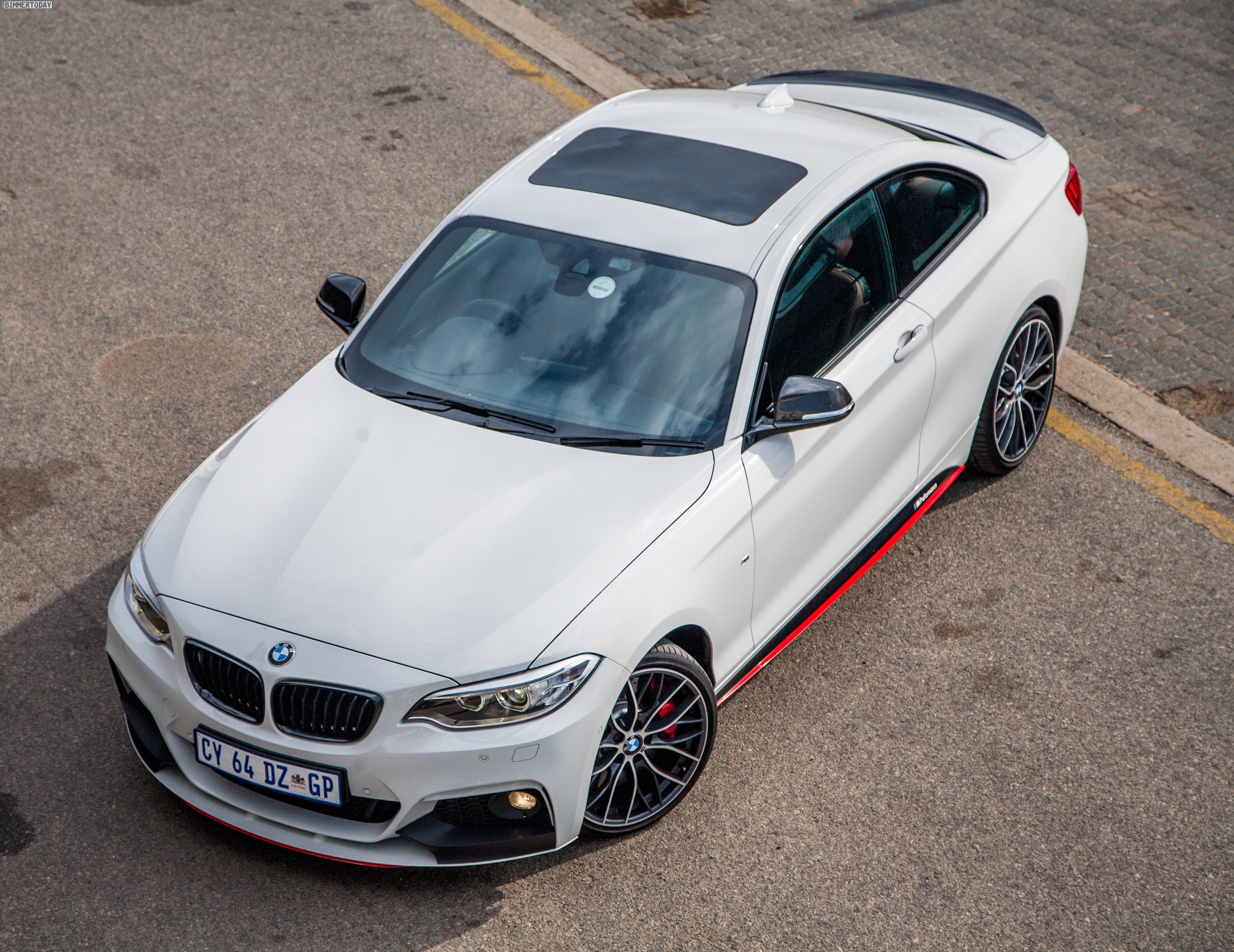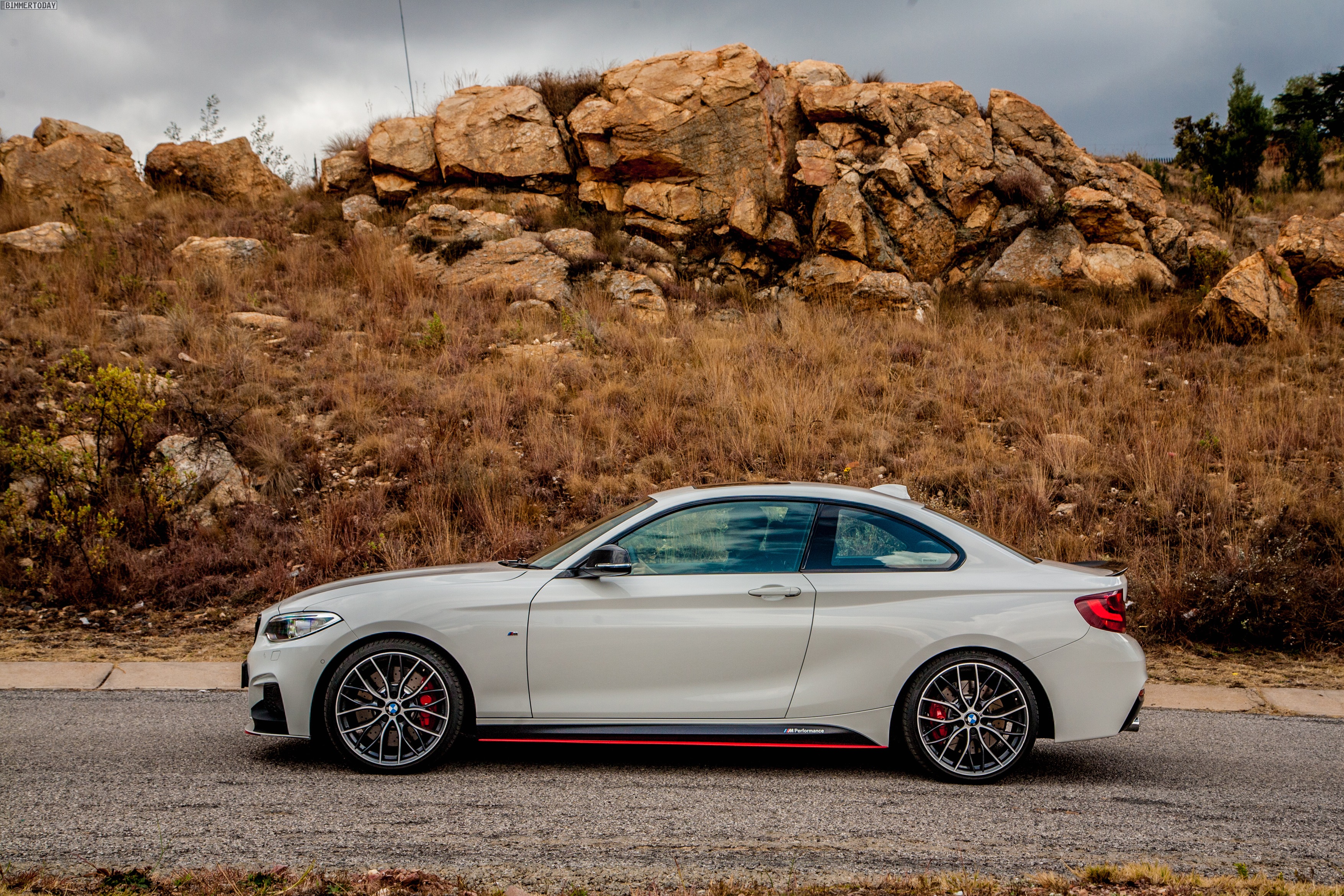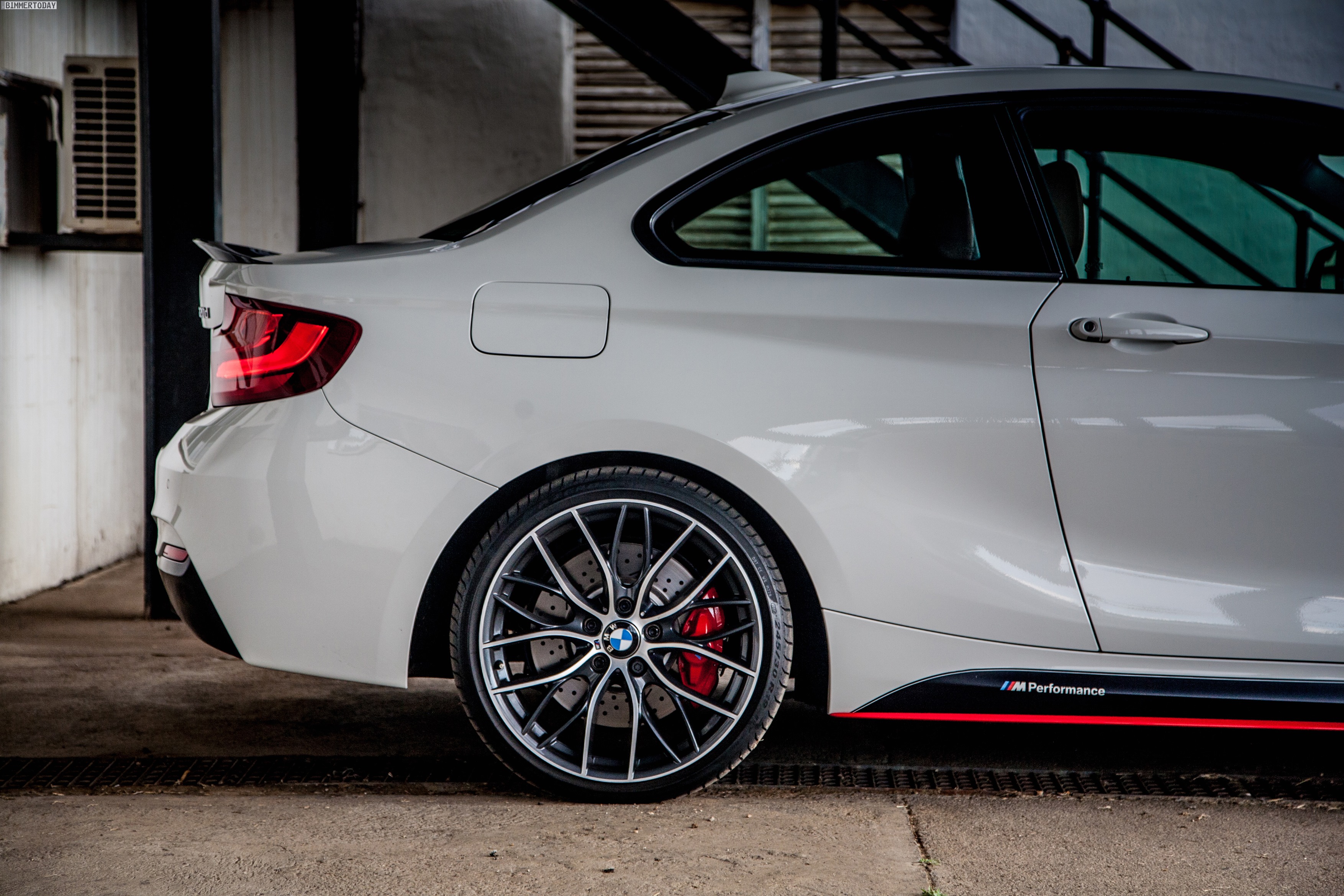 Mit roten Akzenten an Frontsplitter und Seitenschweller sorgt die hier gezeigte Version für noch mehr Abgrenzung von der Serie, Hauptfarben bleiben aber auch bei diesem Fahrzeug Weiß und Schwarz. Grundlage für die BMW M Performance-Komponenten ist das M Sportpaket, das in Südafrika an einem BMW 220d Coupé montiert war, aber wie üblich für alle Motorvarianten erhältlich ist.