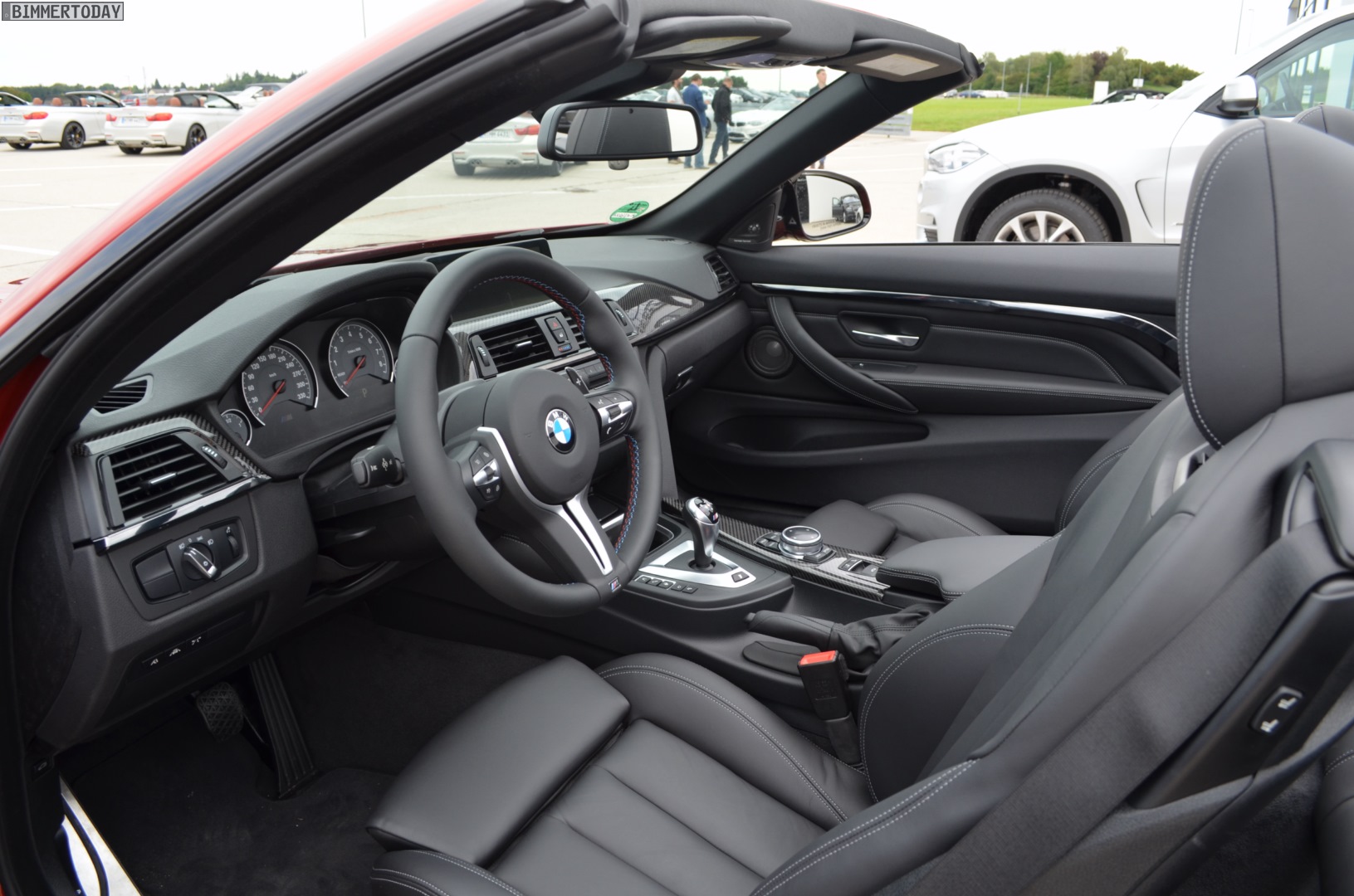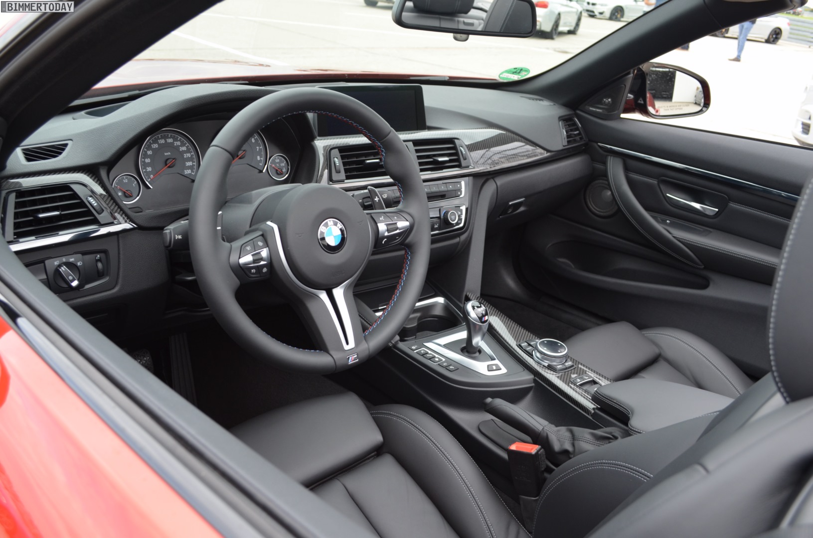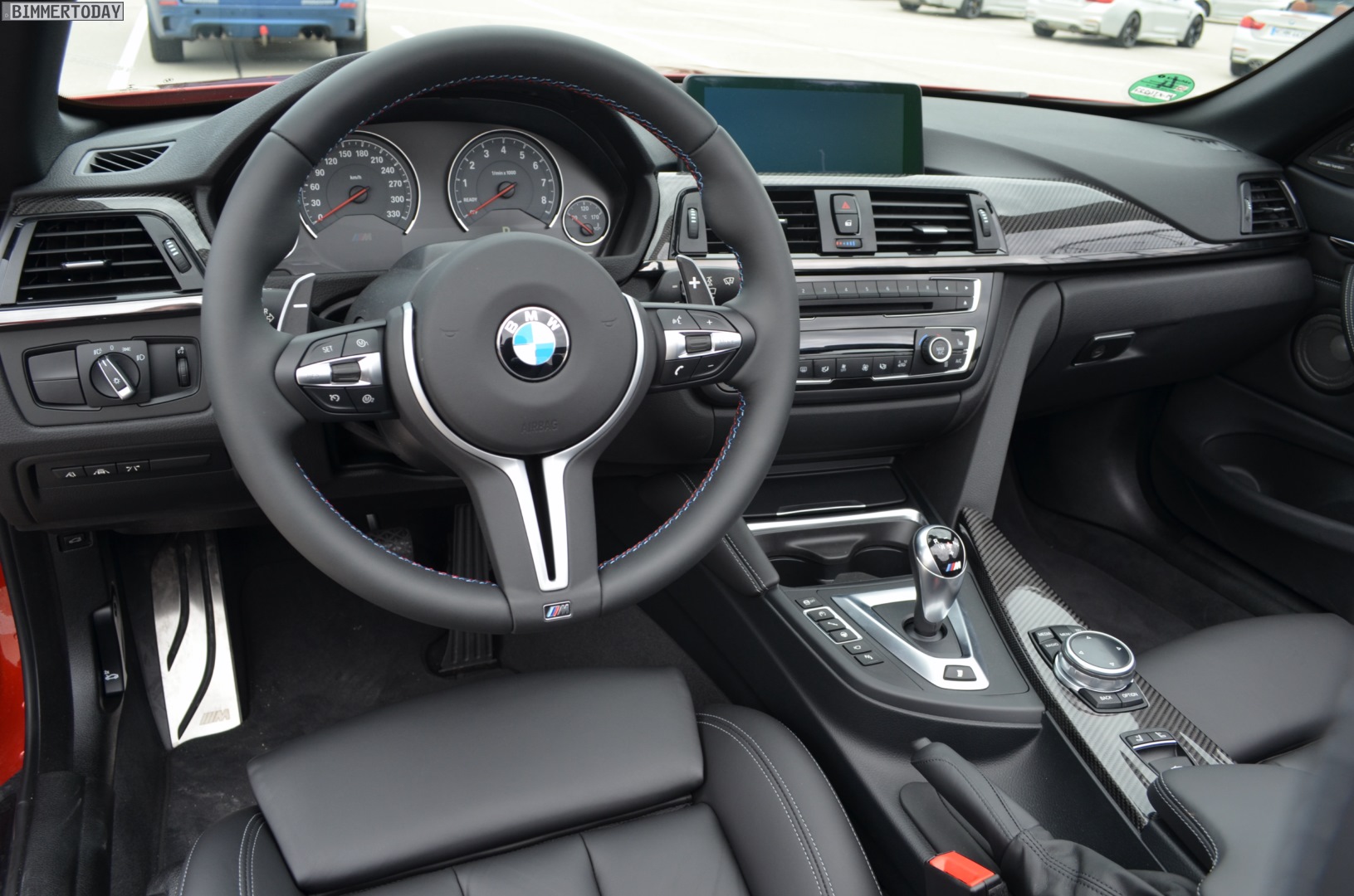 Das auf den folgenden Bildern abgelichtete BMW M4 Cabrio in Sakhir Orange trägt zwar noch einen “Werkstestwagen”-Schriftzug am Heck, entspricht aber vollständig dem Serien-Stand der US-Version. Genau wie alle anderen offenen M4 beschleunigt auch dieses Modell 0,7 Sekunden schneller auf 100 als der Vorgänger mit V8-Triebwerk.