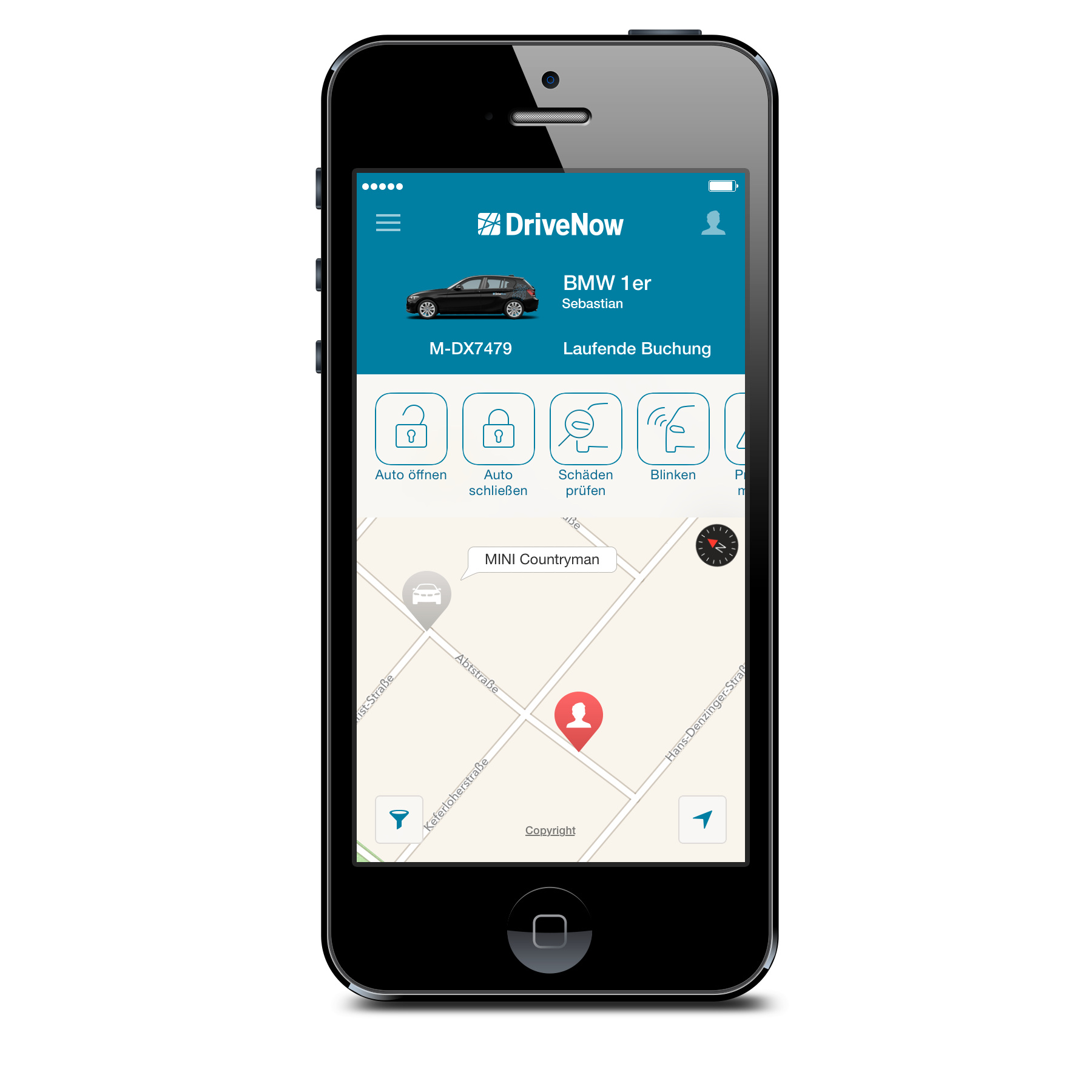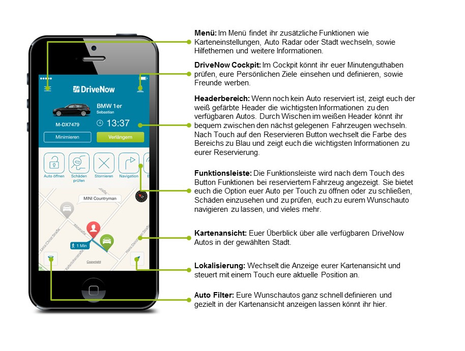- Über die DriveNow App können die nächstgelegenen Fahrzeuge gefunden und mit einem Touch reserviert werden