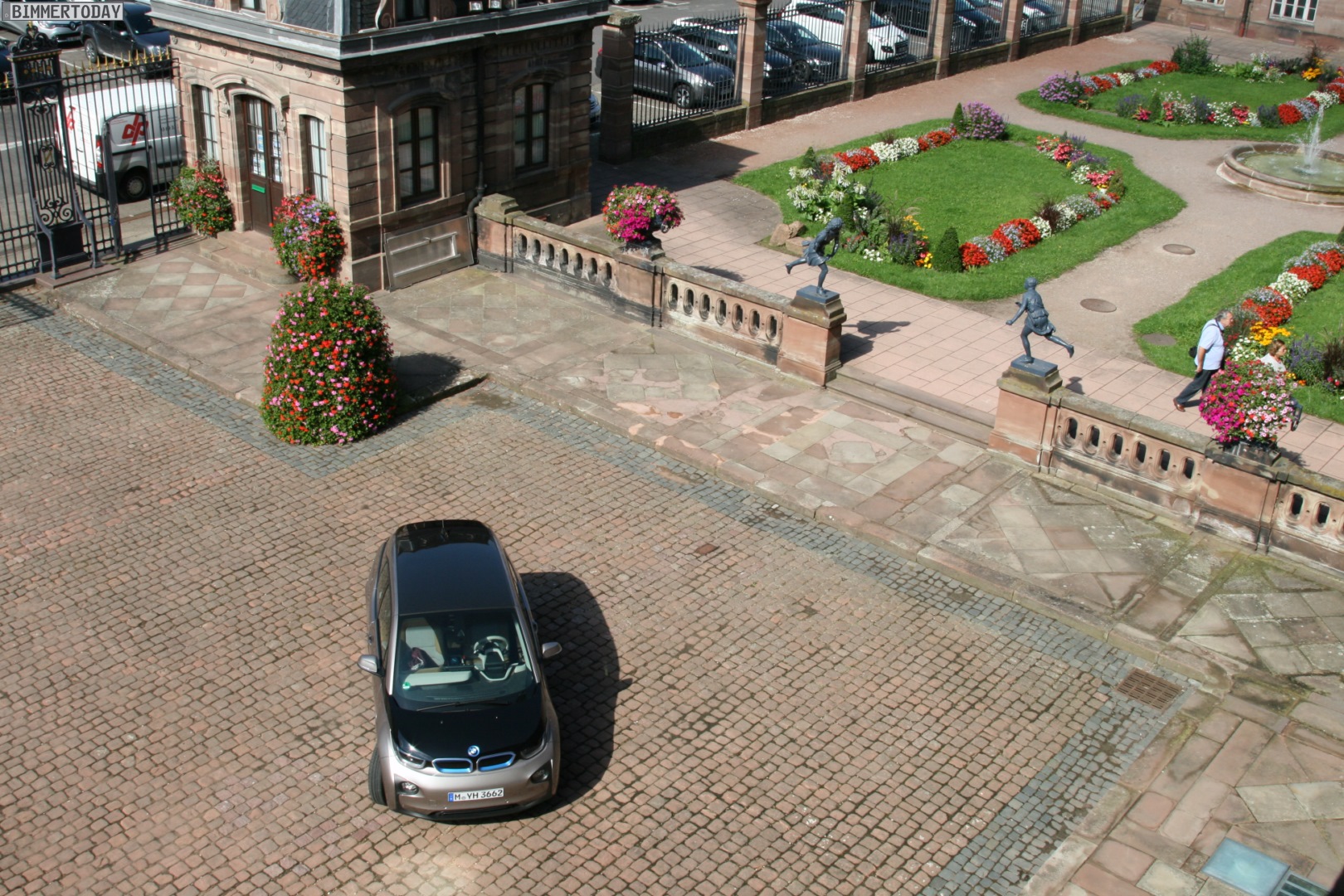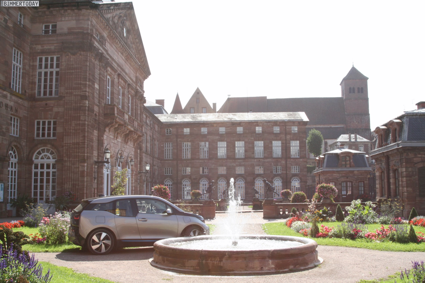 Als etwas später das Ladekabel wieder in seiner Tasche im Bug des i3 verstaut ist und wir unser Reisegepäck wie üblich in Kofferraum und Fond gepackt haben, fahren wir ein paar Meter in die Innenstadt. Bereits am Abend hatten wir uns in Saverne umgesehen, auf der Suche nach einem Restaurant, das auch nach halb 10 noch warme Küche anbietet. Zwar waren am Ende ein paar belegte Baguettes unser einziger Trost, doch dafür entstand der Plan, heute ein paar Fotos mit dem i3 vor den Toren des gewaltigen Stadtschlosses „Espace de Rohan“ zu machen.