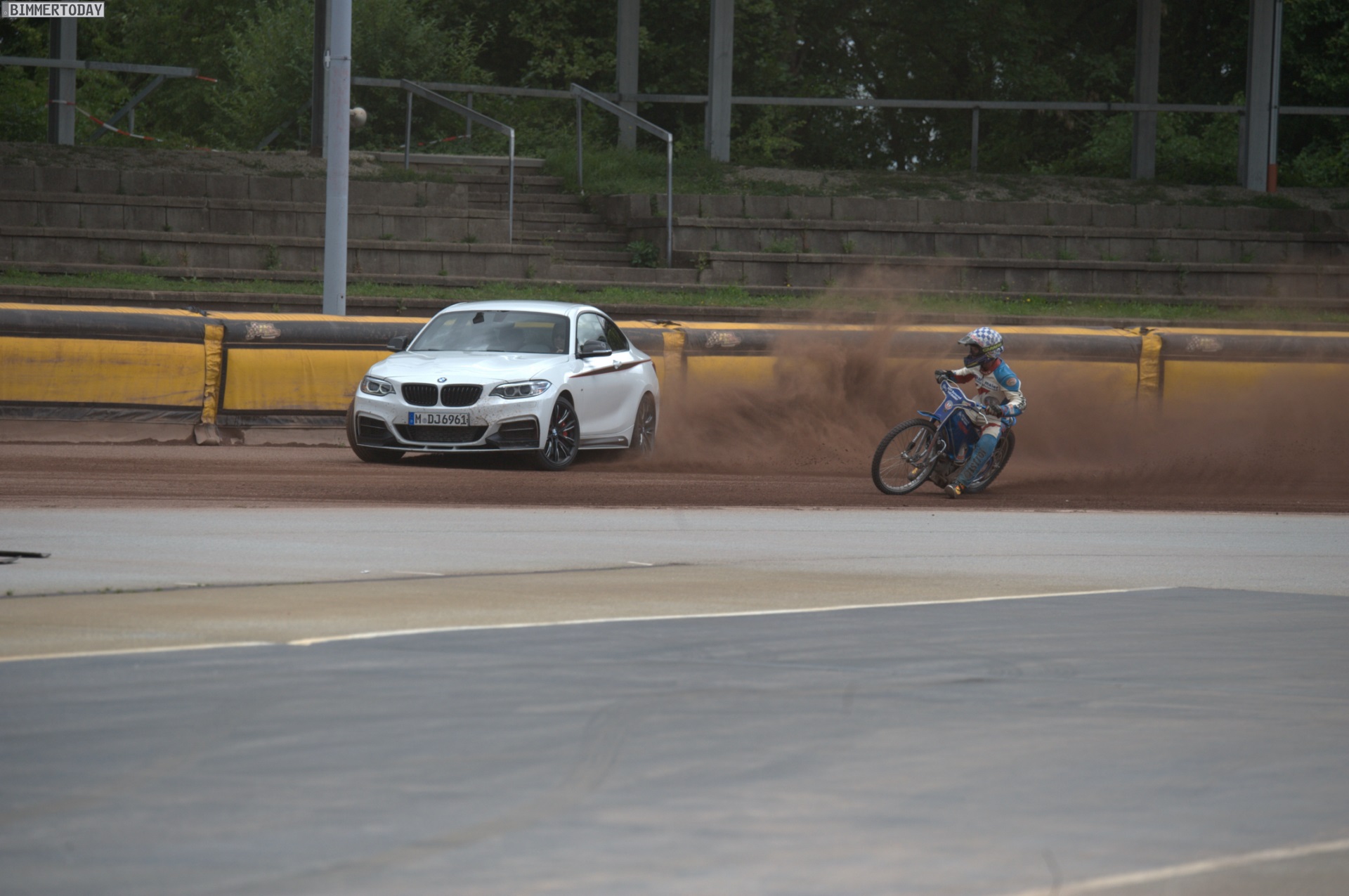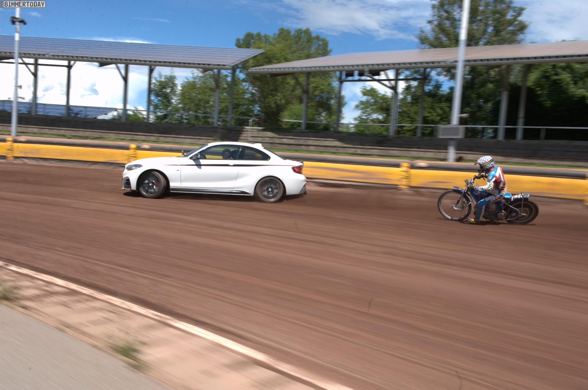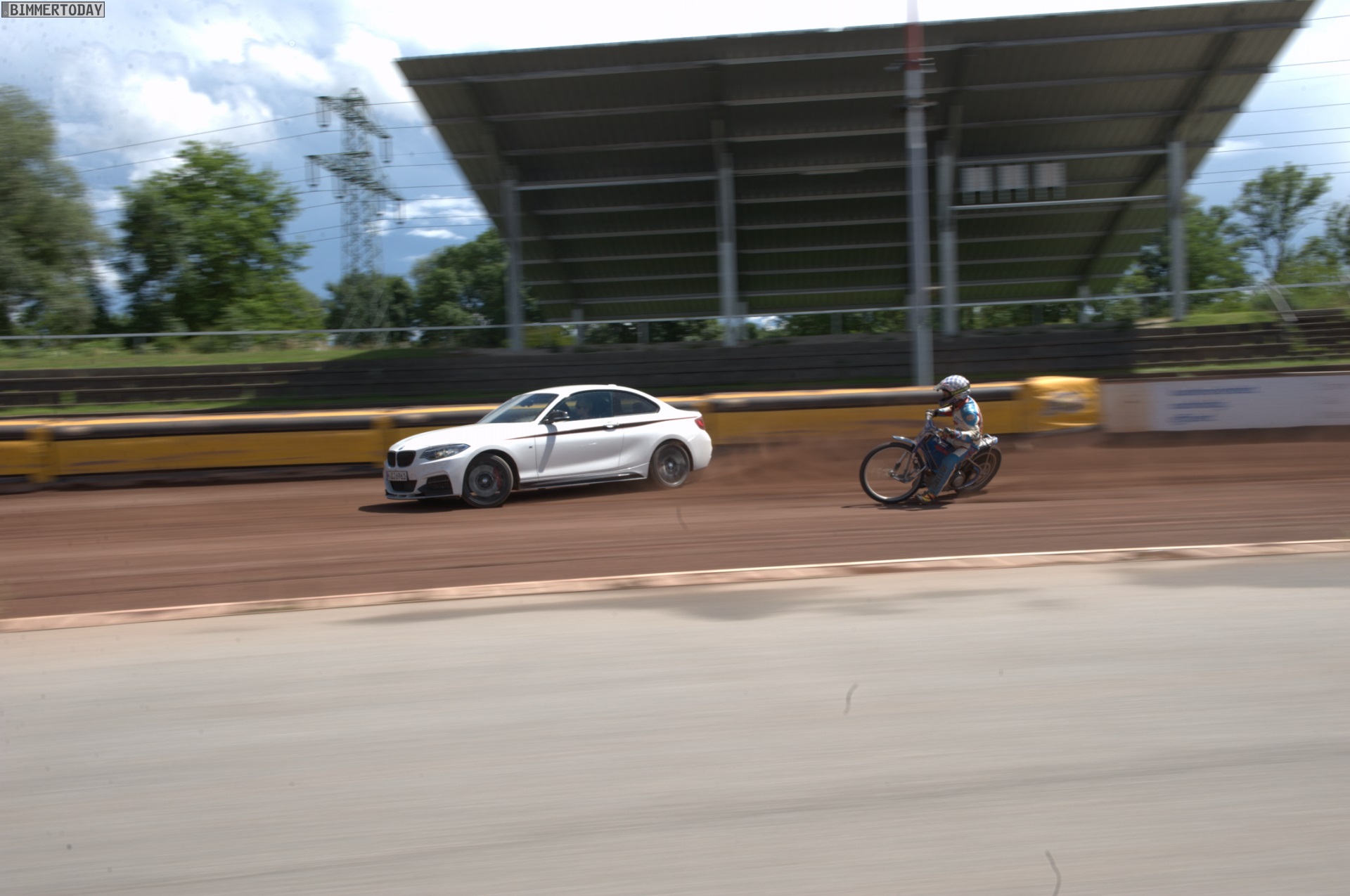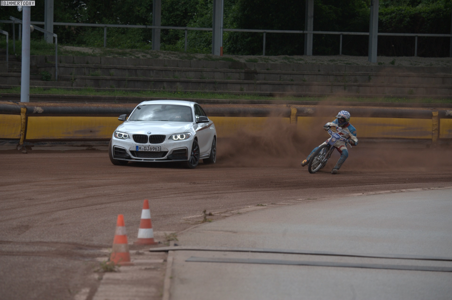 Nun durfte sich ein Journalist am Steuer des BMW M235i mit M Performance Zubehör von den Vorzügen des Kompaktsportlers überzeugen und diesen auf der Sandbahn des AC Landshut dauerhaft quer bewegen: Im Duell mit dem vierfachen Sandbahn-Weltmeister Karl Maier, der auf einem speziell für diesen Untergrund optimierten Motorrad antrat, sollten beide Fahrer ihre Fahrzeuge möglichst lange im Drift halten.