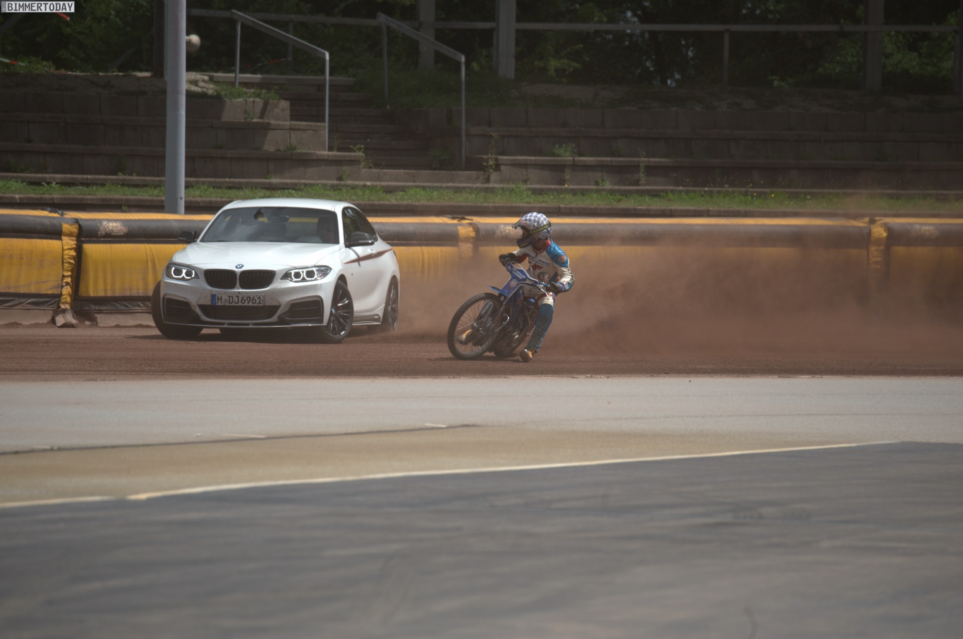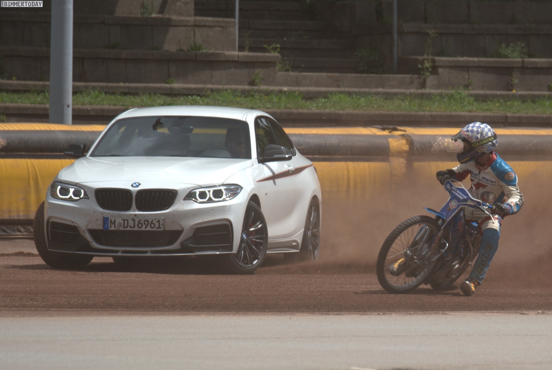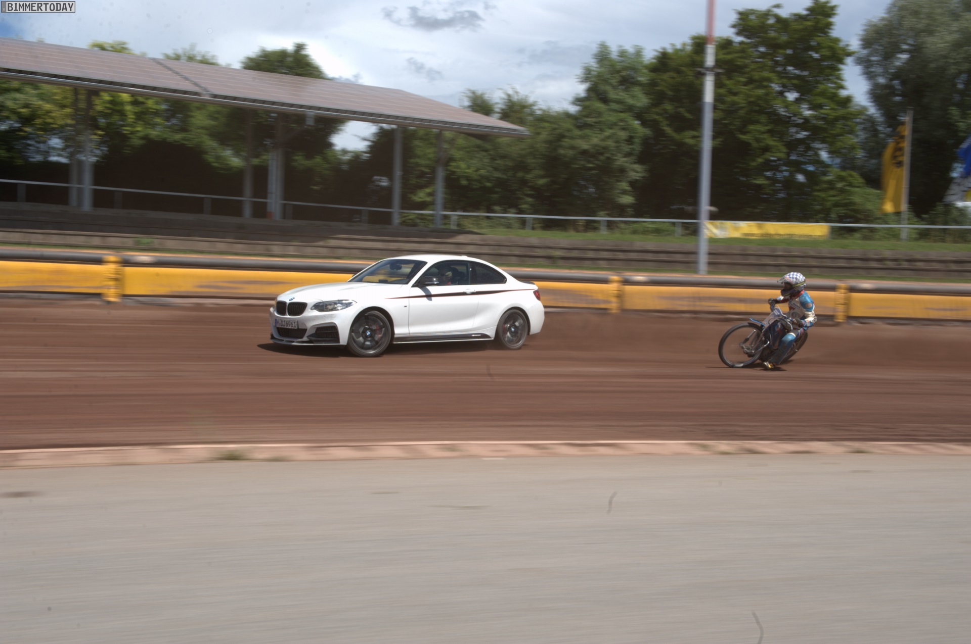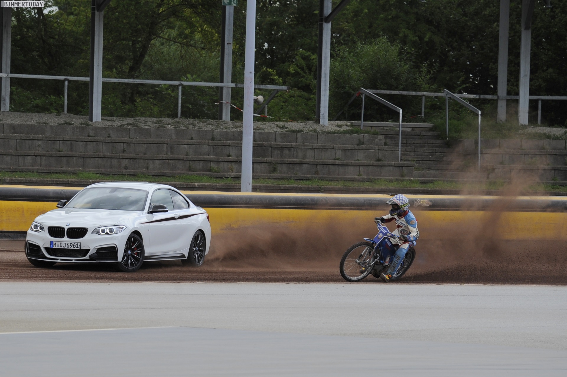 Nun durfte sich ein Journalist am Steuer des BMW M235i mit M Performance Zubehör von den Vorzügen des Kompaktsportlers überzeugen und diesen auf der Sandbahn des AC Landshut dauerhaft quer bewegen: Im Duell mit dem vierfachen Sandbahn-Weltmeister Karl Maier, der auf einem speziell für diesen Untergrund optimierten Motorrad antrat, sollten beide Fahrer ihre Fahrzeuge möglichst lange im Drift halten.