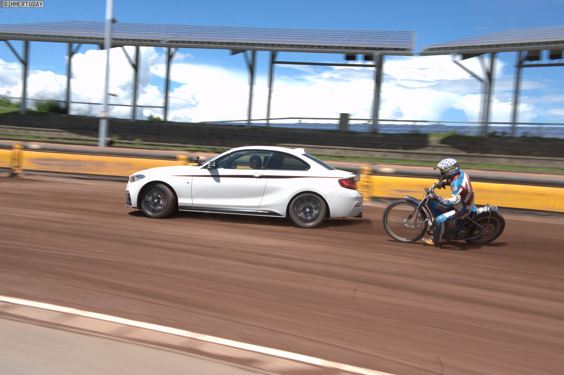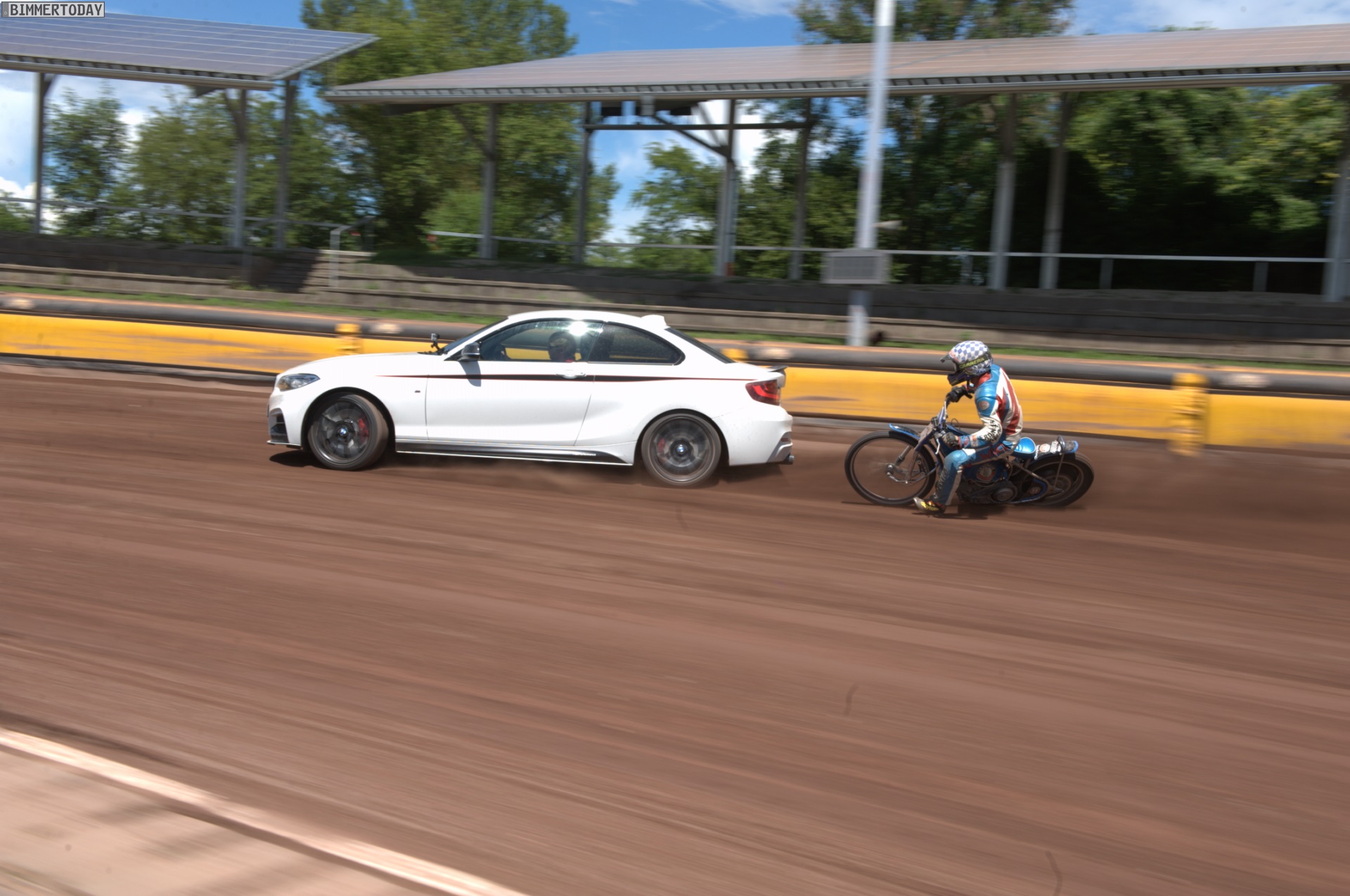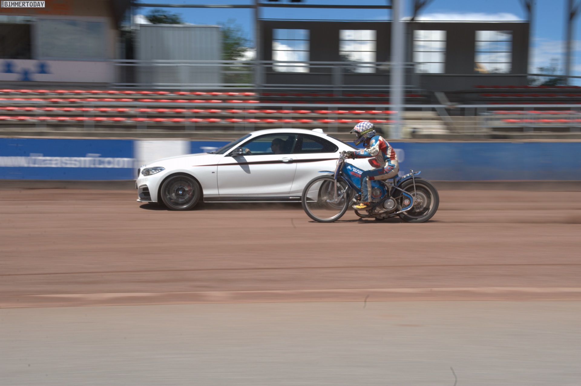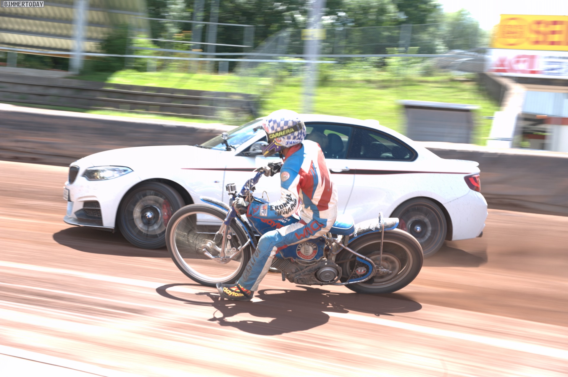 Nun durfte sich ein Journalist am Steuer des BMW M235i mit M Performance Zubehör von den Vorzügen des Kompaktsportlers überzeugen und diesen auf der Sandbahn des AC Landshut dauerhaft quer bewegen: Im Duell mit dem vierfachen Sandbahn-Weltmeister Karl Maier, der auf einem speziell für diesen Untergrund optimierten Motorrad antrat, sollten beide Fahrer ihre Fahrzeuge möglichst lange im Drift halten.
