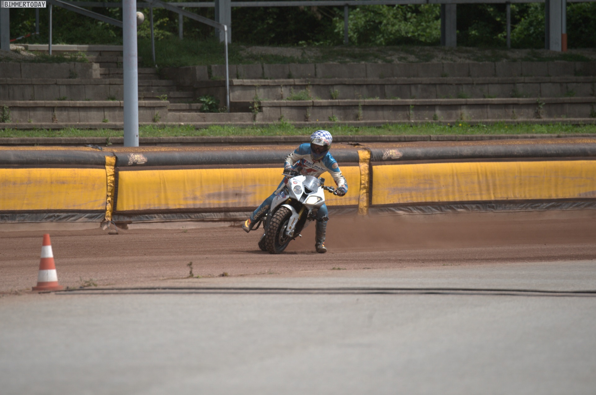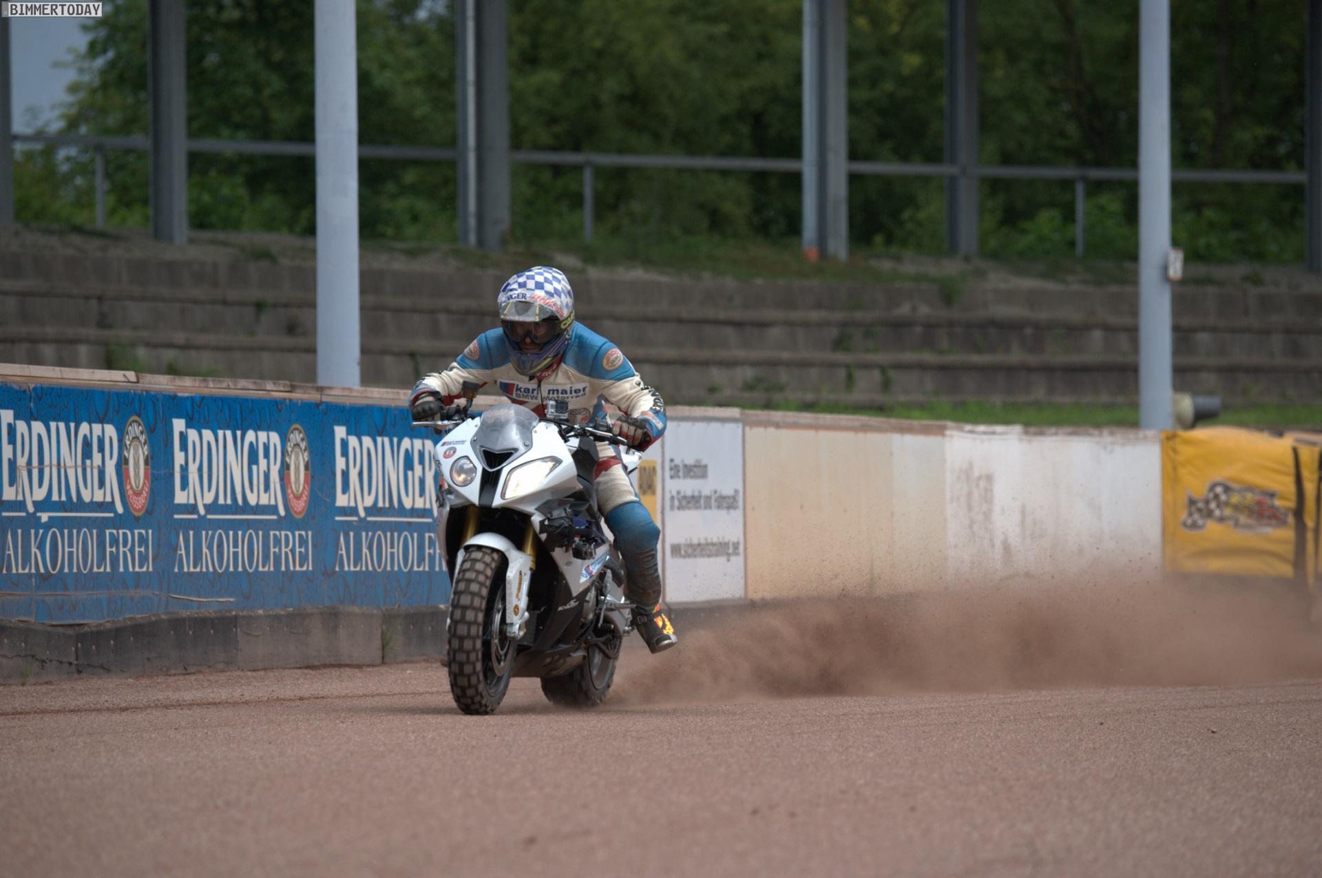 Weil Karl Maier auch nach fünf Stunden Driften noch nicht genug hatte, ging er im Anschluss mit einer speziell vorbereiteten BMW S 1000 RR auf die Strecke und driftete auch den Supersportler souverän über die Sandbahn.