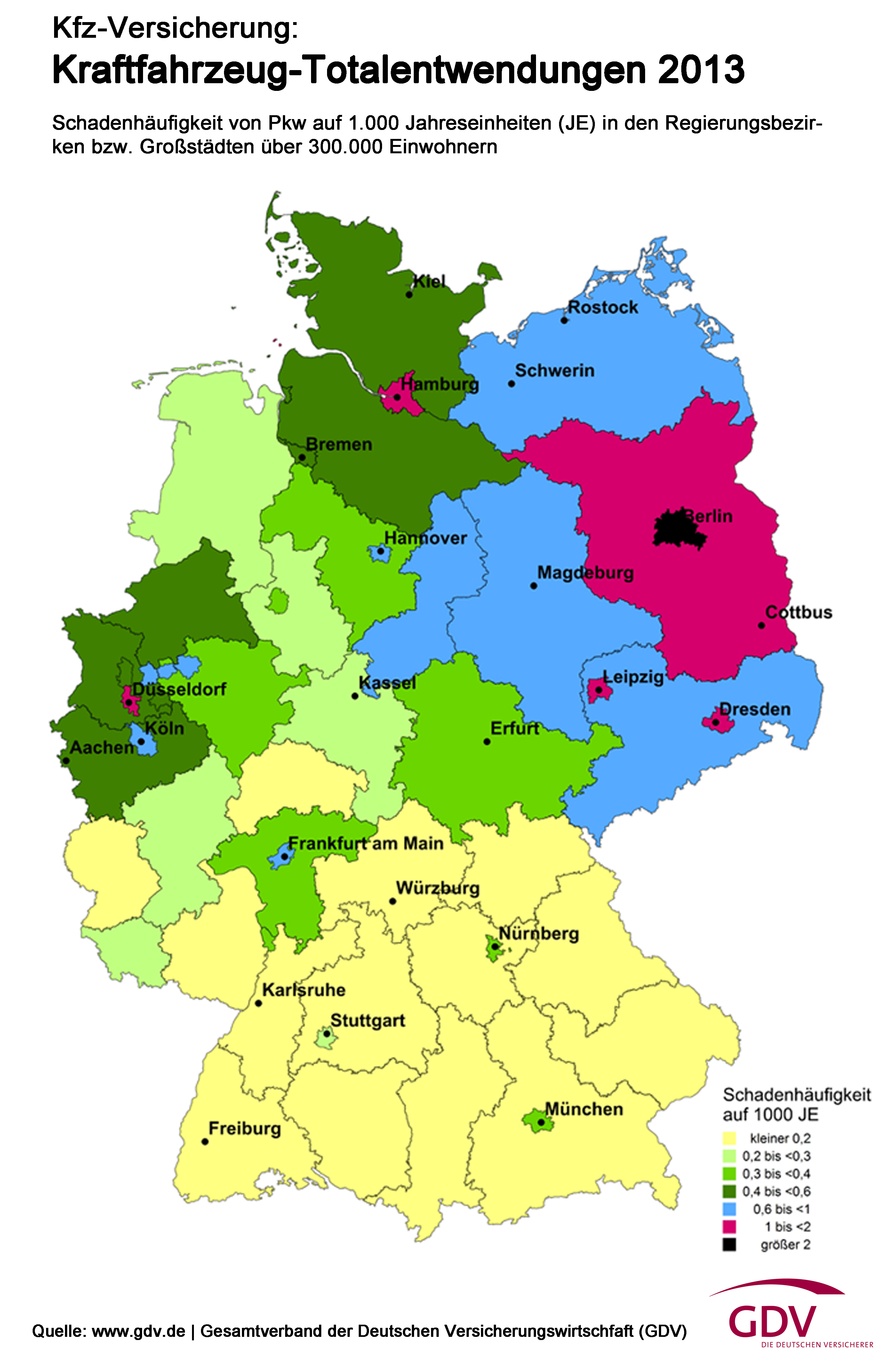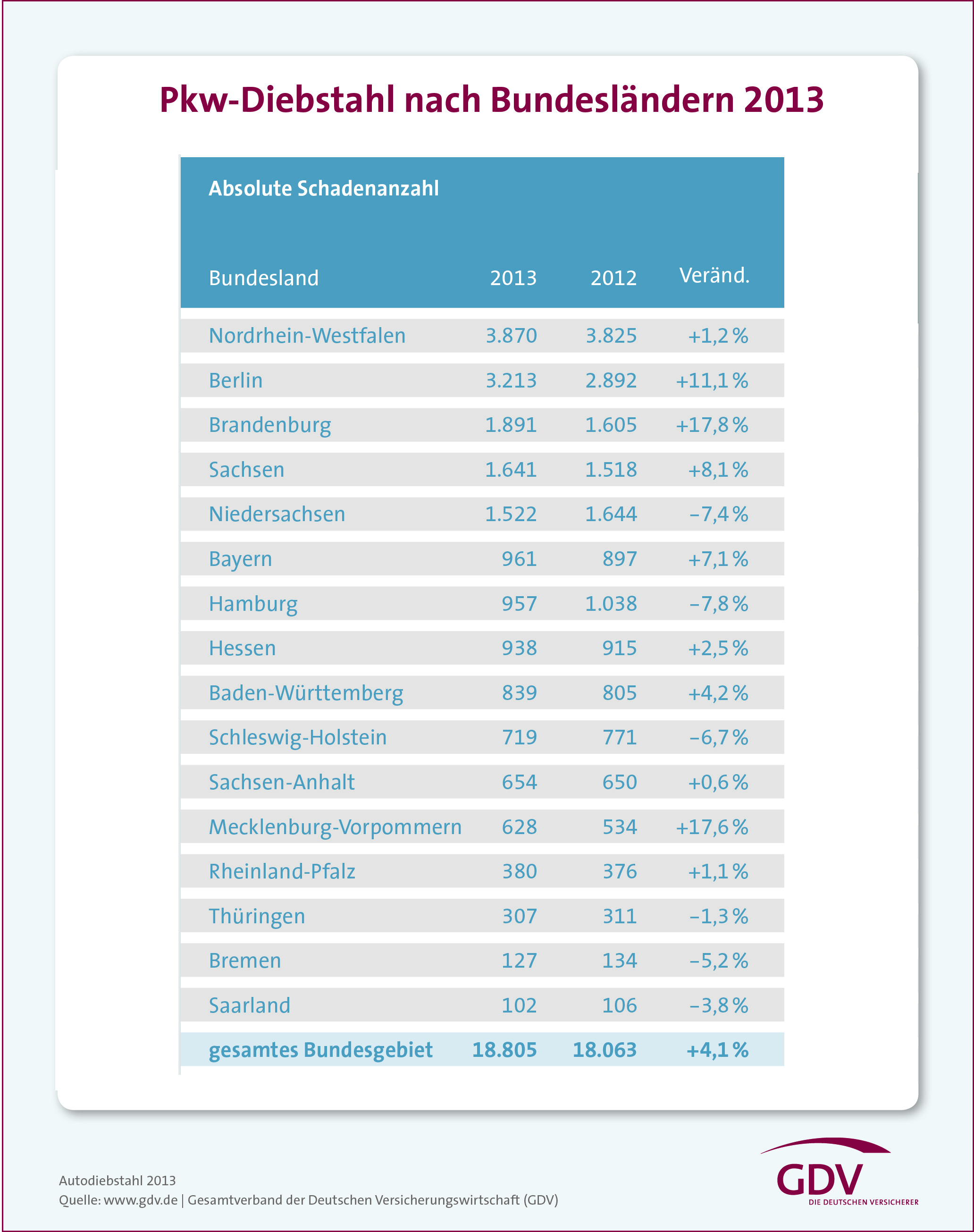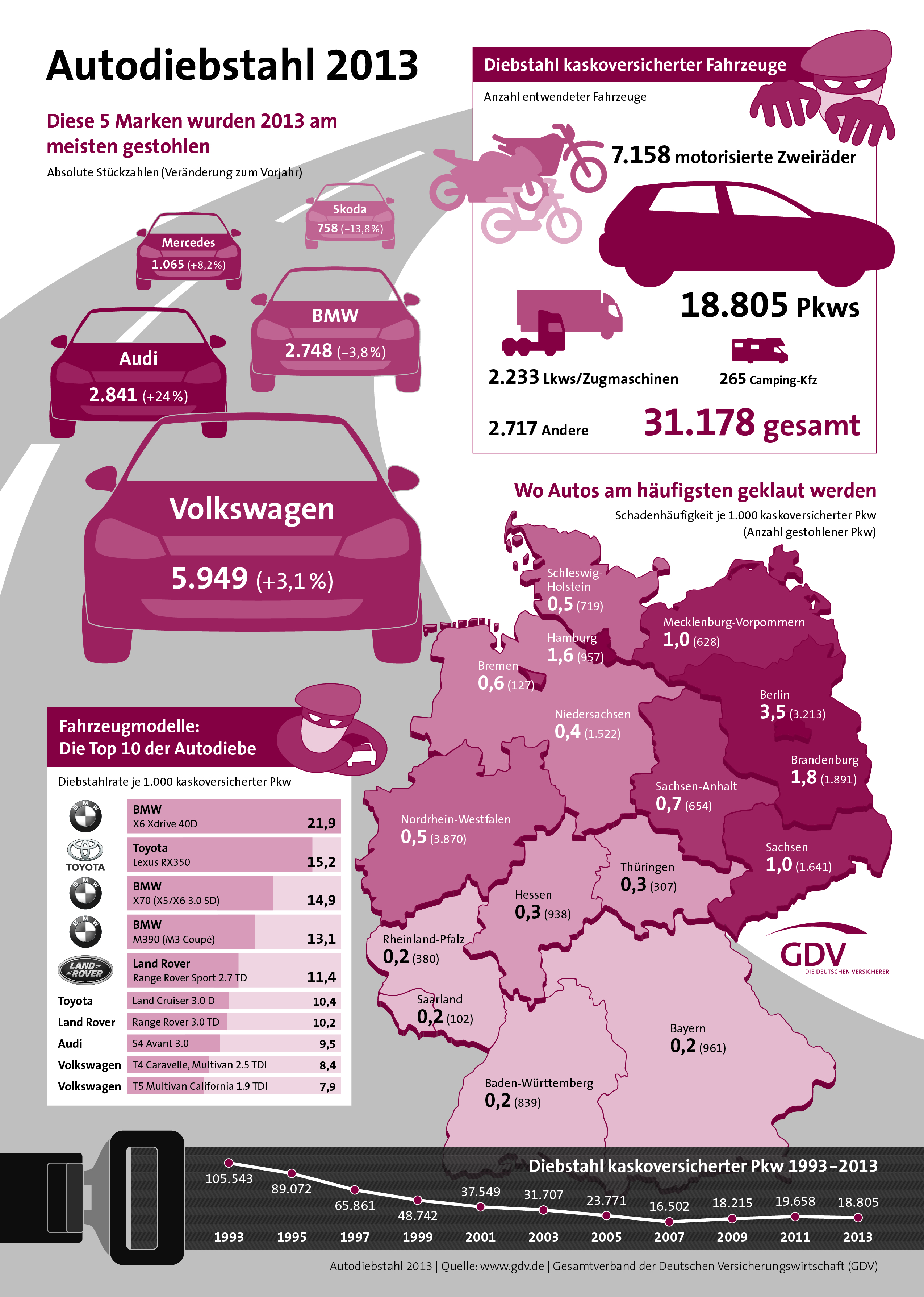 Regional betrachtet werden Fahrzeuge in den neuen Bundesländern und in Hamburg am häufigsten geklaut, besonders gering fällt die Diebstahl-Quote in Süddeutschland aus. Die Gesamtzahl von 18.805 geklauten Pkw liegt in etwa auf dem Niveau der letzten fünf Jahre und ist weit vom Maximum entfernt: 1993 wechselten unglaubliche 105.543 Fahrzeuge auf diese Art ihren Besitzer. Das Minimum wurde mit 16.134 geklauten Autos im Jahr 2008 erreicht.