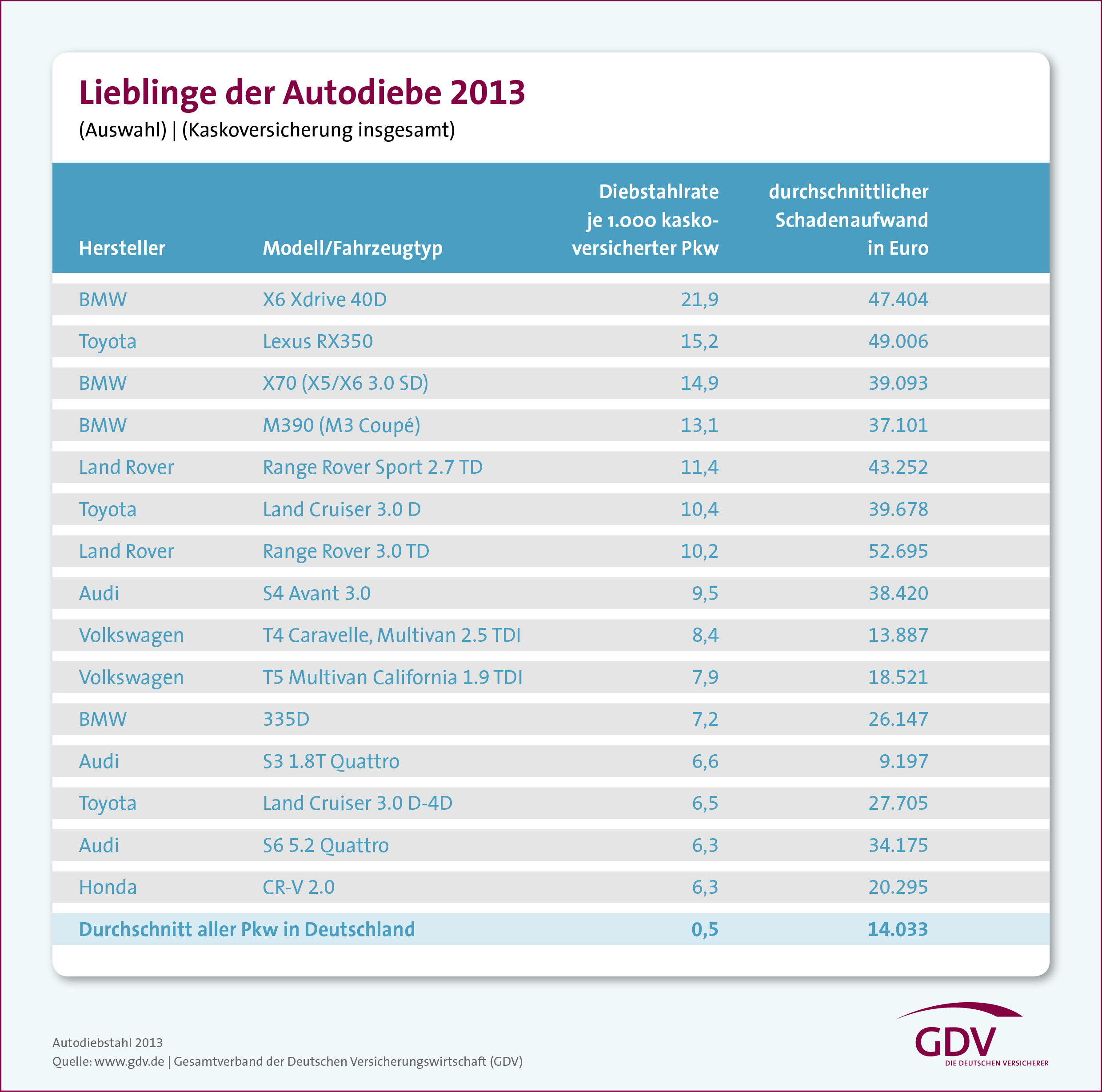 In Relation zu den Zulassungszahlen war der BMW X6 xDrive40d E71 das mit Abstand meistgeklaute Auto 2013: 21,9 von 1.000 kaskoversicherten Fahrzeugen wurden geklaut, der durchschnittliche Schadensaufwand lag bei 47.404 Euro. Auf dem zweiten Rang folgt der Lexus RX350, der vor allem dank seiner überschaubaren Zulassungszahlen so weit vorn im Ranking landet. Direkt dahinter folgen weitere SUV-Modelle aus München: Auch BMW X5 und X6 3.0d sowie das BMW M3 Coupé der Generation E92 wurden besonders häufig entwendet. Auf dem elften Rang findet sich mit dem BMW 335d ein weiterer gut motorisierter BMW.