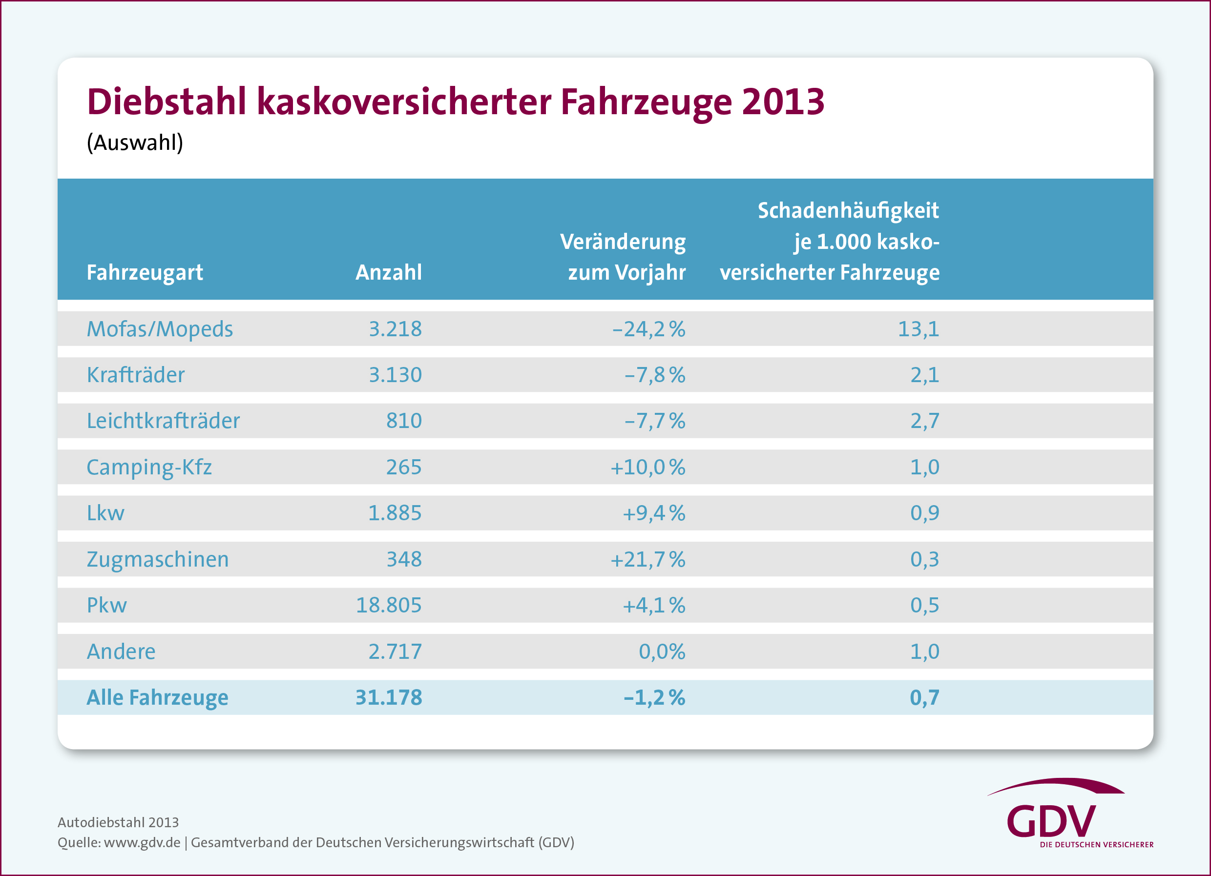 Alle weiteren Statistiken zeigen die Tabellen des Gesamtverbands der Deutschen Versicherungswirtschaft e.V.: