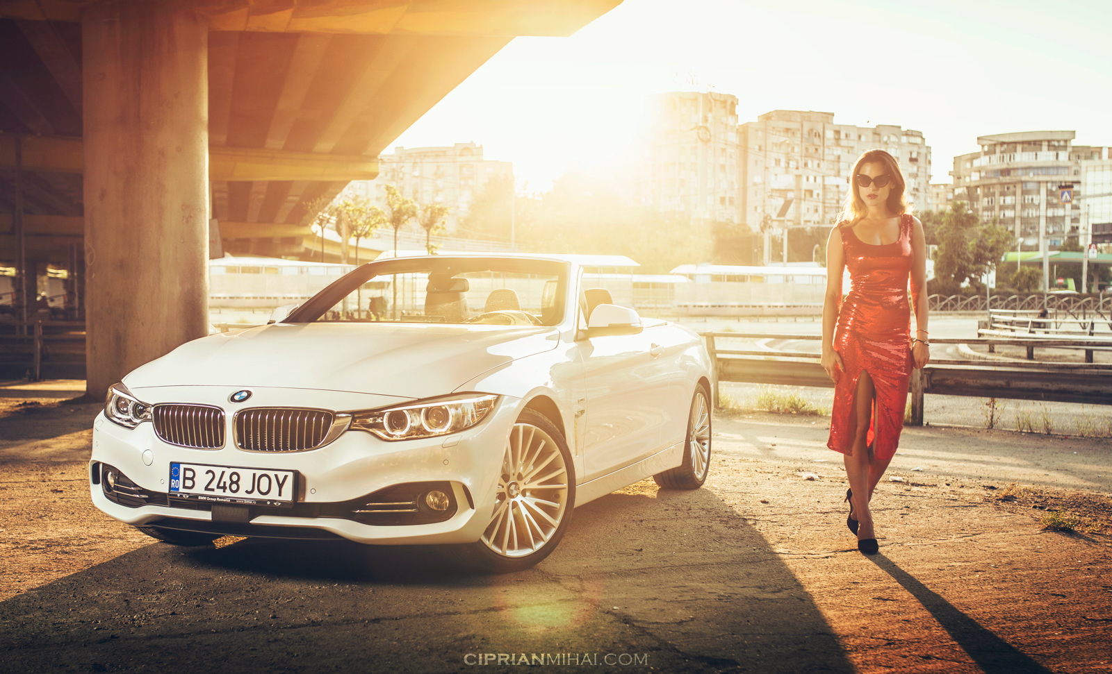 Während das Model Elena Horvath im rotem Kleid für den weiblichen Reiz der Bilder sorgt, hält das BMW 4er Cabrio F33 mit Luxury Line und weißer Lackierung dagegen: