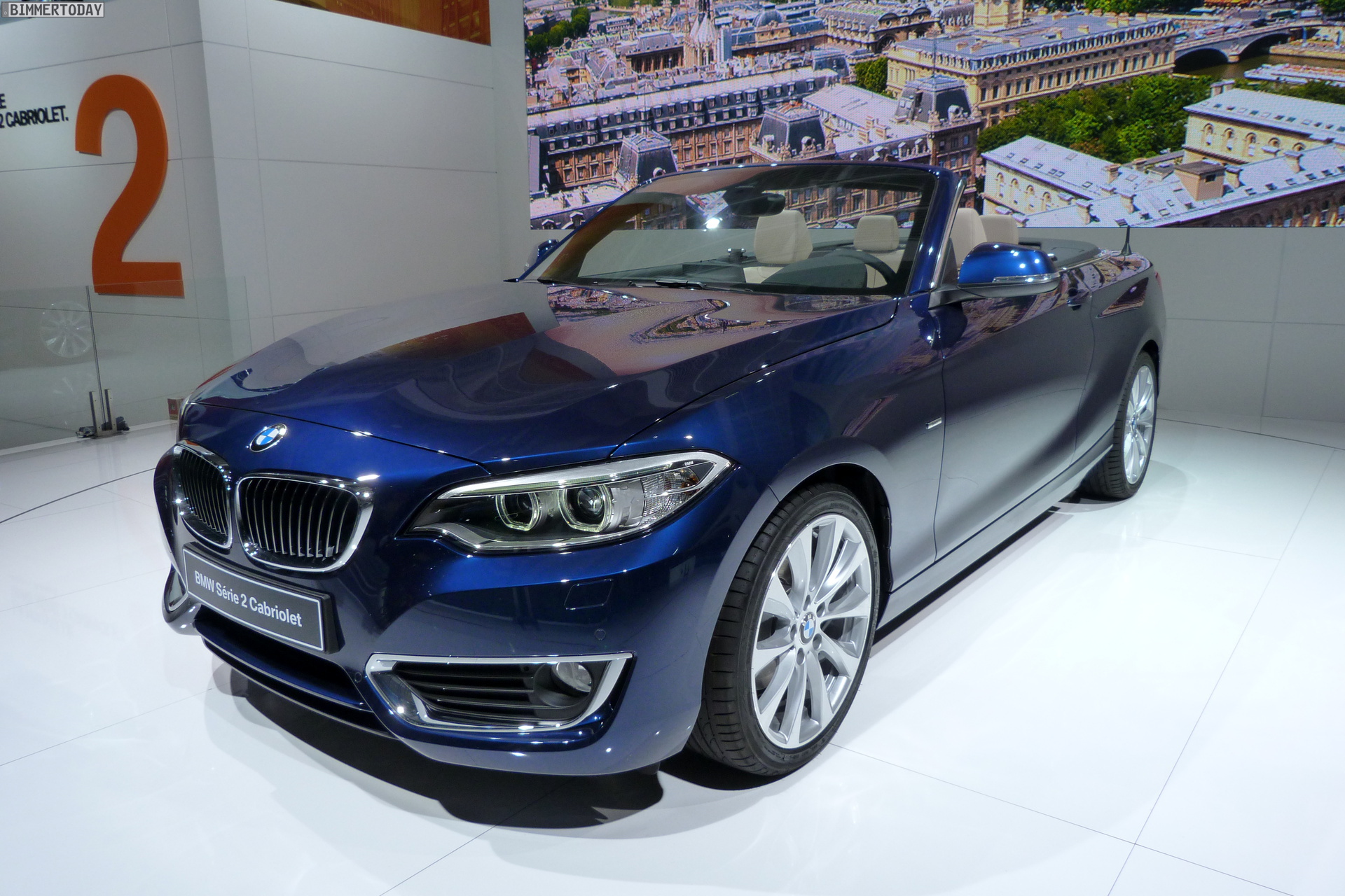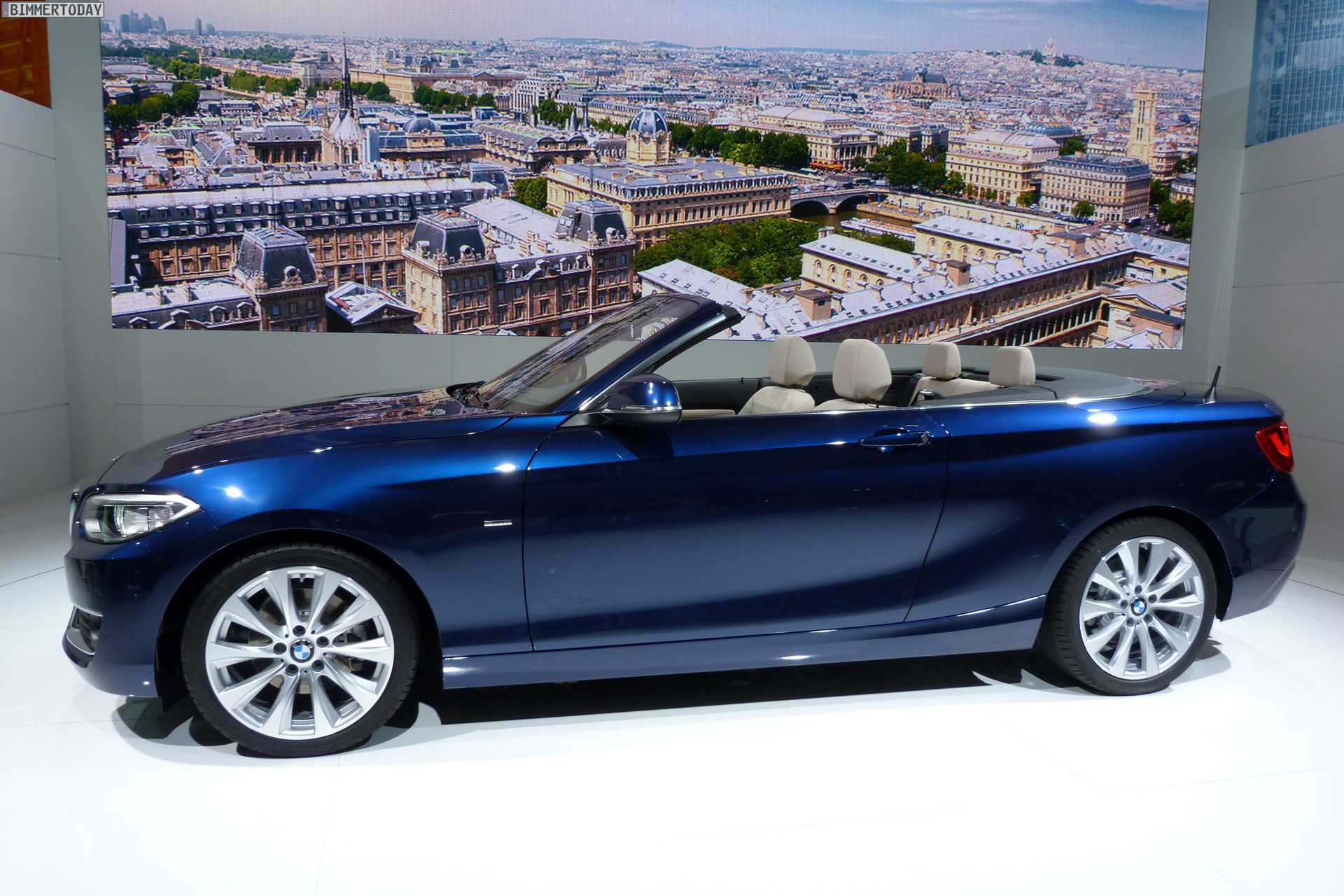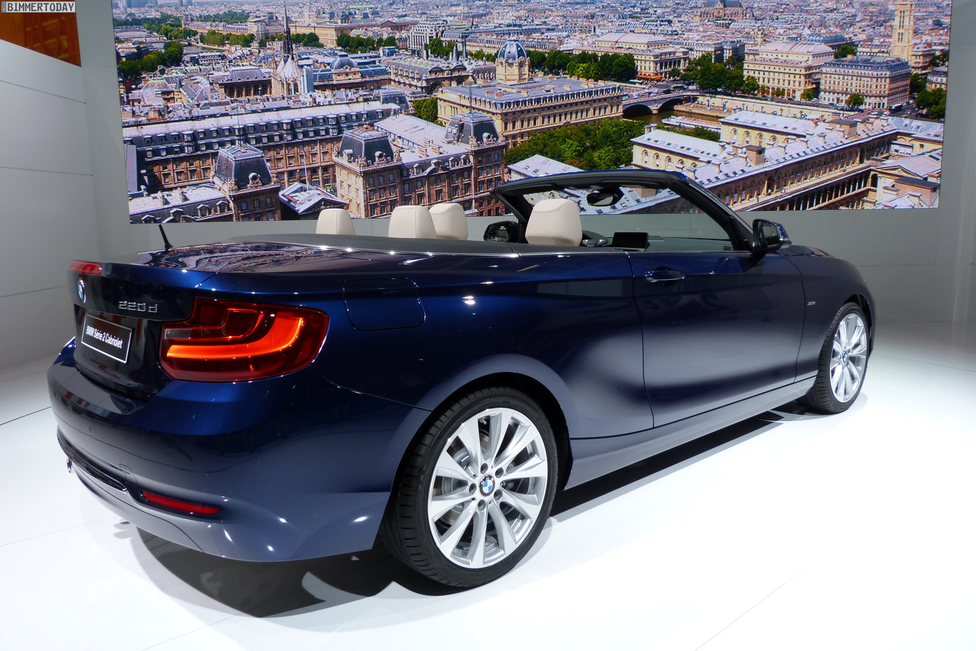 In Paris zeigt BMW das neue 2er Cabrio als 220d in Tiefseeblau metallic mit Luxury Line und als 220i in Glaciersilber metallic mit Sport Line. Im Vergleich mit dem BMW 2er Coupé liegen die Aufpreise für das Cabrio im Bereich von 5.000 Euro, für ein identisch motorisiertes BMW 4er Cabrio F33 mit Metall-Klappdach verlangt BMW teilweise über 8.000 Euro mehr.