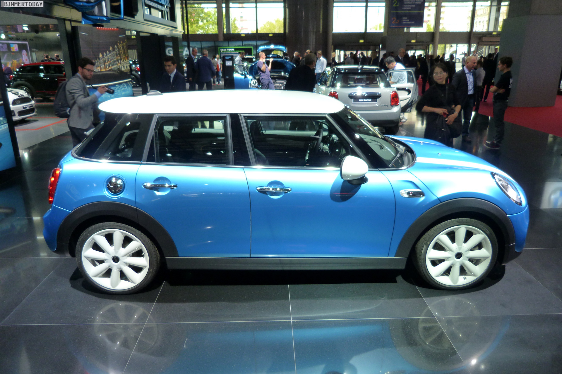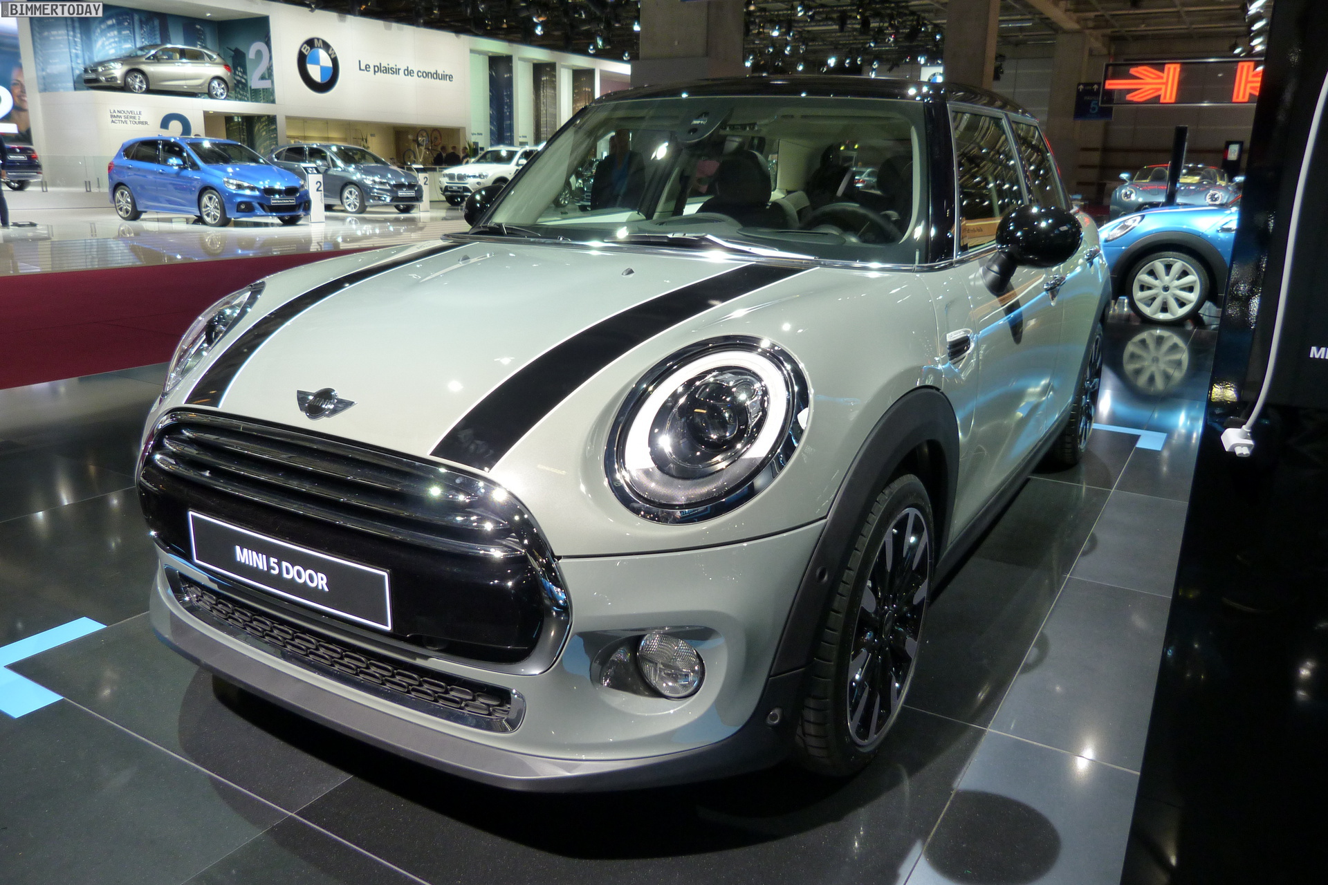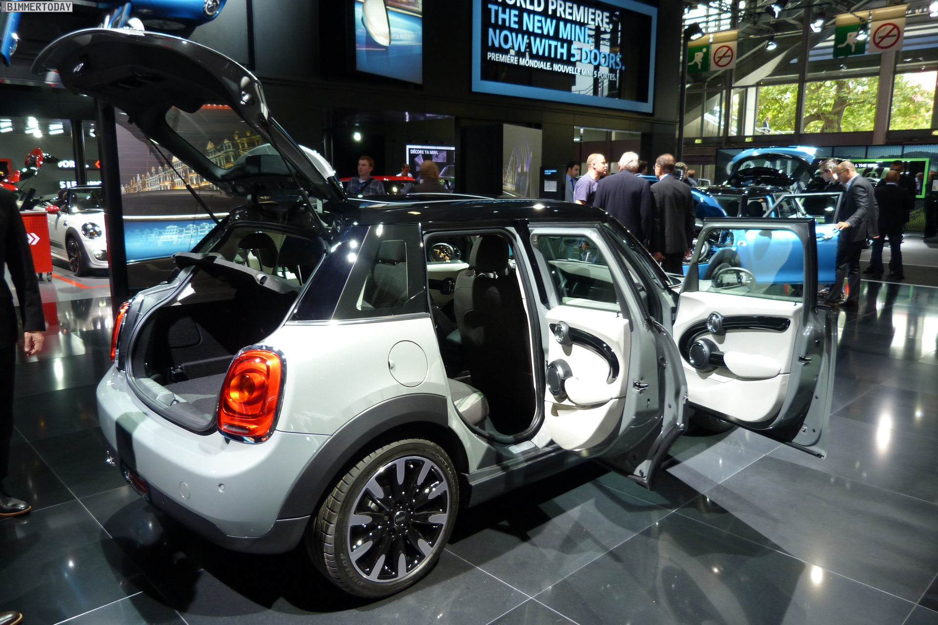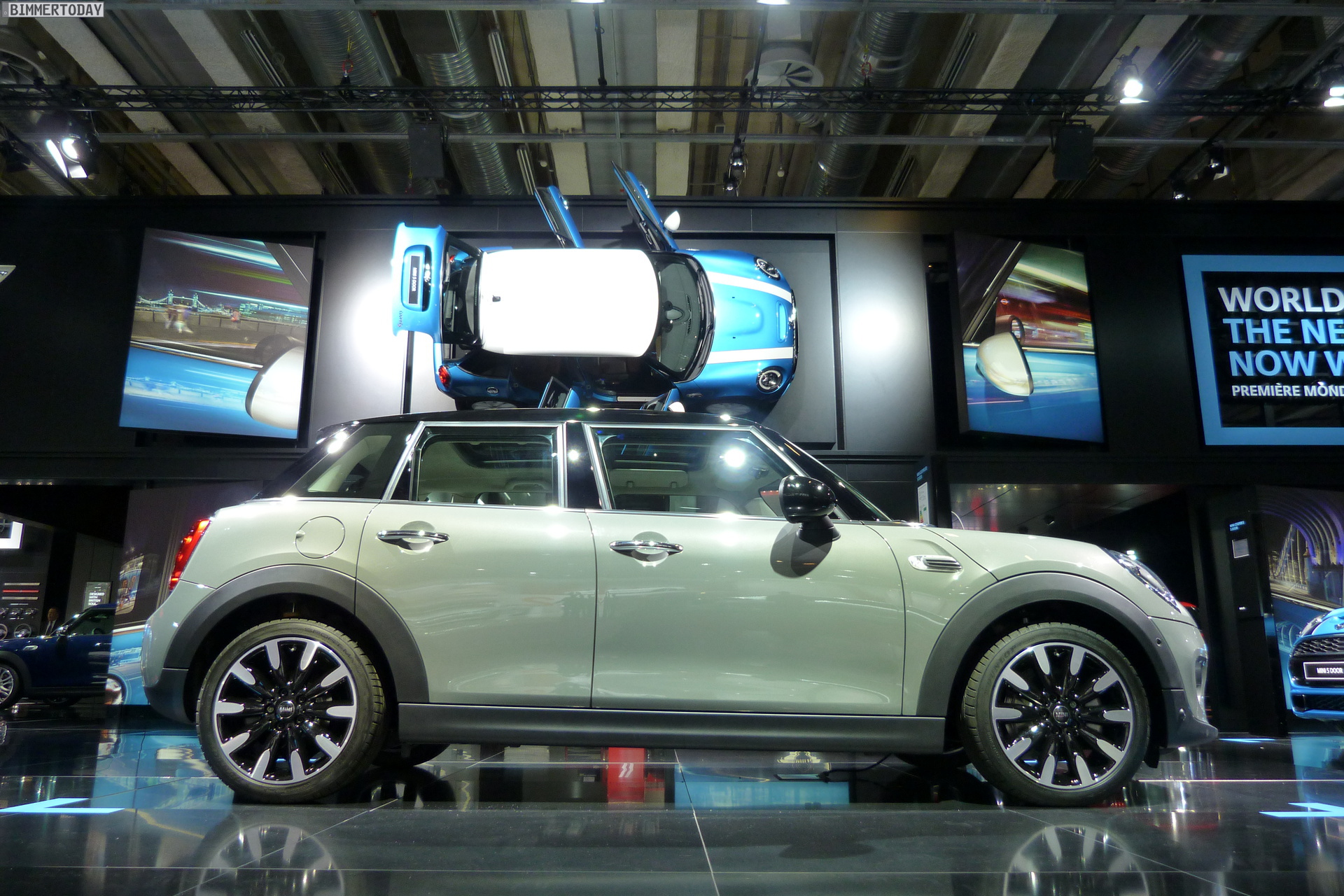 Eine weitere Weltpremiere der BMW Group auf dem Autosalon Paris 2014 steht wenige Meter vom BMW-Stand entfernt: Der neue MINI Fünftürer F55 steht in verschiedenen Farben auf dem Messestand der Briten und zeigt aus allen Perspektiven, dass er ein echter MINI ist. Obwohl seine Proportionen und Formen ganz klar die Sprache des MINI Hatch sprechen, ist er auch erkennbar anders – ohne allerdings das Gesamtbild nachhaltig zu stören.