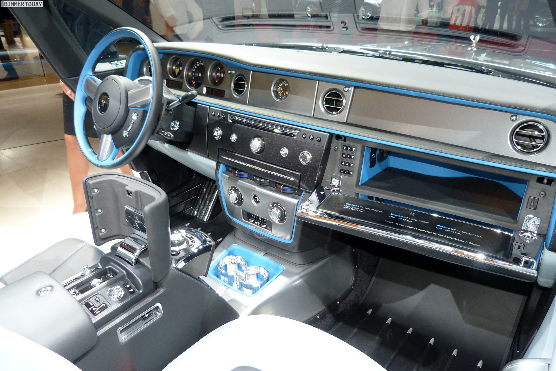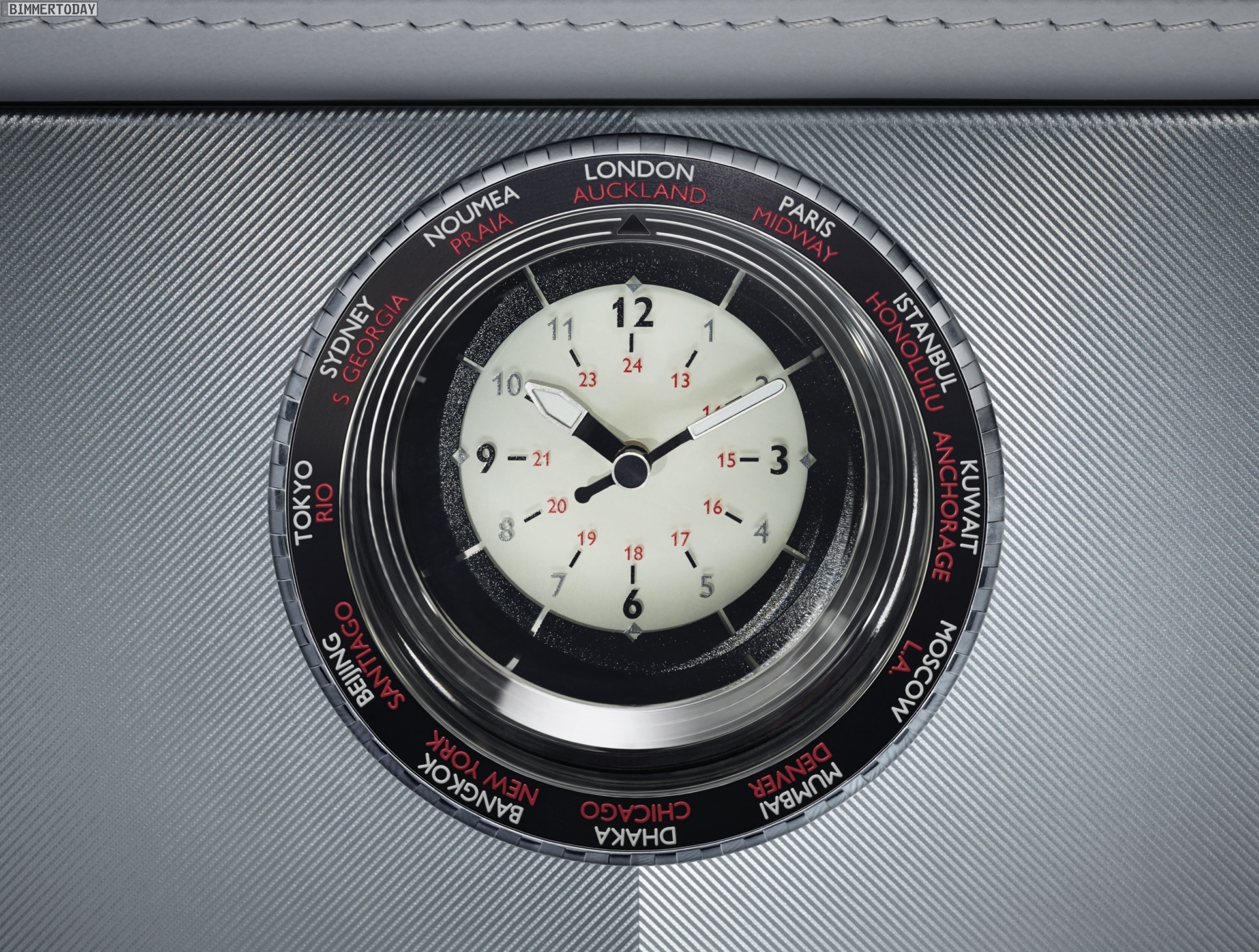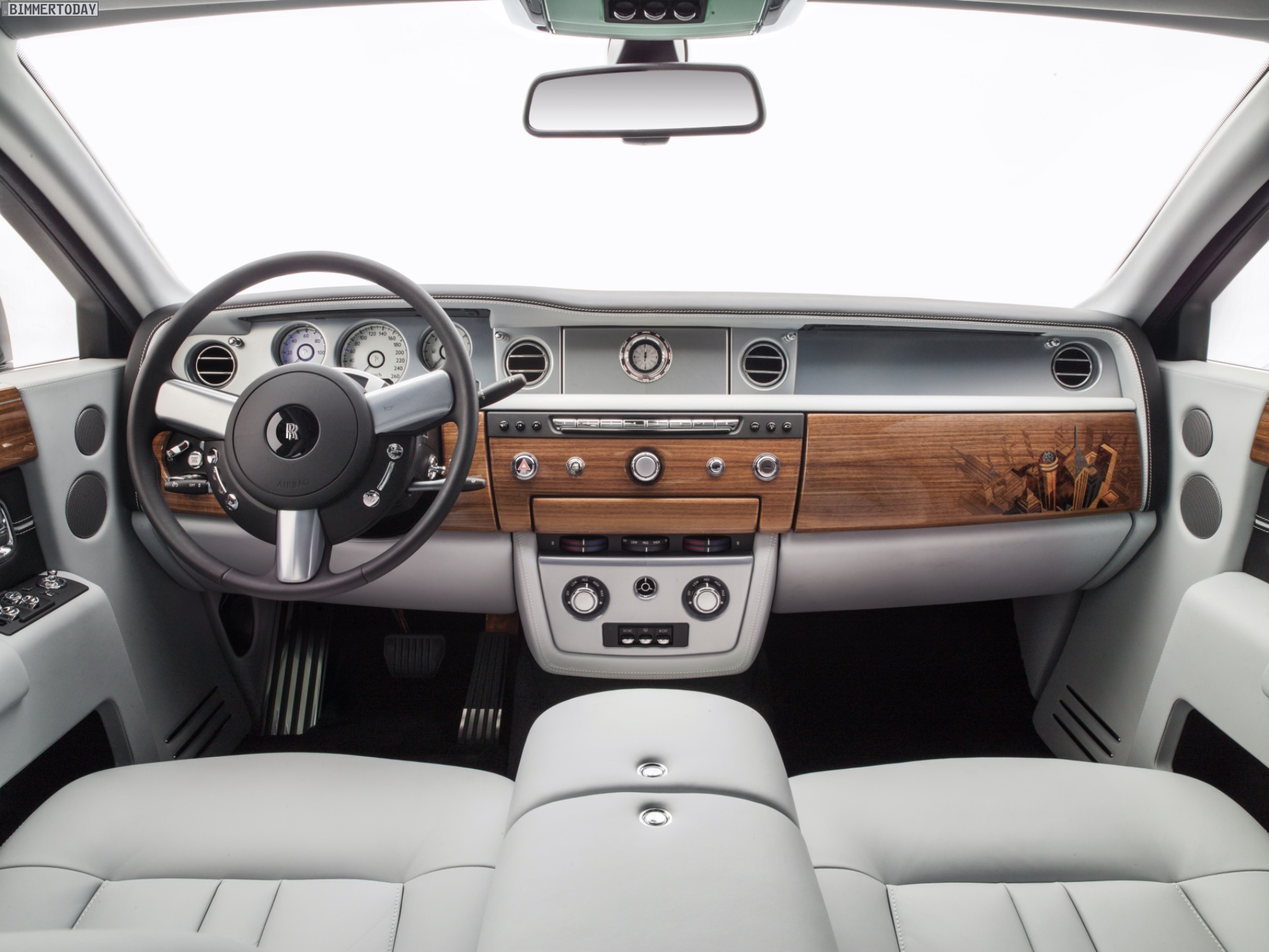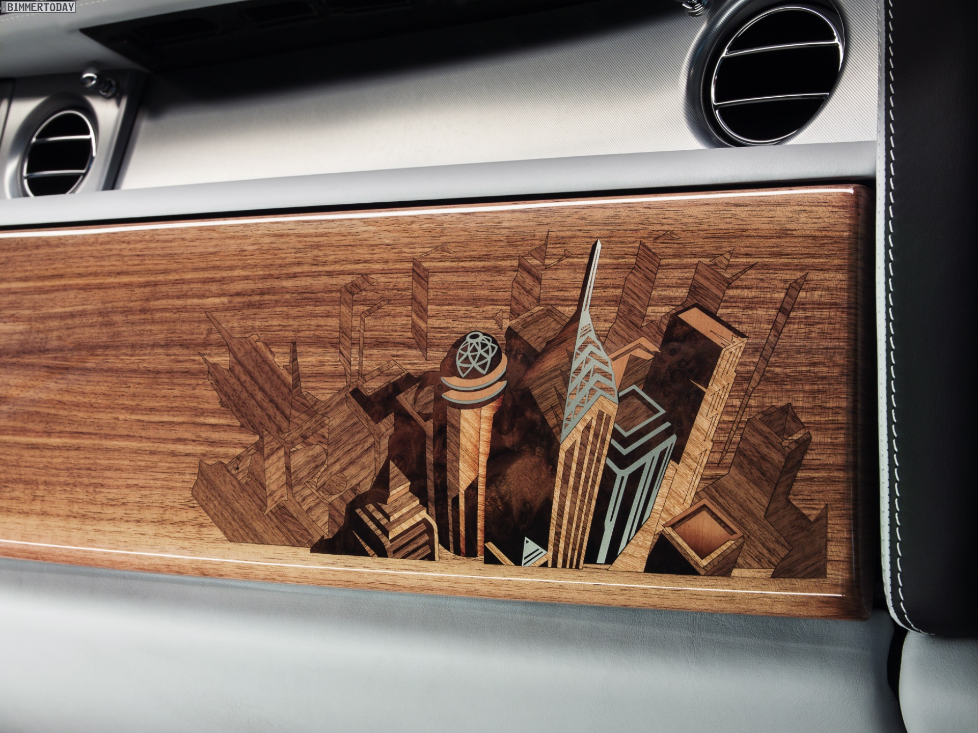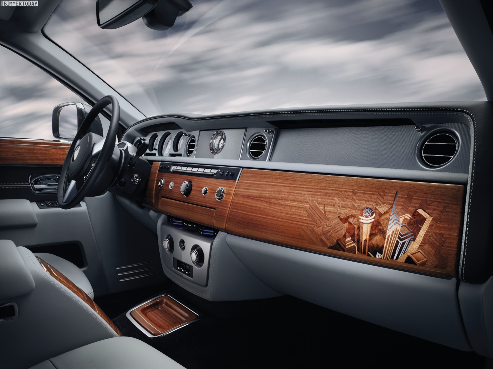Die dekorativen Holz-Elemente bestehen aus zahlreichen unterschiedlich gefärbten Holz-Teilchen und verlangen mehrere Tage Arbeitsaufwand, bevor sie so perfekt wie in den Fahrzeugen aus Goodwood aussehen. Auch die spezielle Uhr im Armaturenbrett greift das Megacity-Thema auf und liefert mit Hilfe von 24 weltberühmten Städten einen Überblick über die Zeitzonen der Welt.