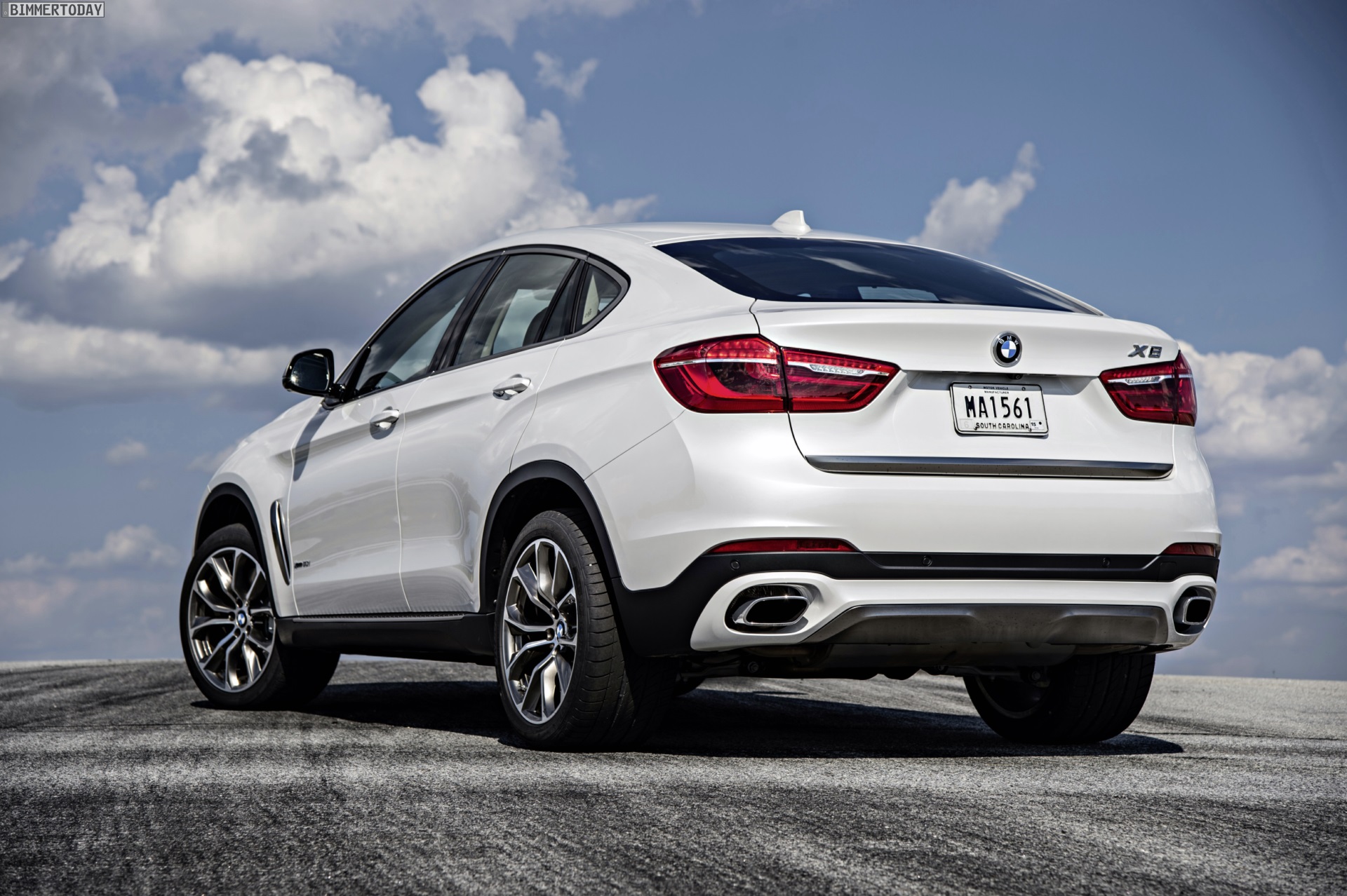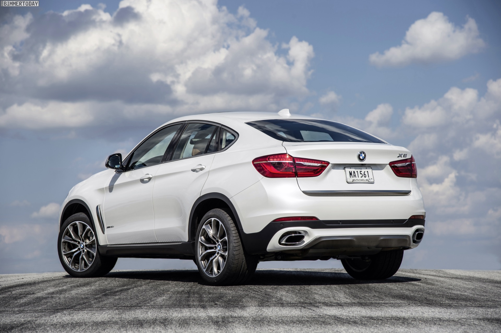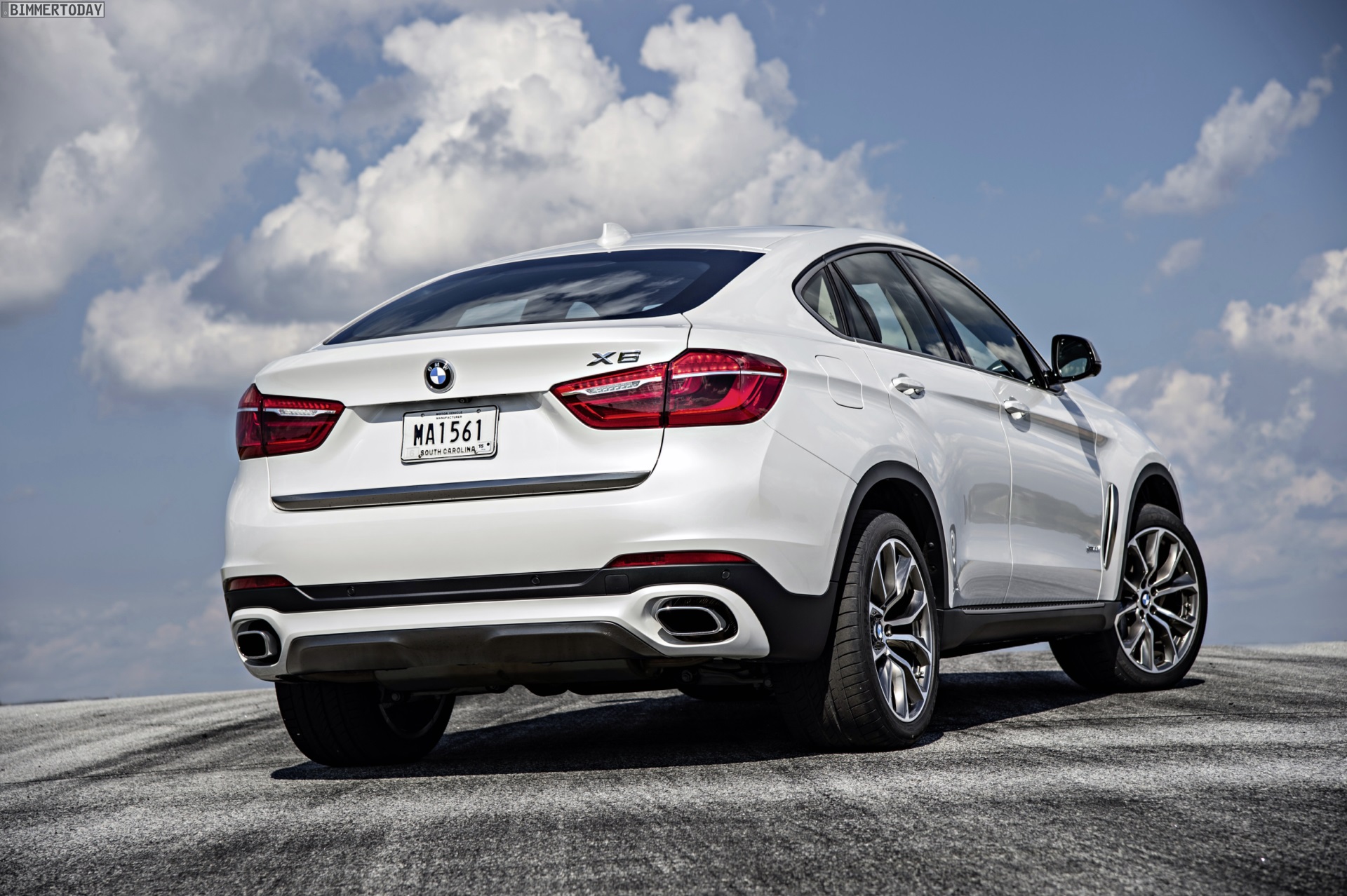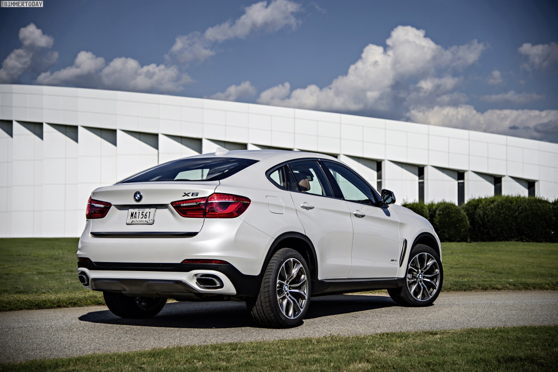 Noch mehr Eindrücke vom neuen BMW X6 F16 liefern zahlreiche zusätzliche Fotos aus Spartanburg. Im Fokus steht nun ein BMW X6 xDrive50i mit Design Pure Extravagance Paket und einer Lackierung in Mineralweiß Metallic. Die weiße Farbe sorgt zwar dafür, dass einige silberne Elemente des Ausstattungspakets in den Hintergrund rücken, betont aber die eleganten Linien der zweiten X6-Generation.