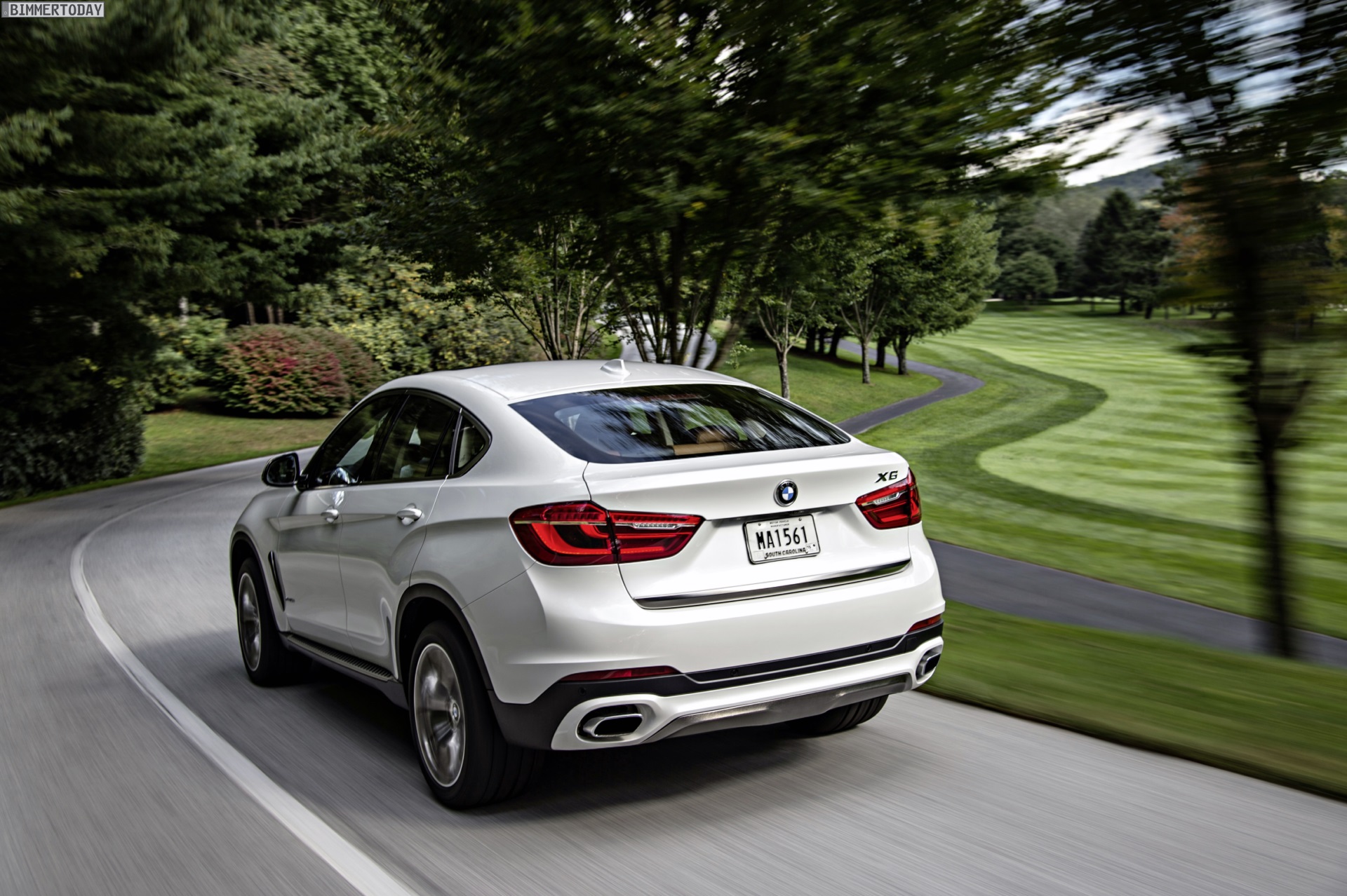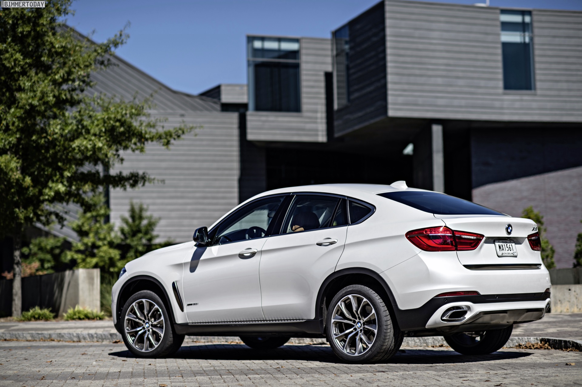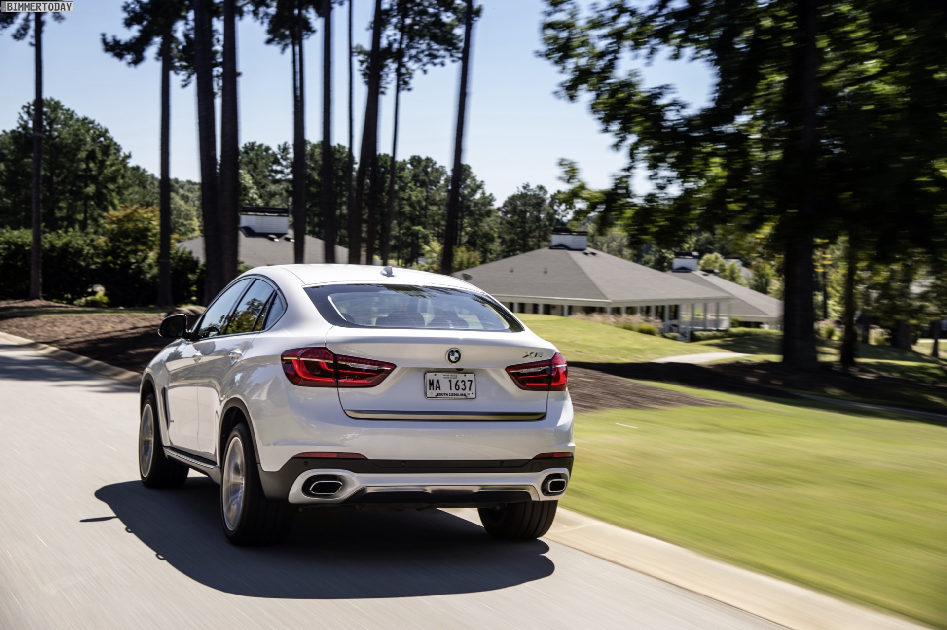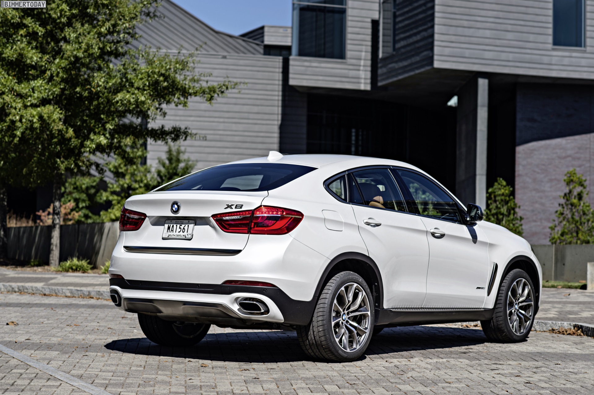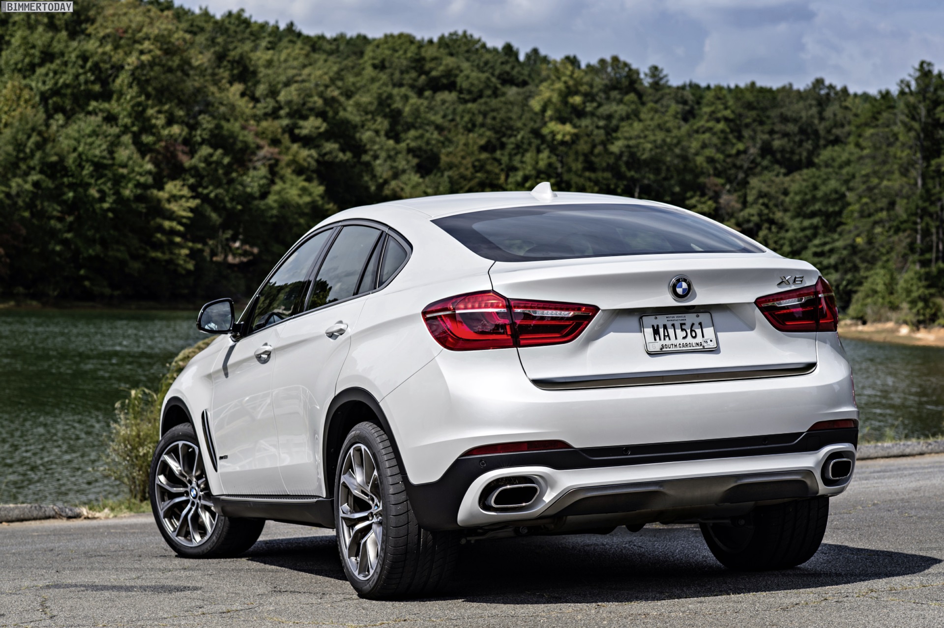 Noch mehr Eindrücke vom neuen BMW X6 F16 liefern zahlreiche zusätzliche Fotos aus Spartanburg. Im Fokus steht nun ein BMW X6 xDrive50i mit Design Pure Extravagance Paket und einer Lackierung in Mineralweiß Metallic. Die weiße Farbe sorgt zwar dafür, dass einige silberne Elemente des Ausstattungspakets in den Hintergrund rücken, betont aber die eleganten Linien der zweiten X6-Generation.