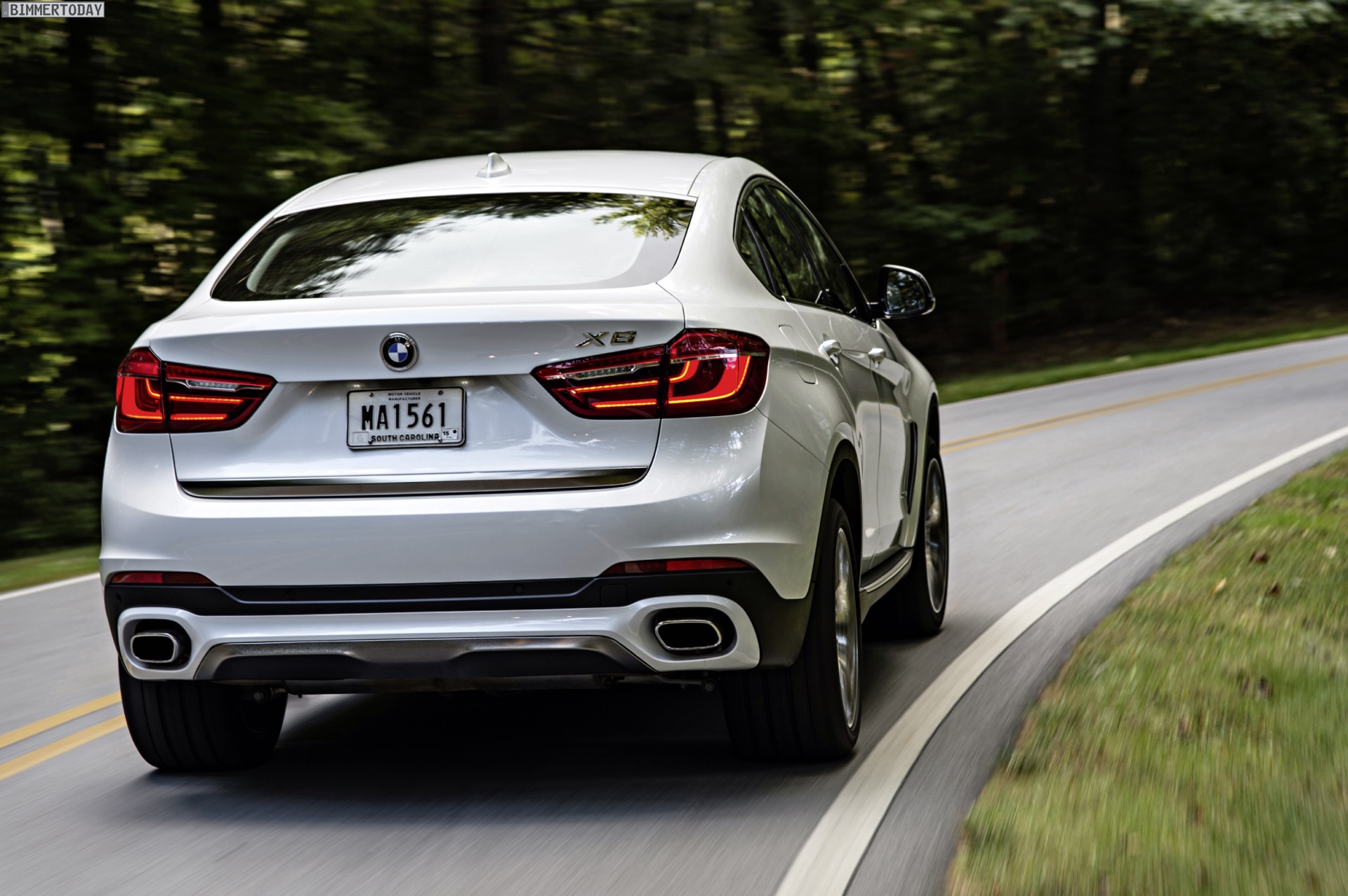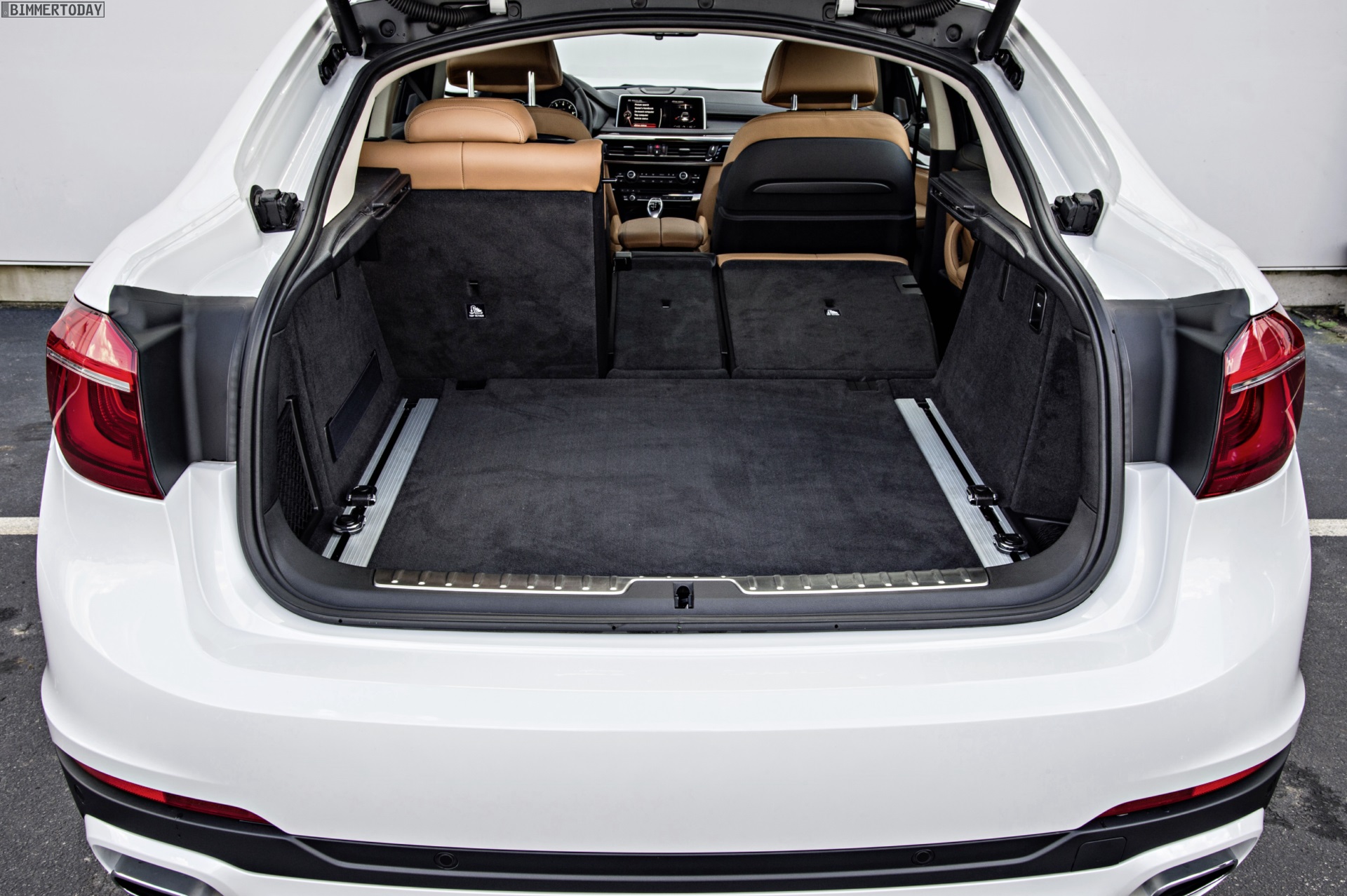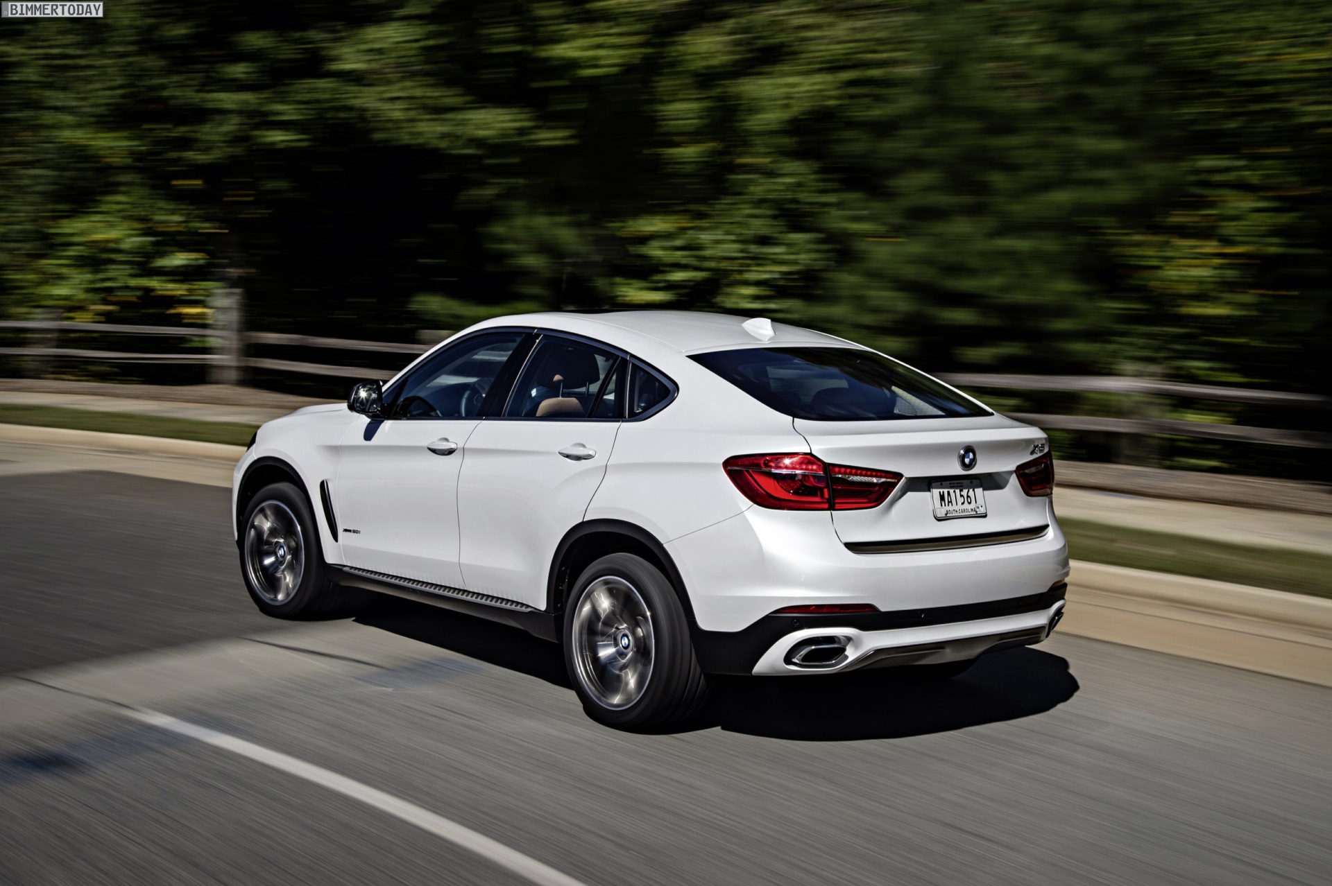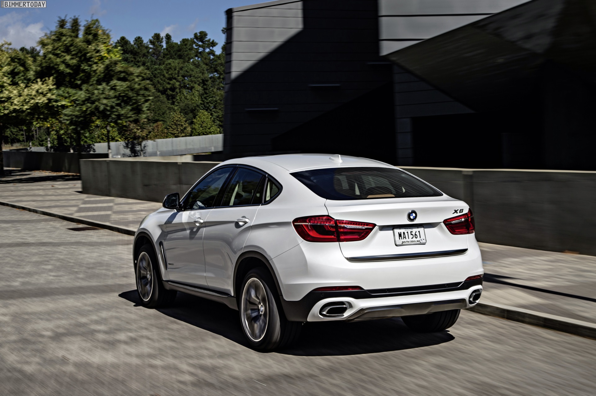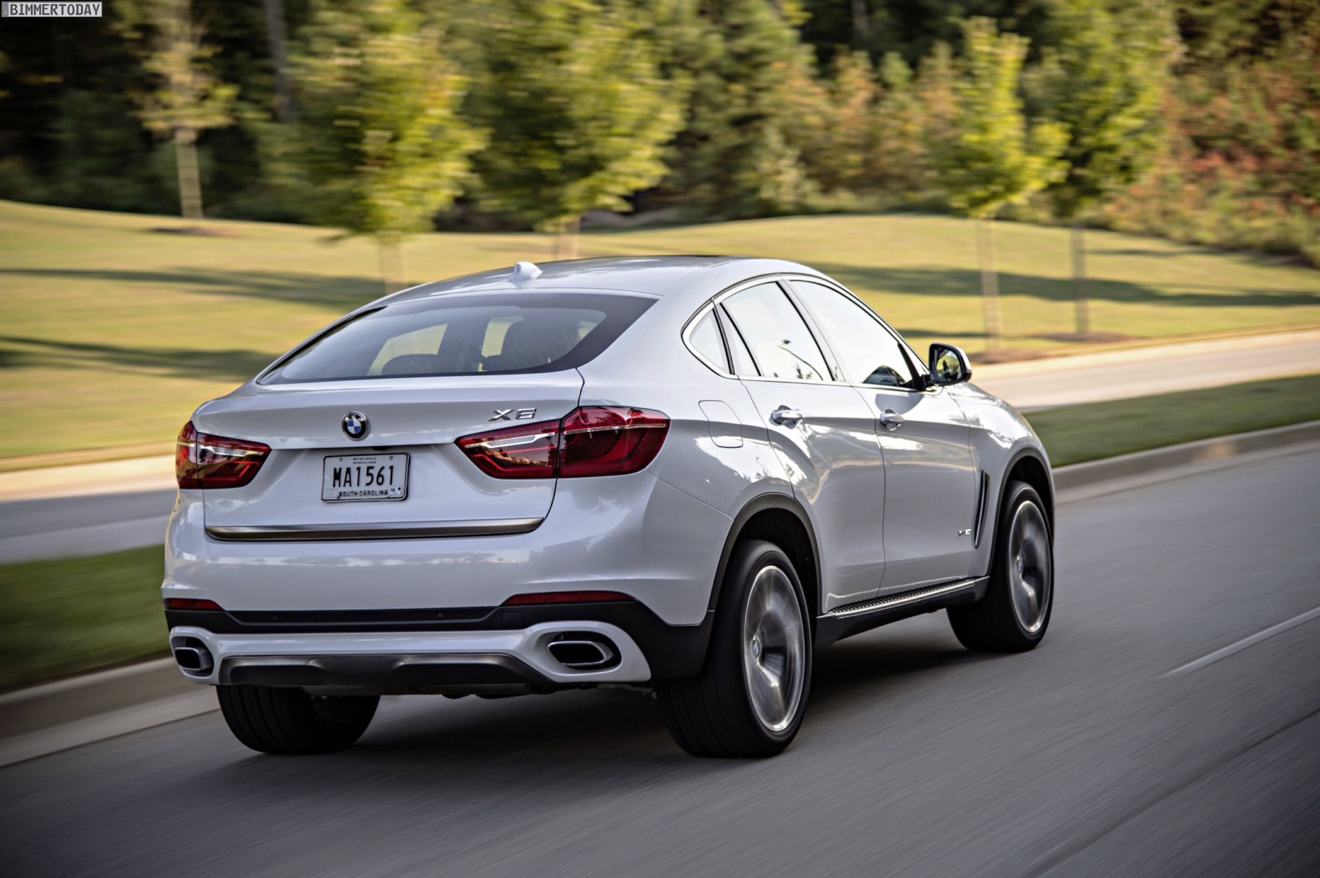 Noch mehr Eindrücke vom neuen BMW X6 F16 liefern zahlreiche zusätzliche Fotos aus Spartanburg. Im Fokus steht nun ein BMW X6 xDrive50i mit Design Pure Extravagance Paket und einer Lackierung in Mineralweiß Metallic. Die weiße Farbe sorgt zwar dafür, dass einige silberne Elemente des Ausstattungspakets in den Hintergrund rücken, betont aber die eleganten Linien der zweiten X6-Generation.
