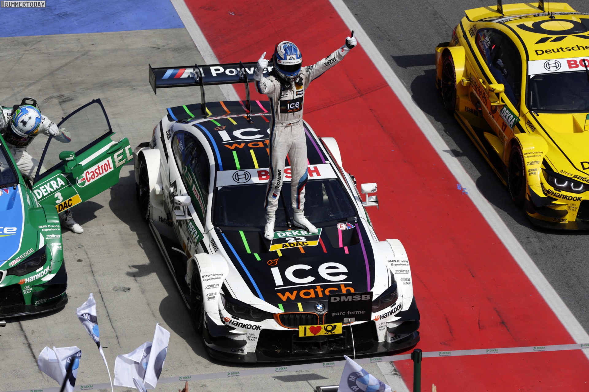Ergänzend zum serienmäßig nahezu schwarz wirkenden Carbon-Dach trägt die BMW M4 DTM Champion Edition auch eine mattschwarze Motorhaube und einen mattschwarzen Kofferraumdeckel, beide Elemente sind wie beim Einsatzfahrzeug des DTM-Champions mit den bunten Streifen von Sponsor Ice Watch verziert. Orange Einfassungen für die Nieren, schmale schwarze Dekor-Streifen und die Startnummer 23 an der Fahrzeugseite sowie eine WIT-Beklebung auf den Seitenscheiben hinter der B-Säule runden den extrovertierten Auftritt ab: