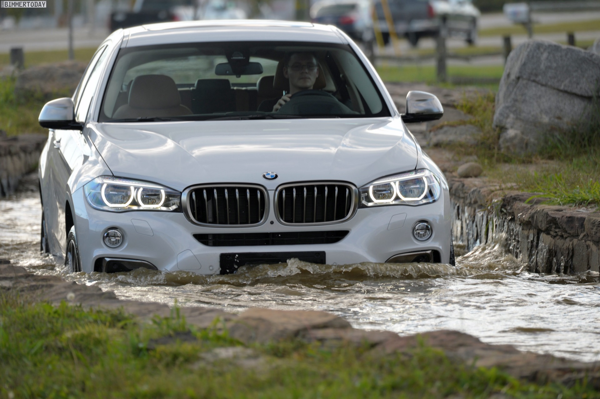 Einen halben Meter hoch darf das Wasser stehen, wenn man mit einem BMW X6 2014 unbeschadet hindurchfahren will. Schneller als 7 km/h sollte man in einem solchen Fall allerdings nicht fahren, sonst könnte man die eigene Bugwelle einholen und den Ansaugtrakt fluten. Den meisten Kunden dürften diese Zahlen zwar egal sein, aber auf unserer Testfahrt mit dem neuen BMW X6 xDrive50i wurde die Vielseitigkeit der zweiten X6-Generation auf die Probe gestellt.