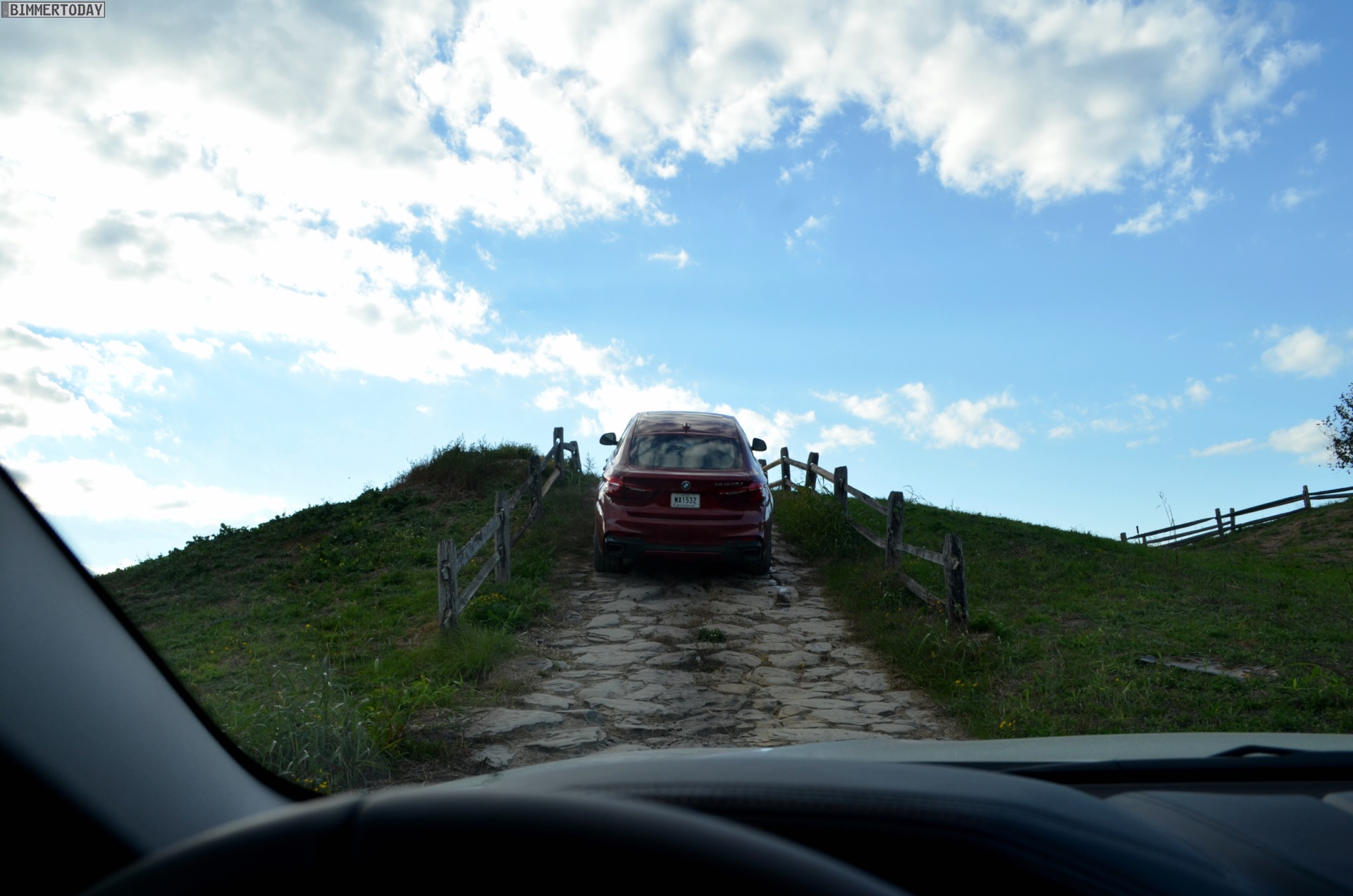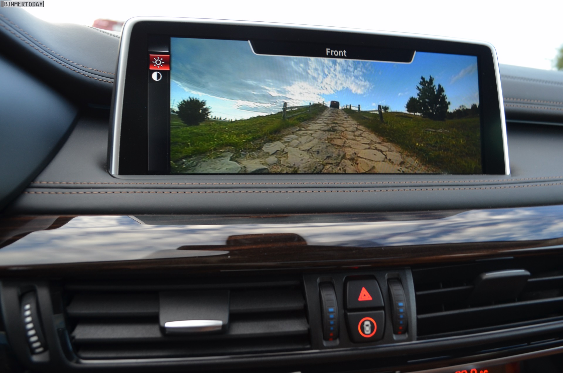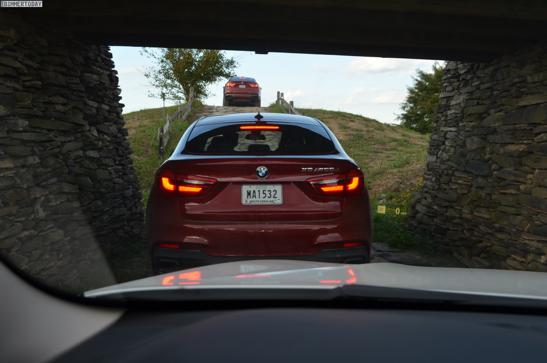 Die Wasserdurchfahrt mit Schrittgeschwindigkeit meistert der BMW X6 F16 ebenso ungerührt wie die Fahrt über steinerne Hindernis-Hügel und sandige Pisten mit tiefen Schlaglöchern. Und wer bisher dachte, dass die zwischen den Nieren platzierte Frontkamera nur beim Einparken behilflich sein kann, lernt in Spartanburg ihre wahre Bedeutung kennen – parken kann der X6 schliesslich auch ohne Hilfe des Fahrers. Fährt man allerdings einen wirklich steilen Hügel hinauf und sieht beim Blick durch die Windschutzscheibe nichts als blauen Himmel und ein paar Wolken, bietet die Frontkamera eine tatsächlich äußerst hilfreiche Alternativ-Perspektive, denn ihre Sicht wird im Gegensatz zu der des Fahrers nicht von der Motorhaube verdeckt.