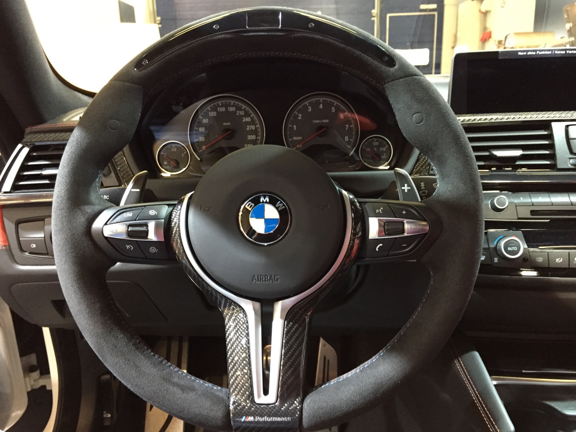 Im Innenraum trägt der gezeigte BMW M4 F82 das M Performance Sportlenkrad mit Alcantara-Bezug und LED-Display im Lenkradkranz, Carbon-Interieurleisten und natürlich die von vielen Kunden nicht nur aus optischen Gründen geschätzte Aluminium-Pedalerie:
