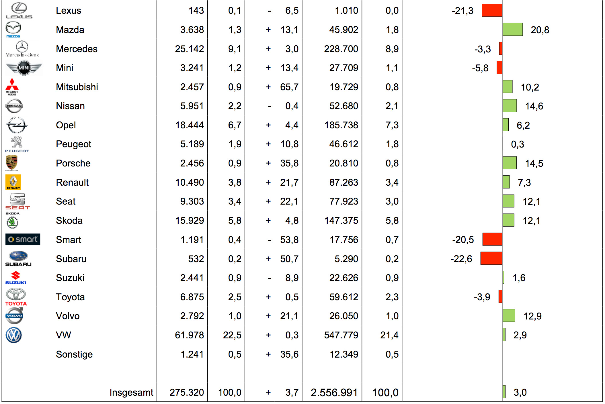 Für die ersten zehn Monate 2014 kommt die BMW Group auf einen Absatz von 226.304 Einheiten. Audi wuchs um 3,5 Prozent auf 220.979 Einheiten und liegt damit nur knapp unter den Verkaufszahlen von BMW und MINI zusammen. Mercedes (228.700 /-3,3%) und Smart (17.756 / -20,5%) liegen mit zusammen 245.456 verkauften Fahrzeugen an der Spitze.